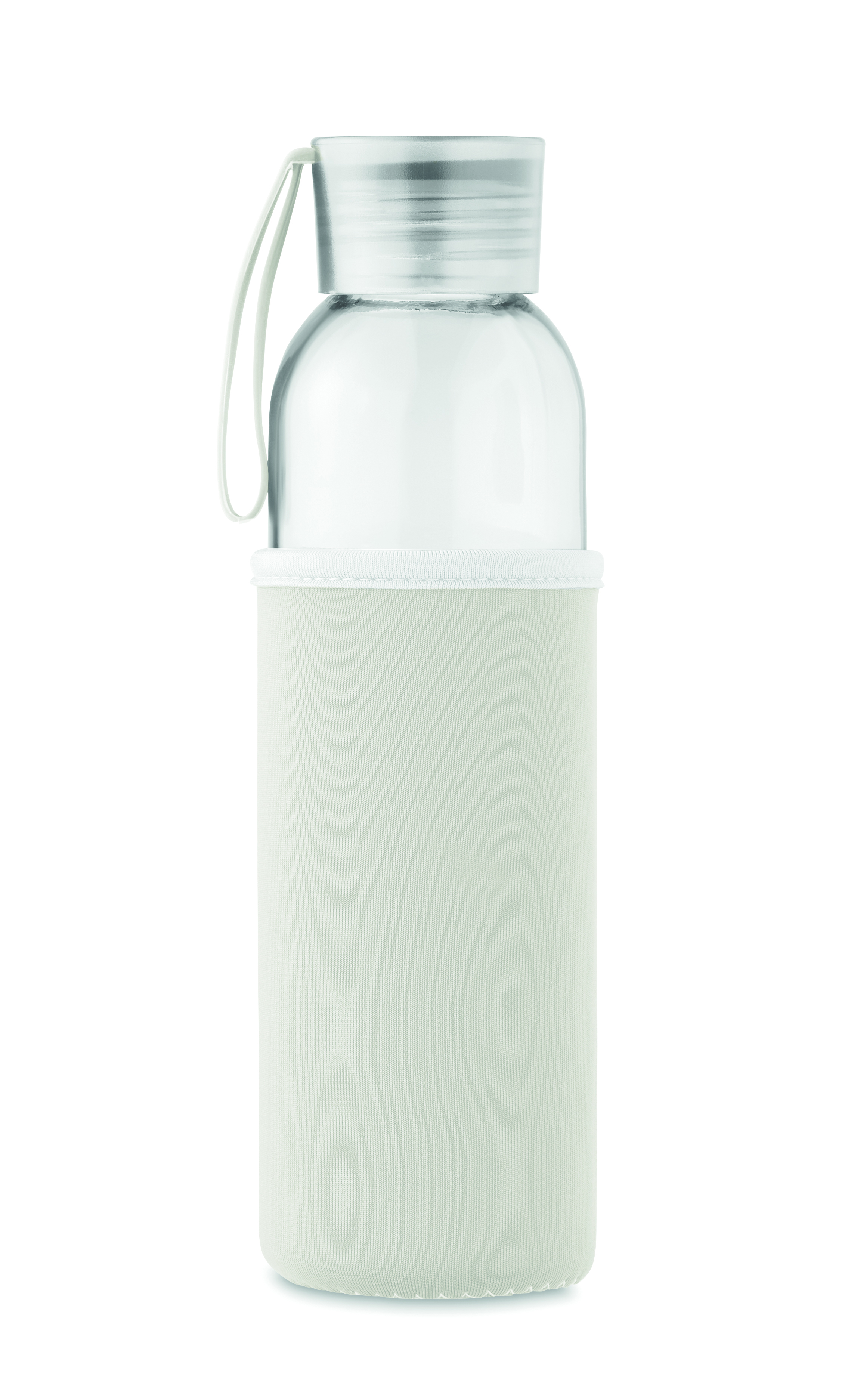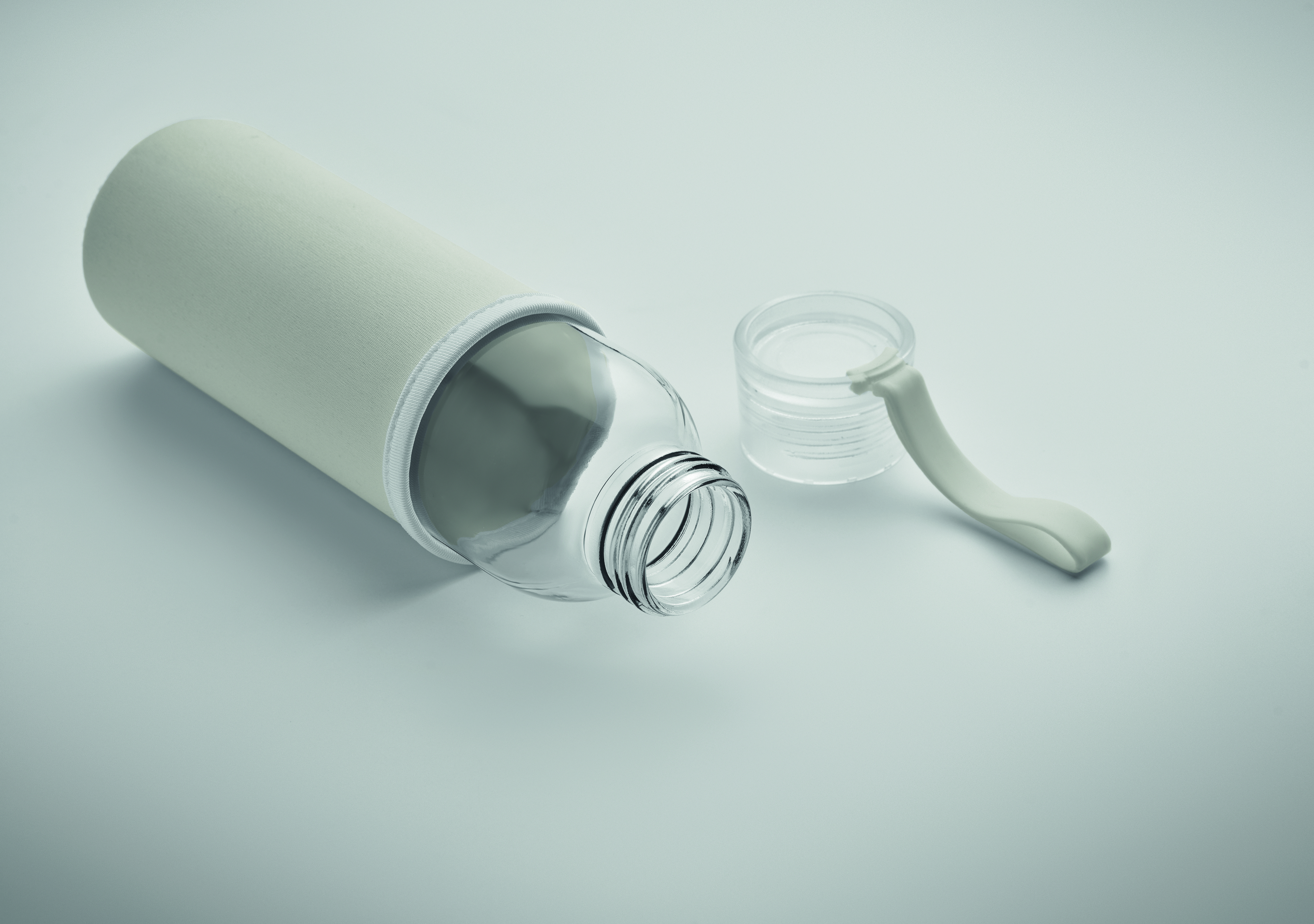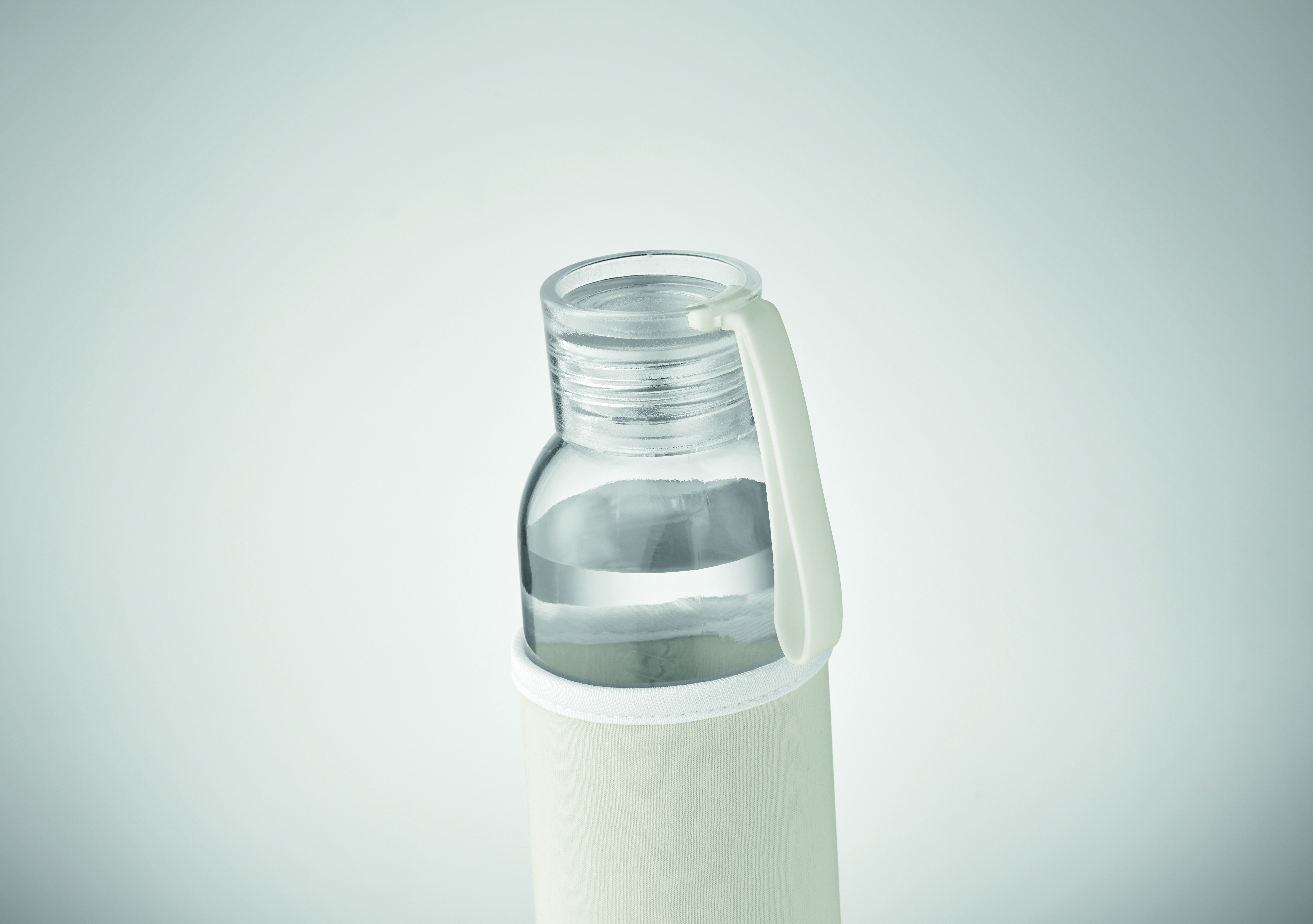 Szklana butelka z recyklingu z neoprenowym etui, z zakrętką z PP i z silikonową zwieszką. Szczelna. Pojemność: 500 ml.