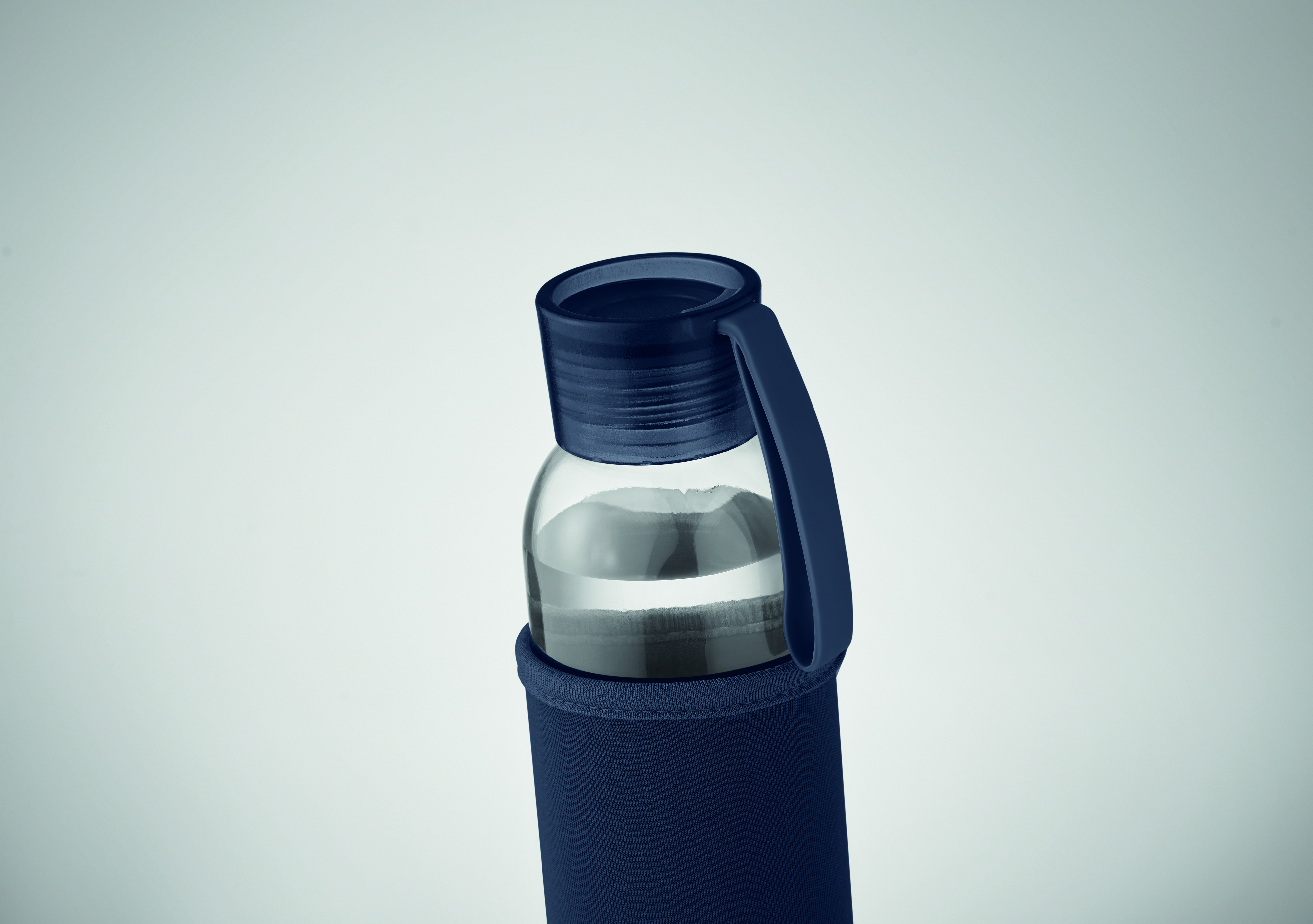 Szklana butelka z recyklingu z neoprenowym etui, z zakrętką z PP i z silikonową zwieszką. Szczelna. Pojemność: 500 ml.