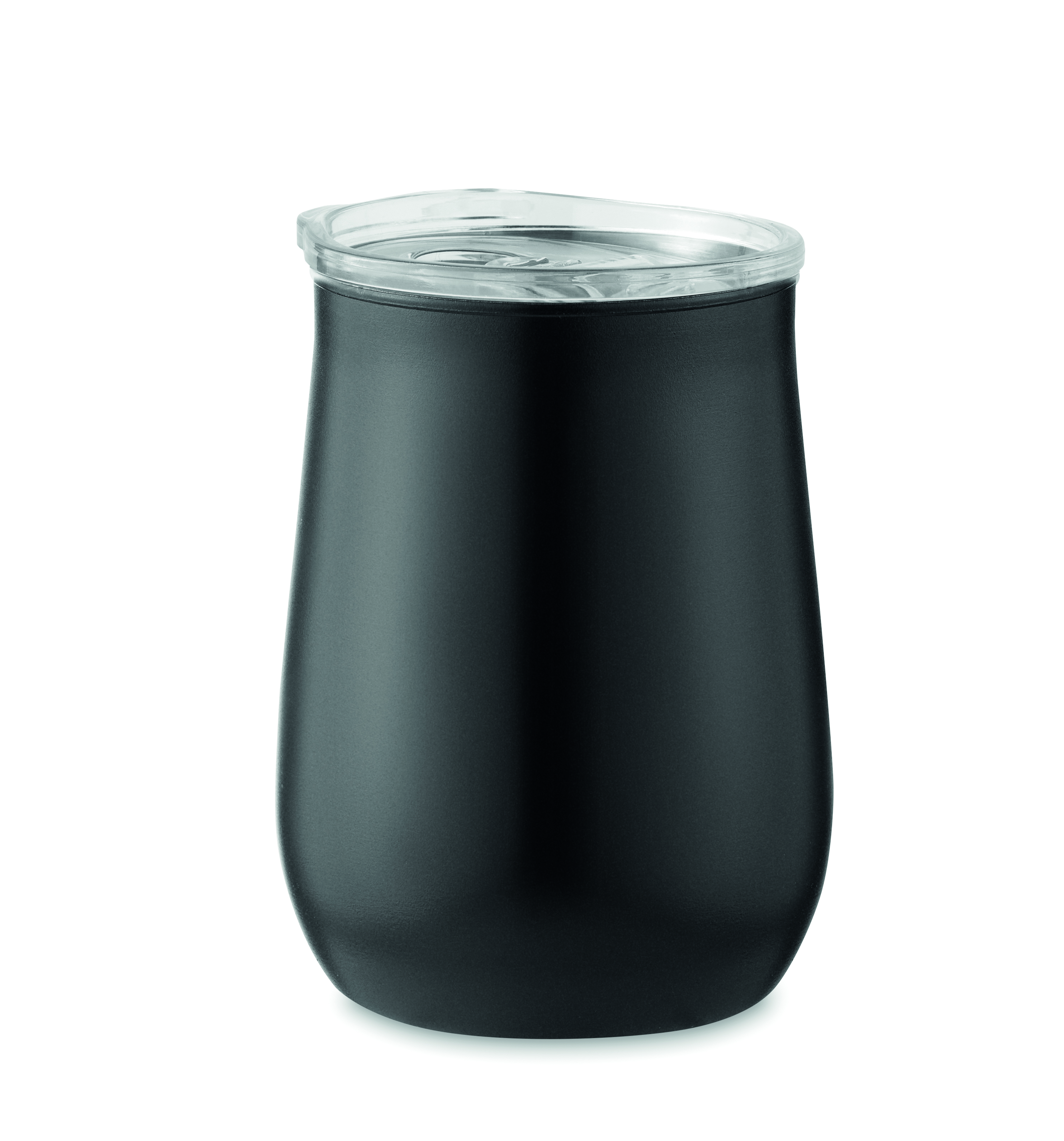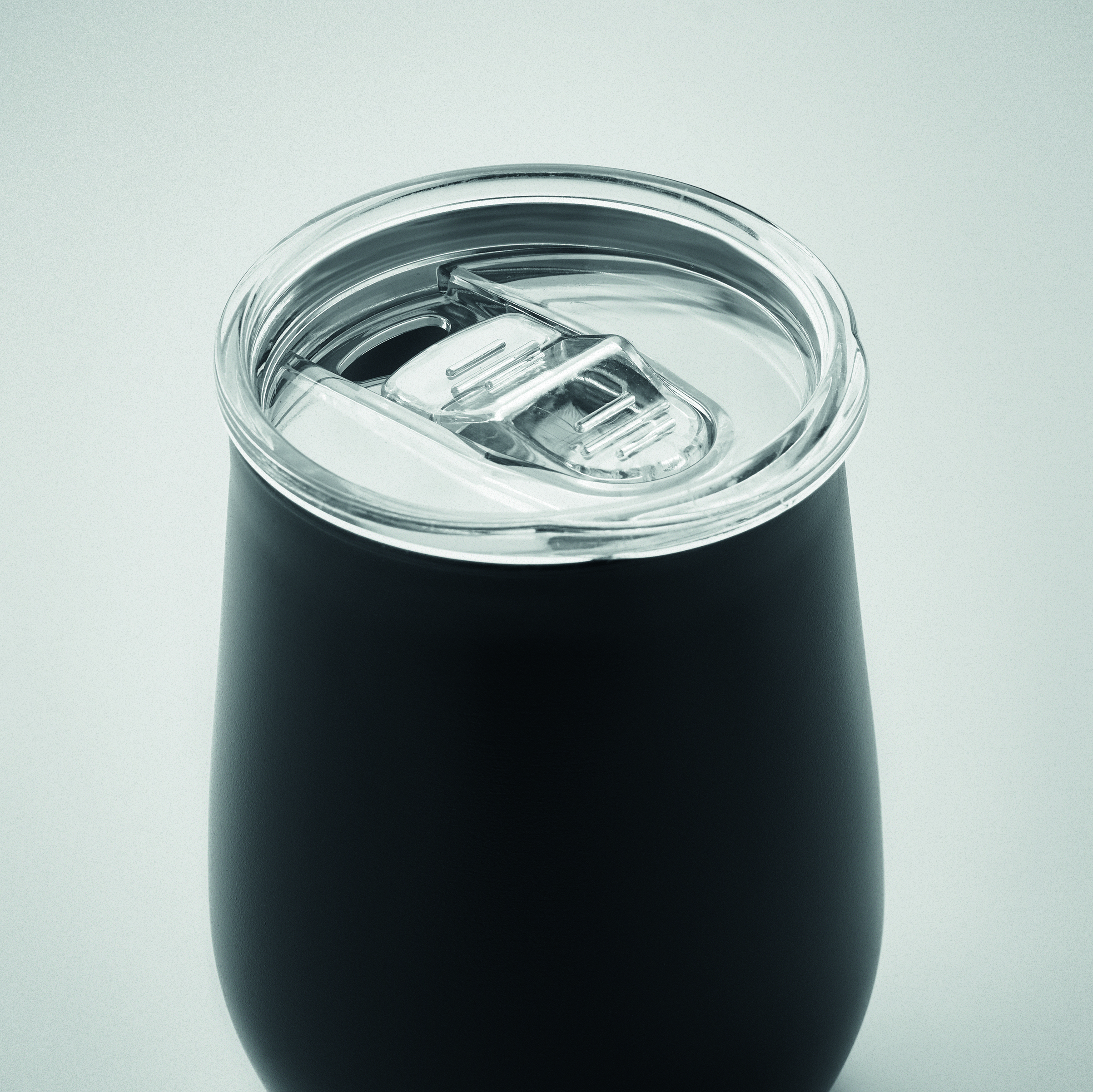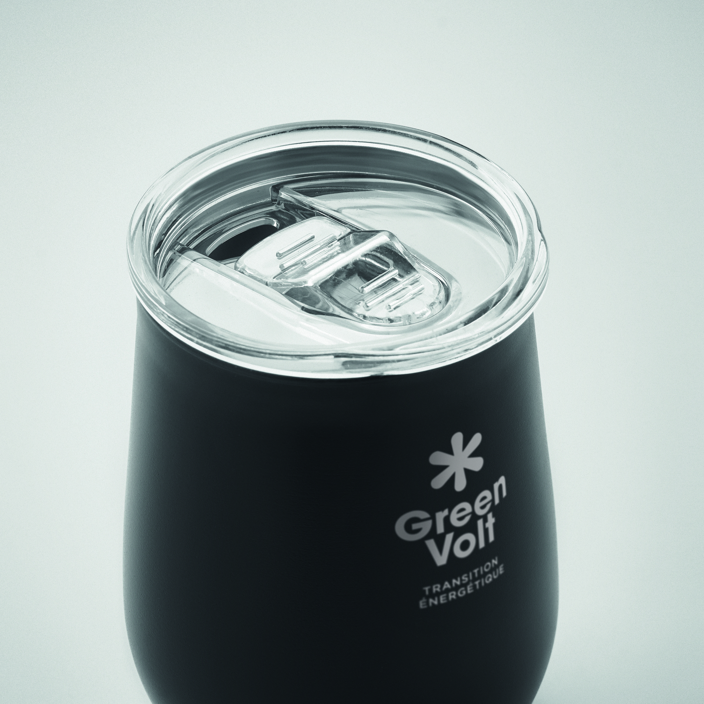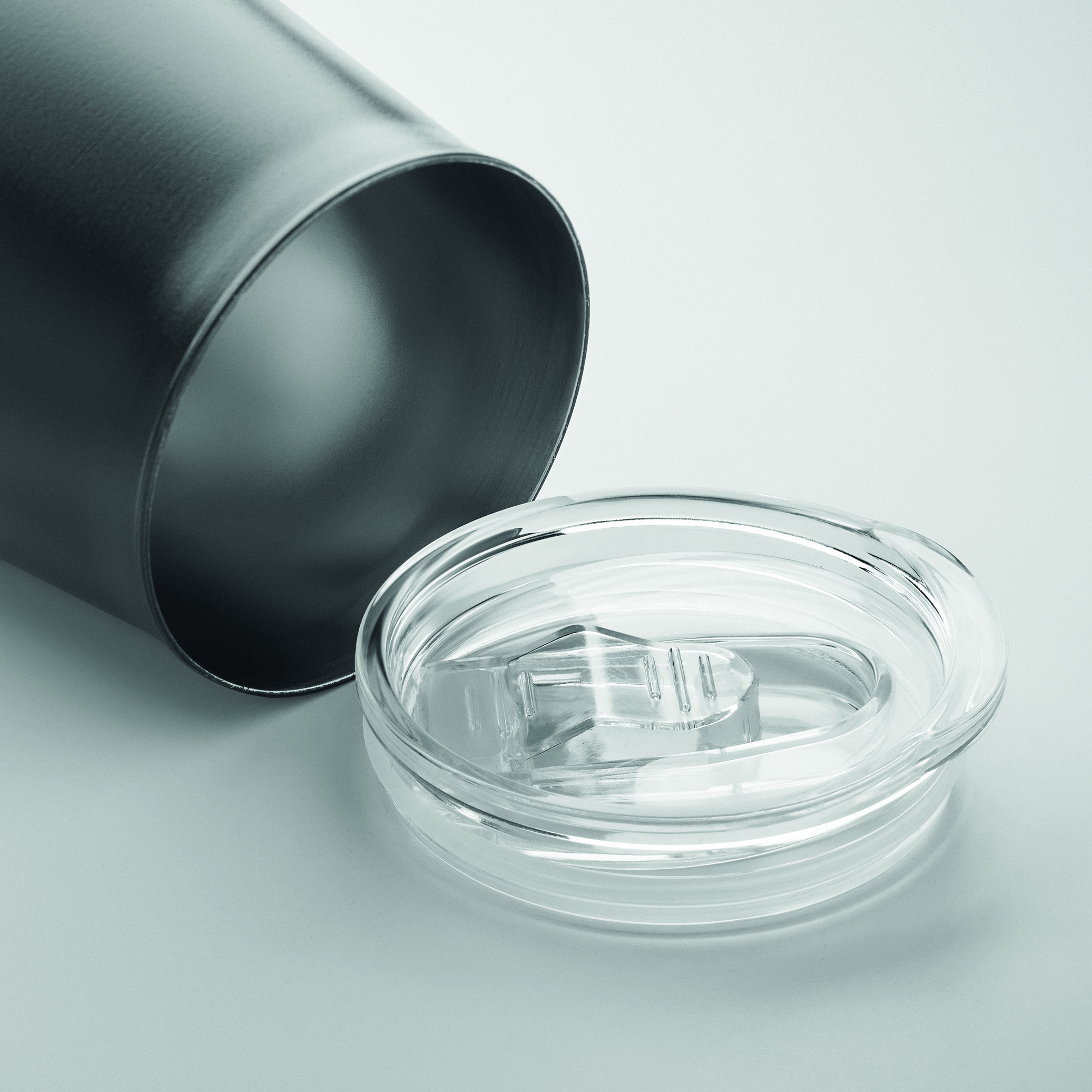 Kubek ze stali nierdzewnej z recyklingu (90% recyklingowanej stali nierdzewnej i 10% stali nierdzewnej) malowany proszkowo z pokrywką z zasuwanym otworem do picia. Pojemność: 500 ml. Kubek jest jednowarstwowy, nagrzewa się z zewnątrz.