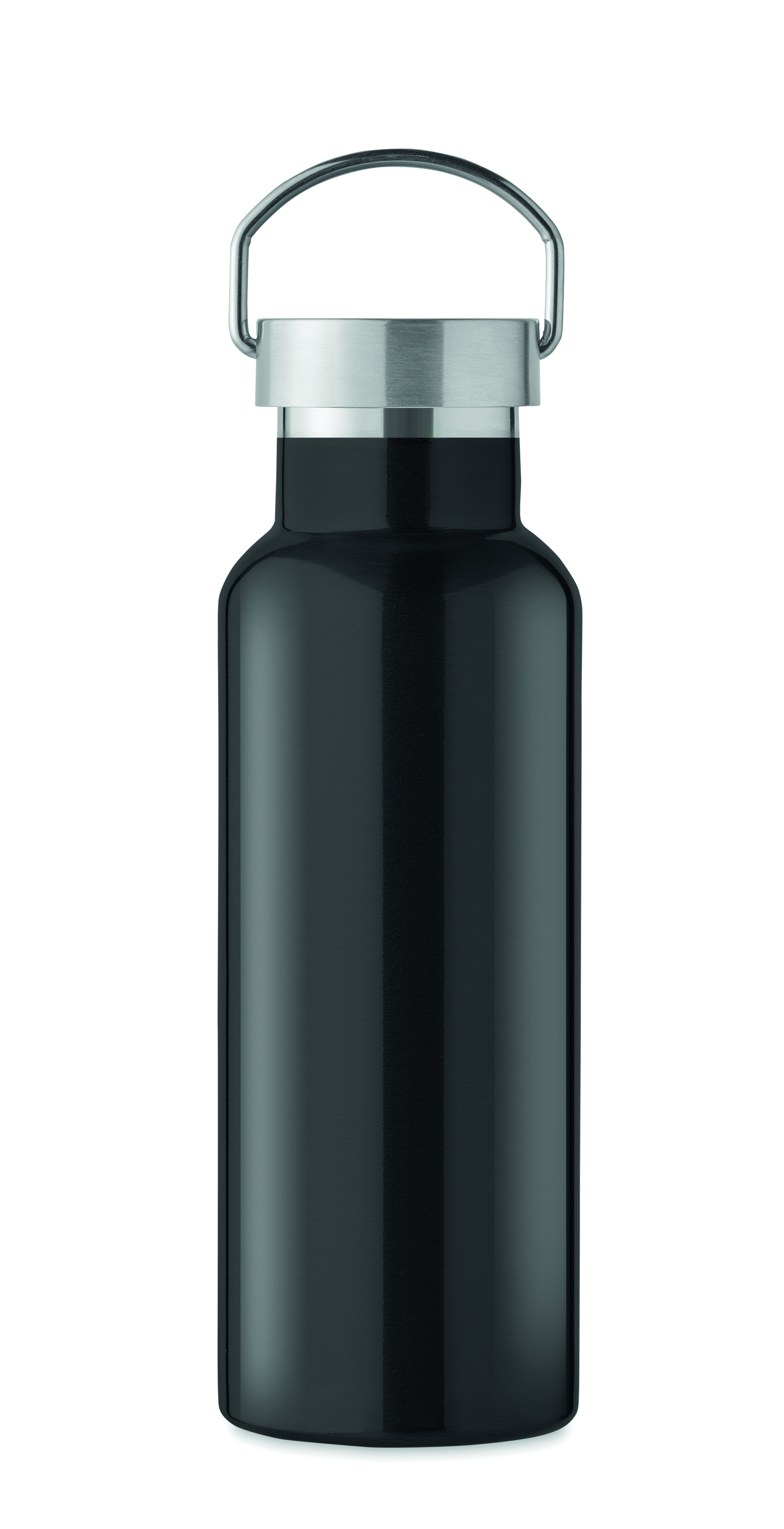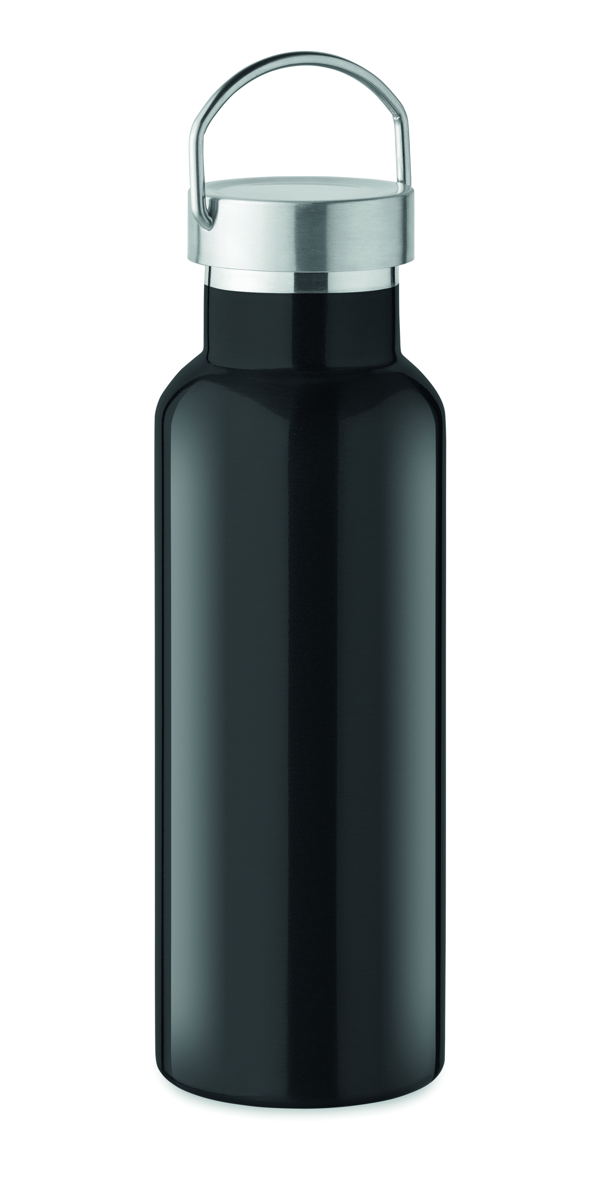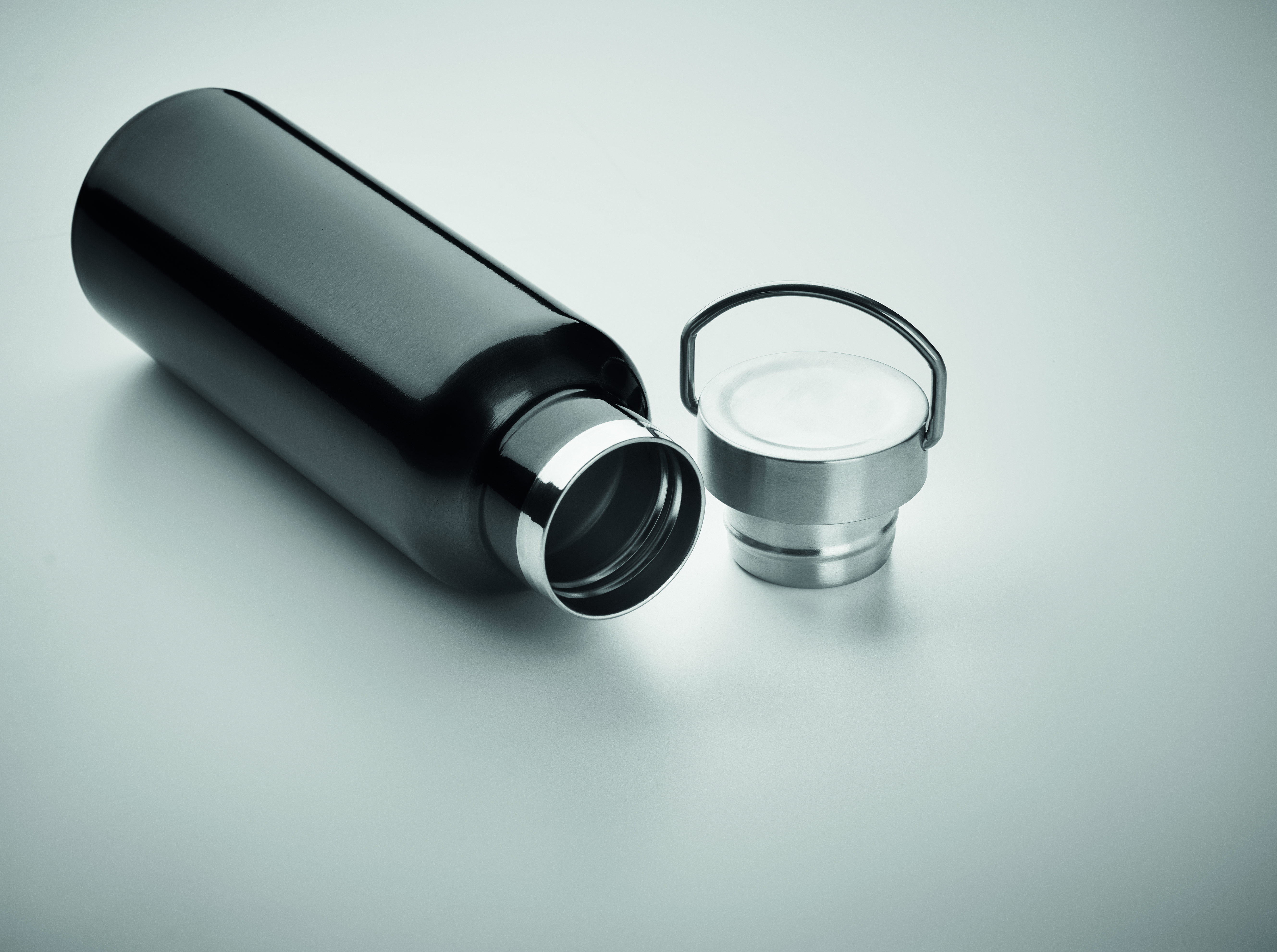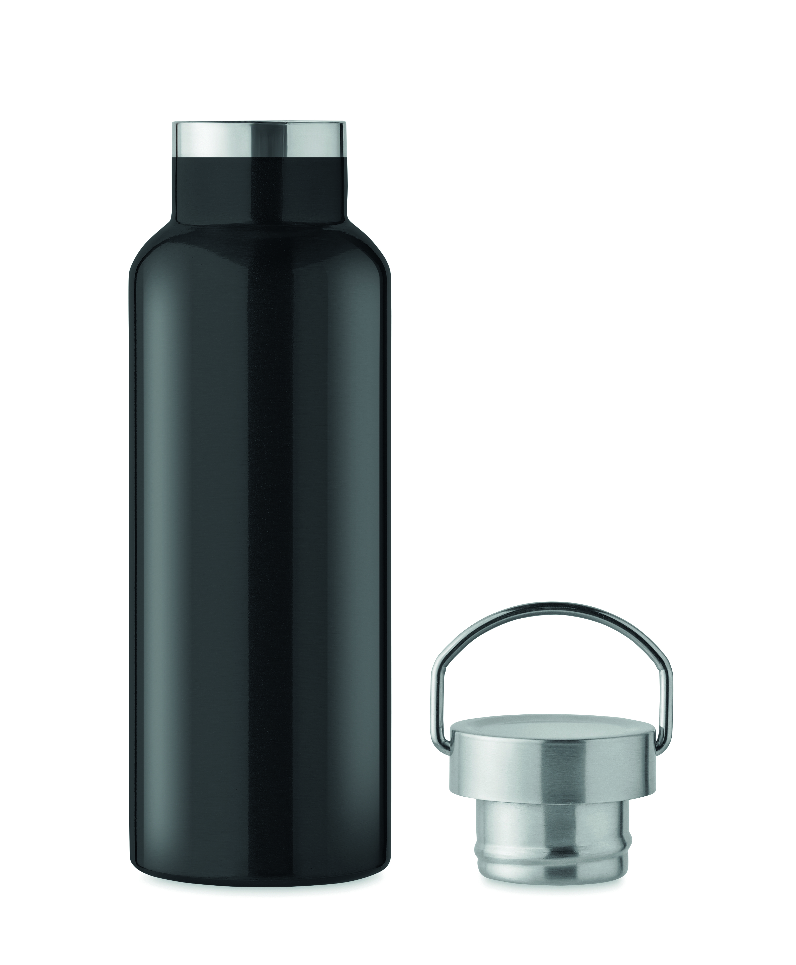Dwuścienna, izolowana próżniowo butelka ze stali nierdzewnej z recyklingu (90% recyklingowanej stali nierdzewnej i 10% stali nierdzewnej) z zakrętką z uchwytem. Pojemność: 500 ml.