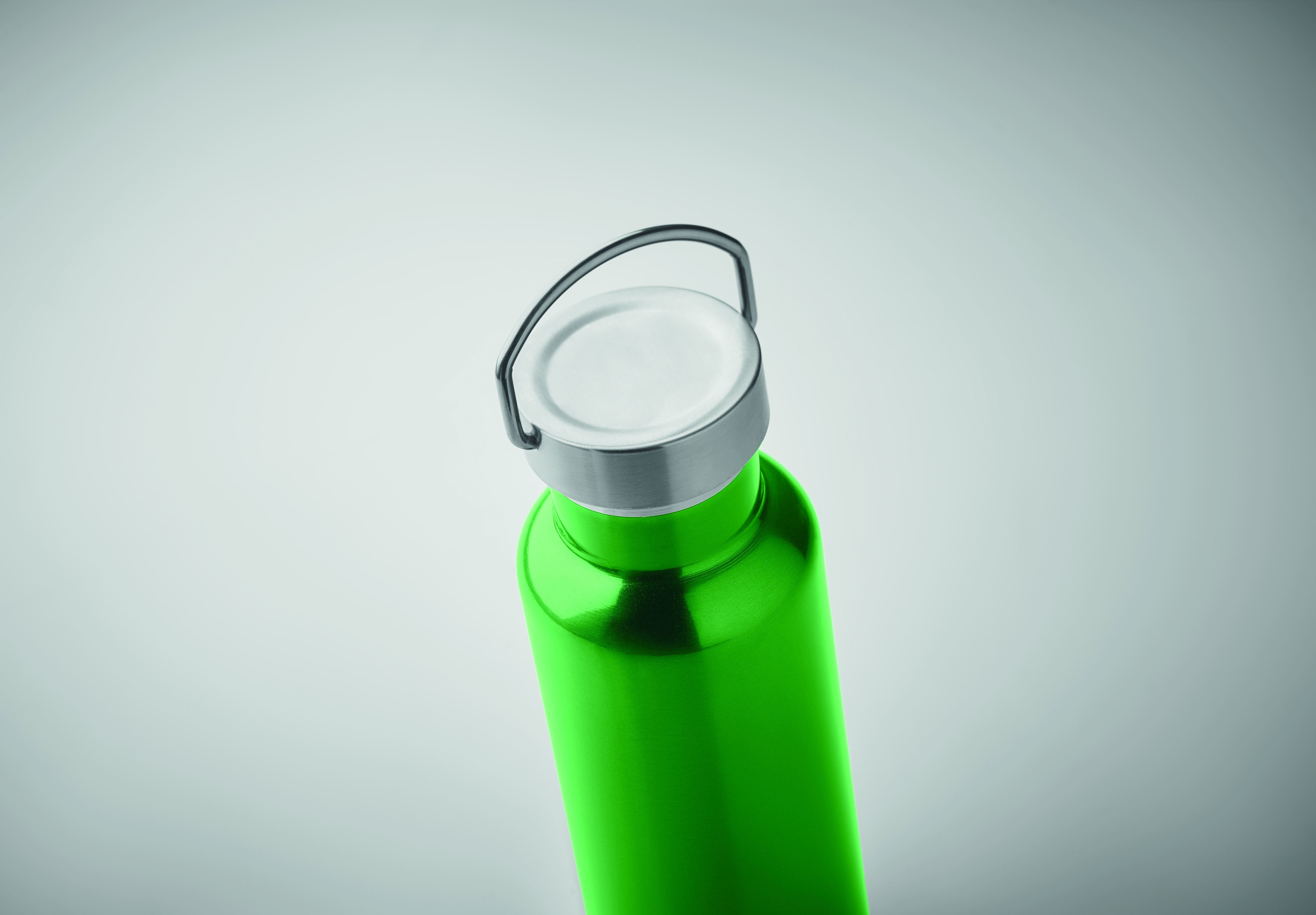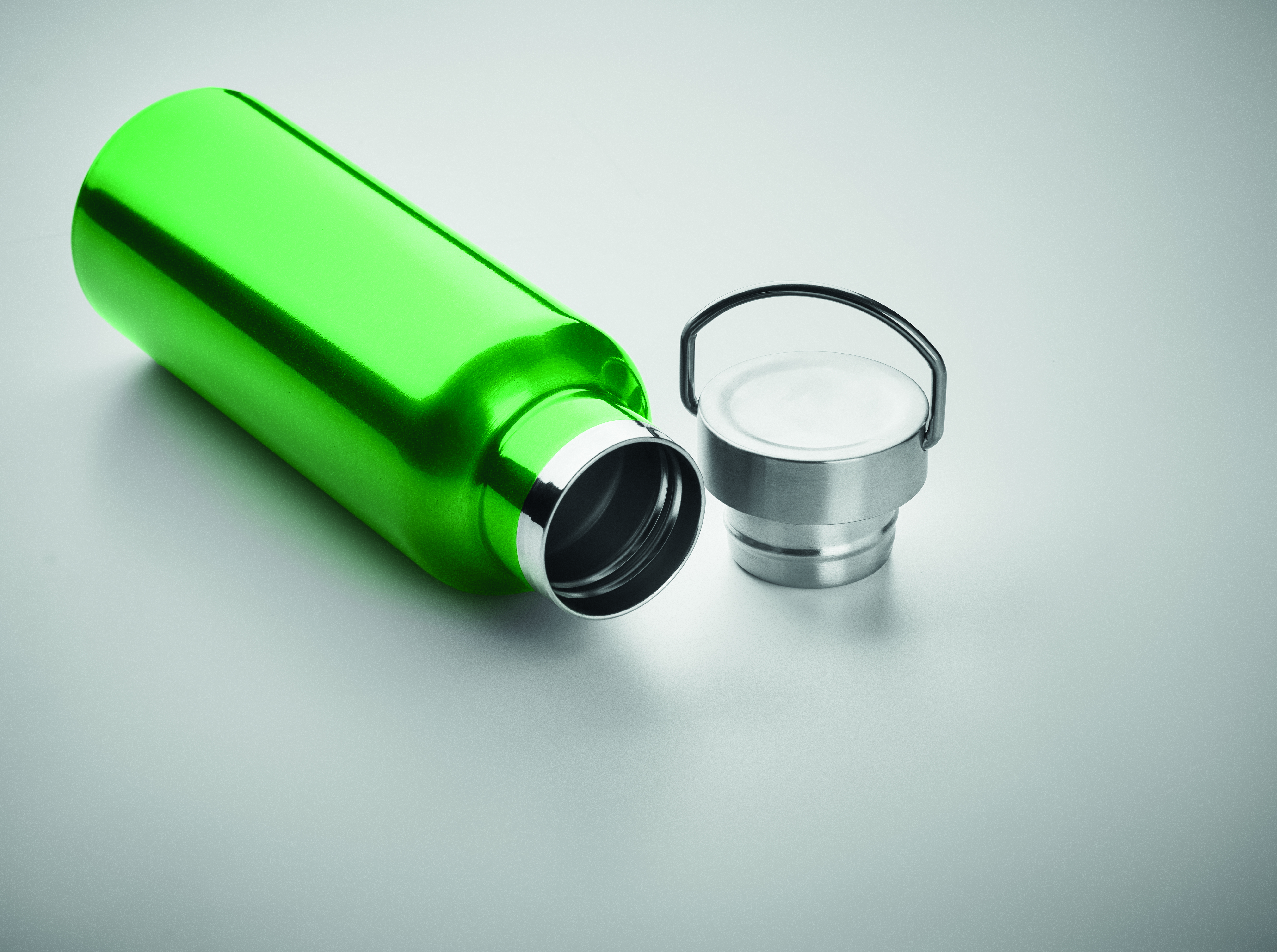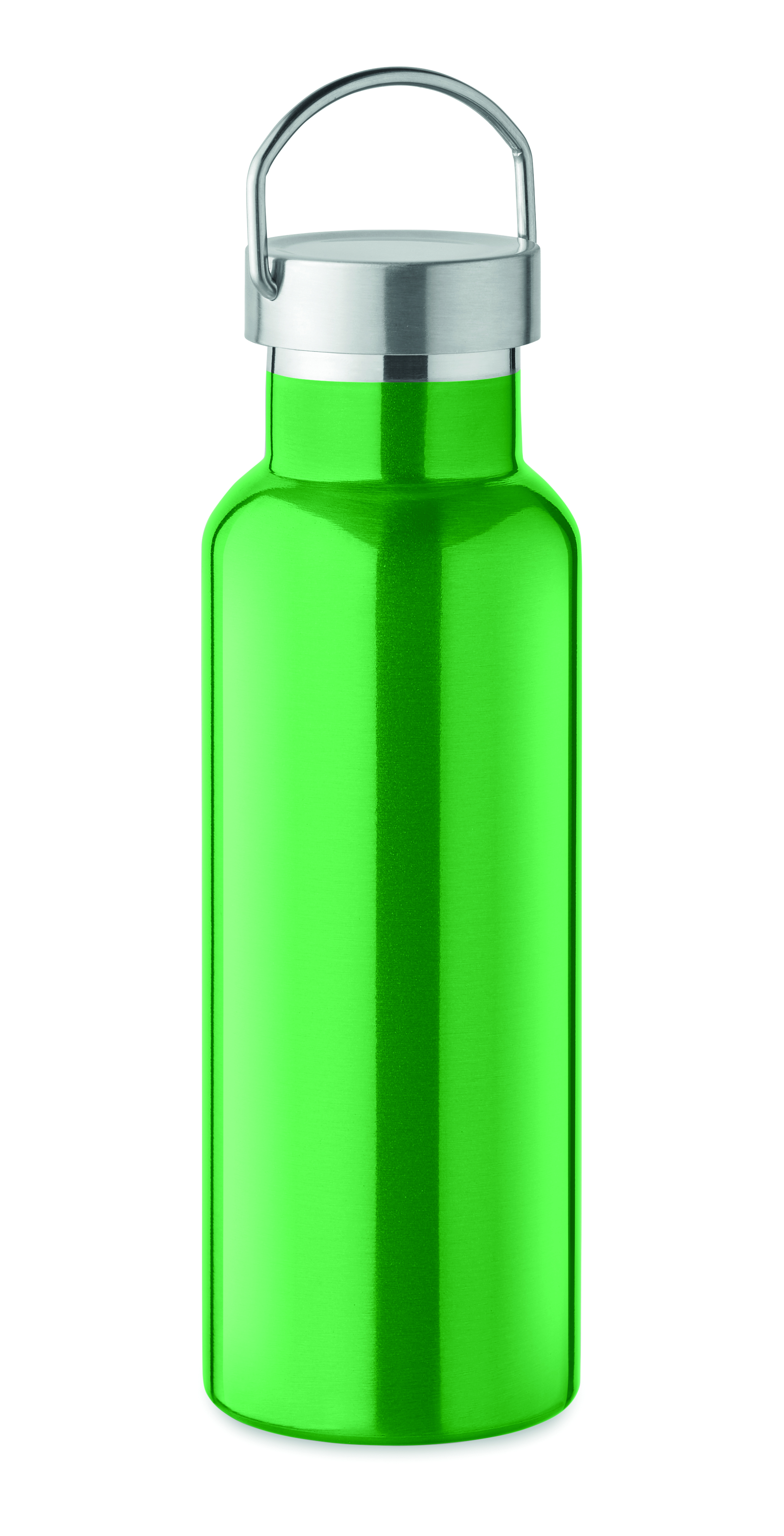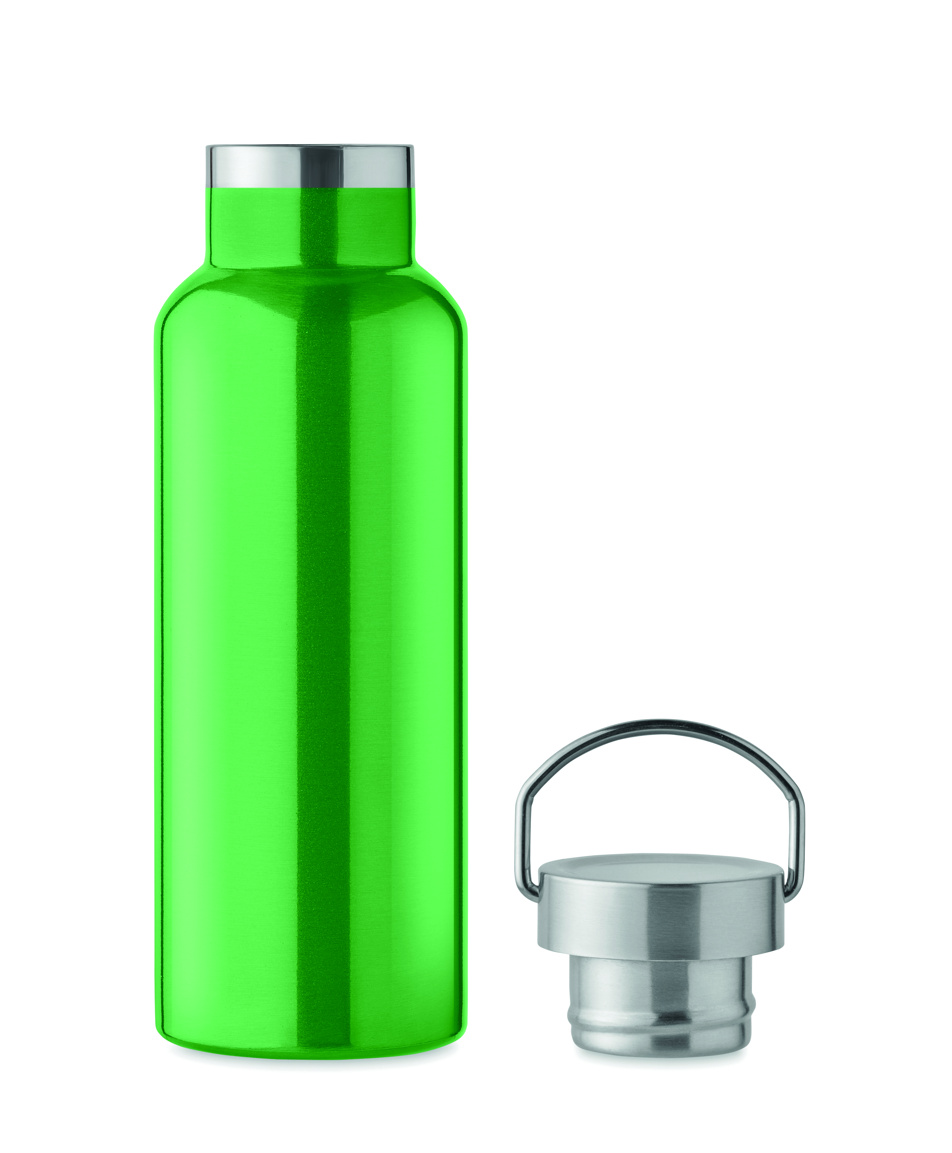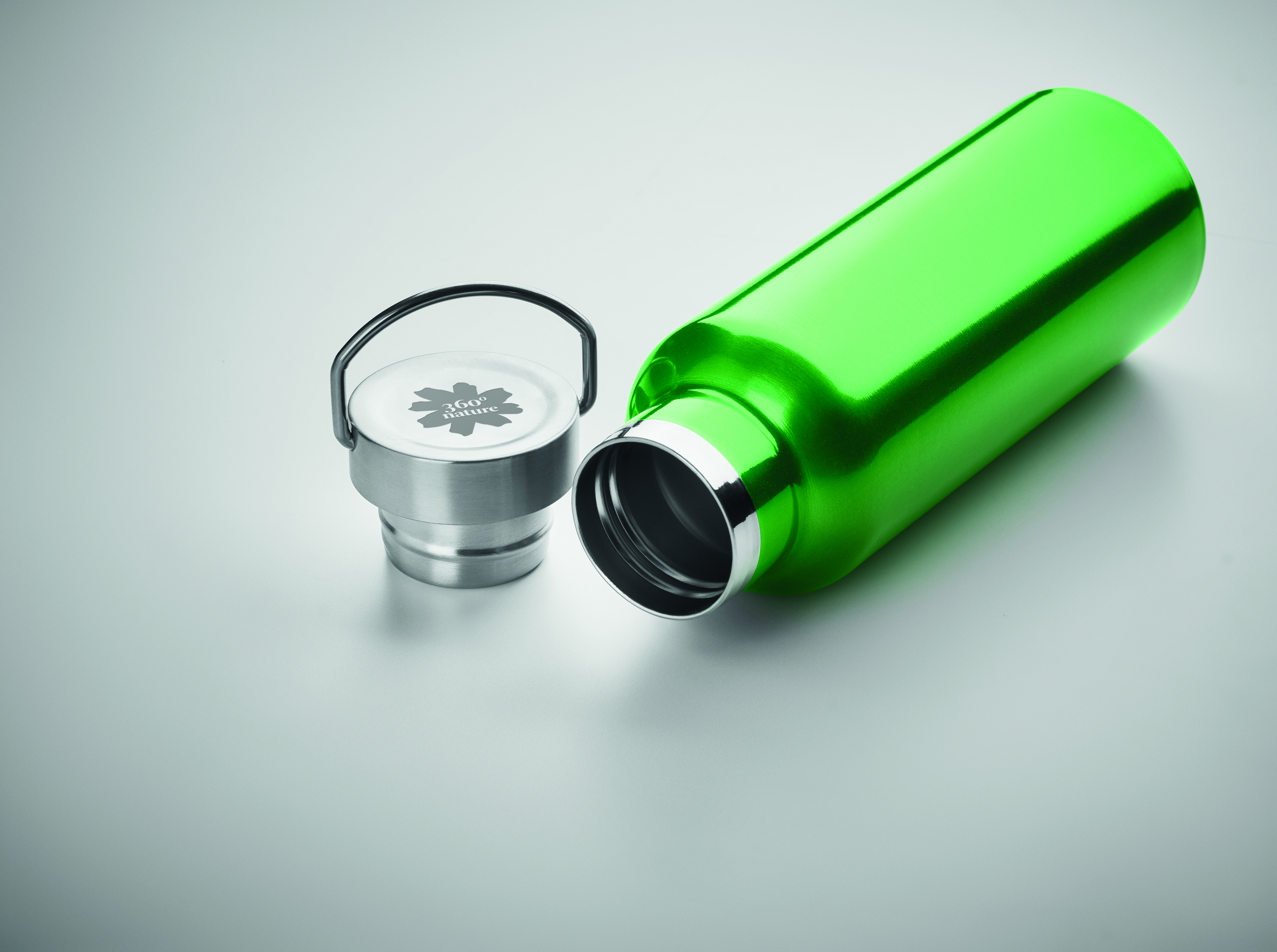 Dwuścienna, izolowana próżniowo butelka ze stali nierdzewnej z recyklingu (90% recyklingowanej stali nierdzewnej i 10% stali nierdzewnej) z zakrętką z uchwytem. Pojemność: 500 ml.
