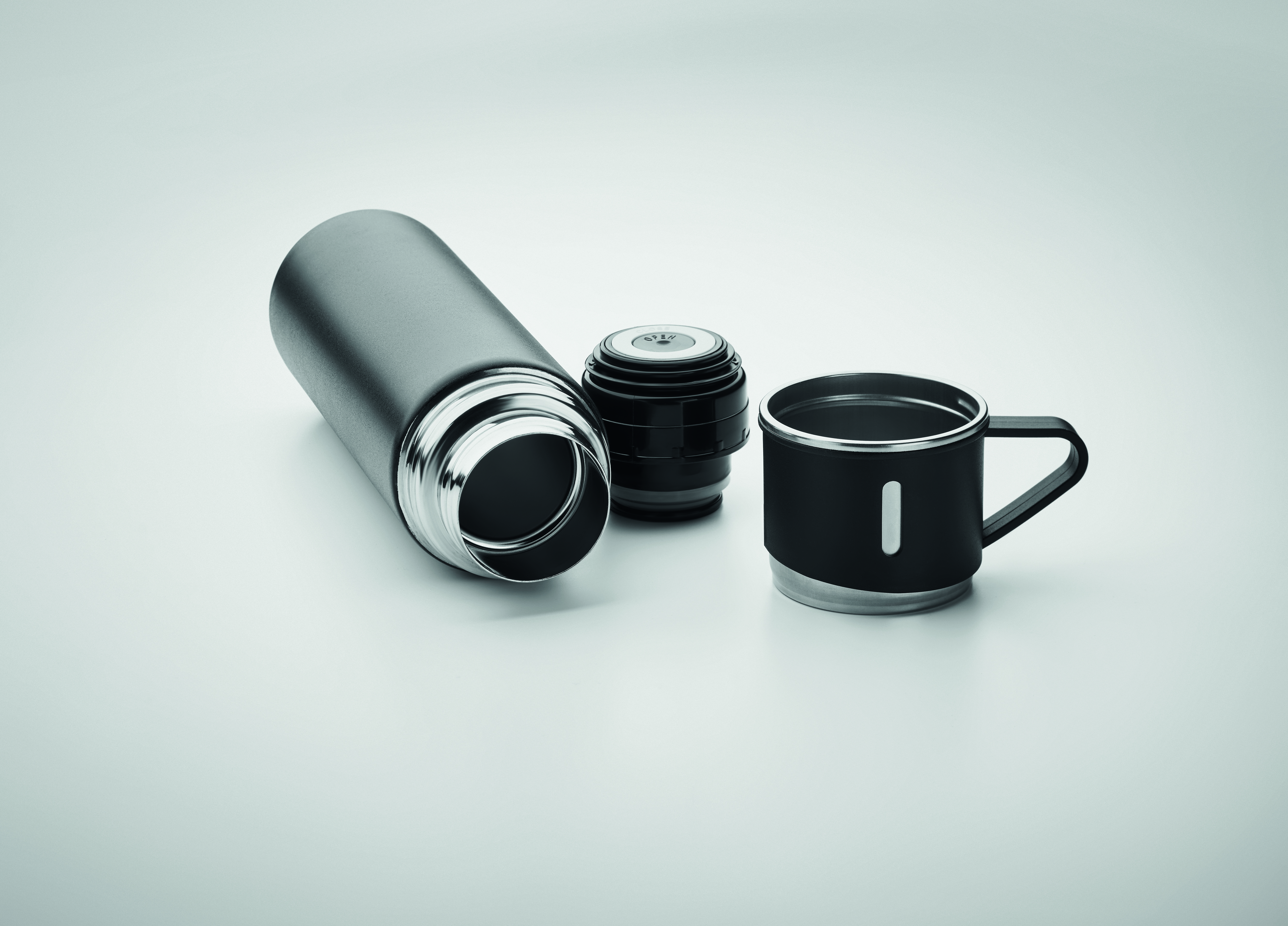 Zestaw z termosem o podwójnych ściankach izolowanych próżniowo ze stali nierdzewnej, ze szczelną zakrętką i 2 dodatkowymi kubkami. Pojemność: termos - 420 ml, kubek - 150 ml.