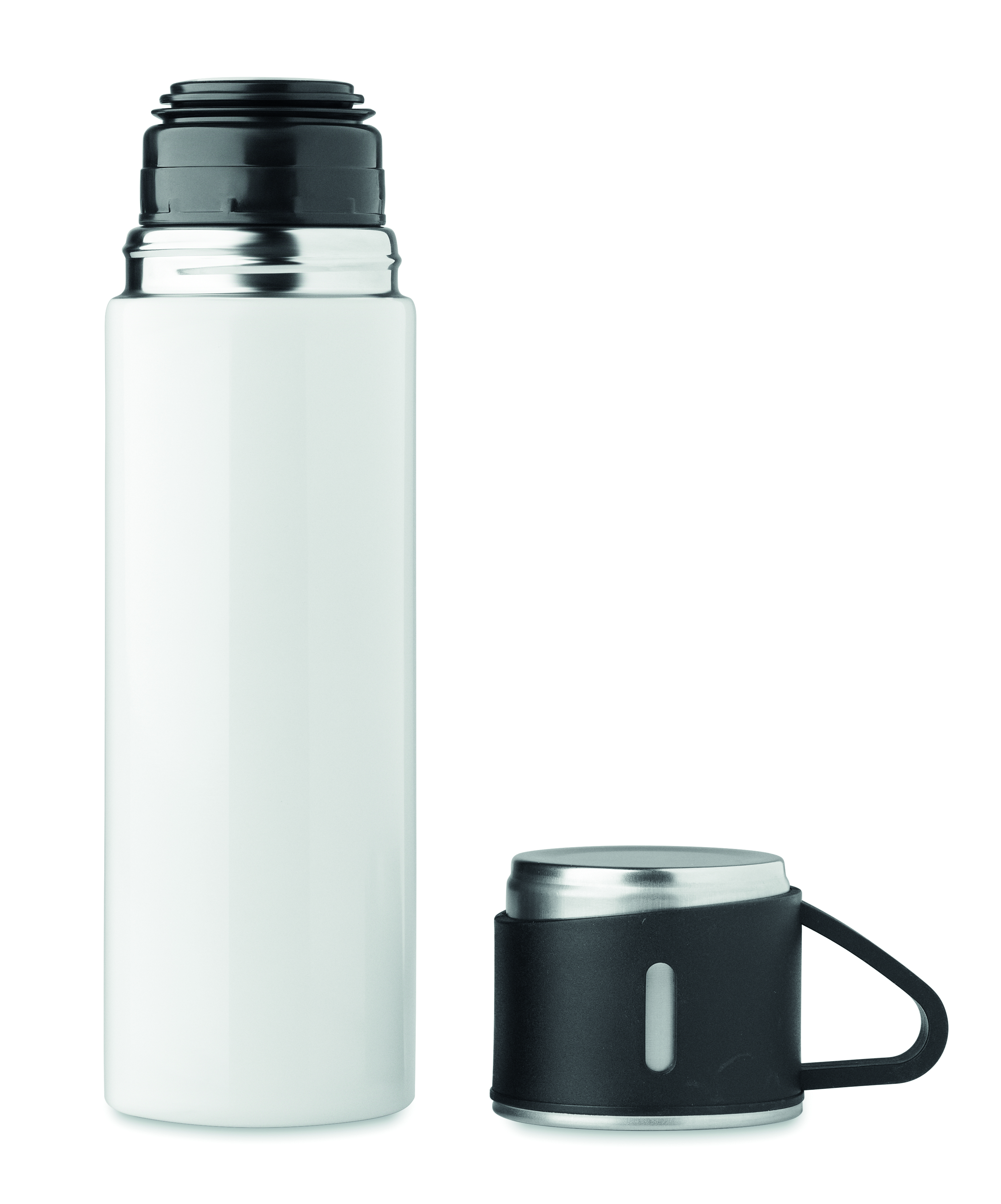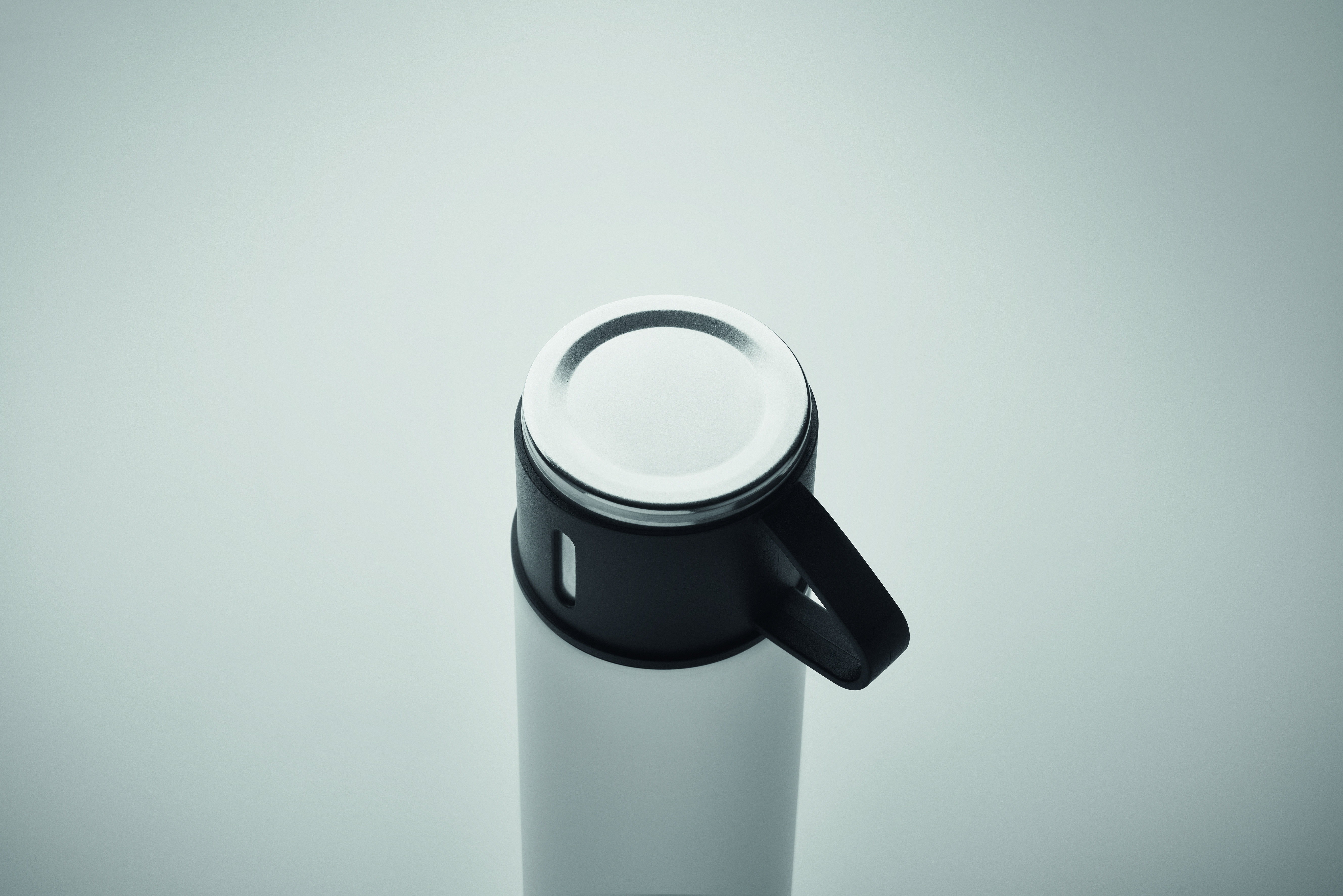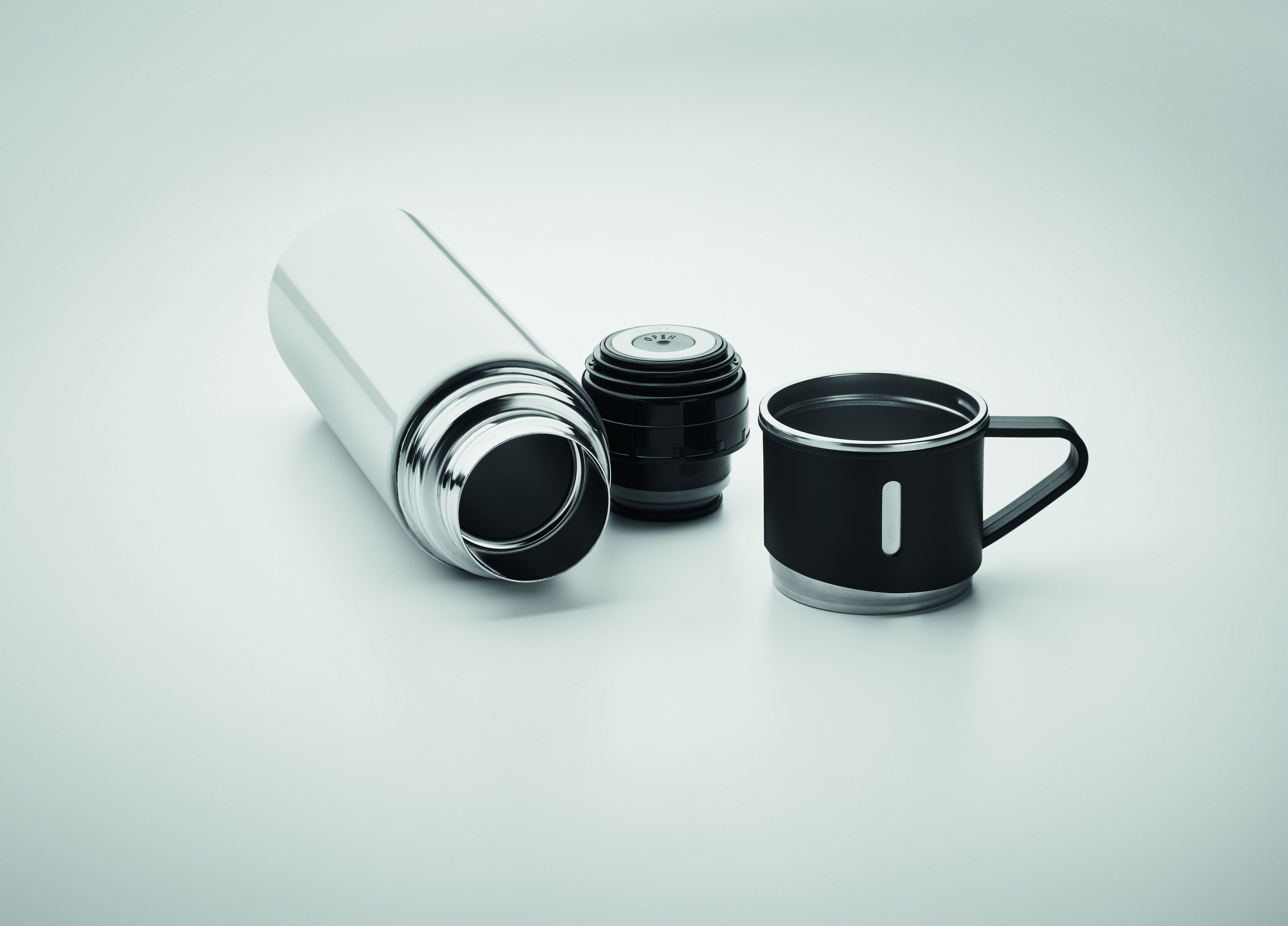 Dwuścienny termos ze stali nierdzewnej ze szczelną zakrętką i kubkiem. Pojemność: termos 420 ml, kubek 150 ml.