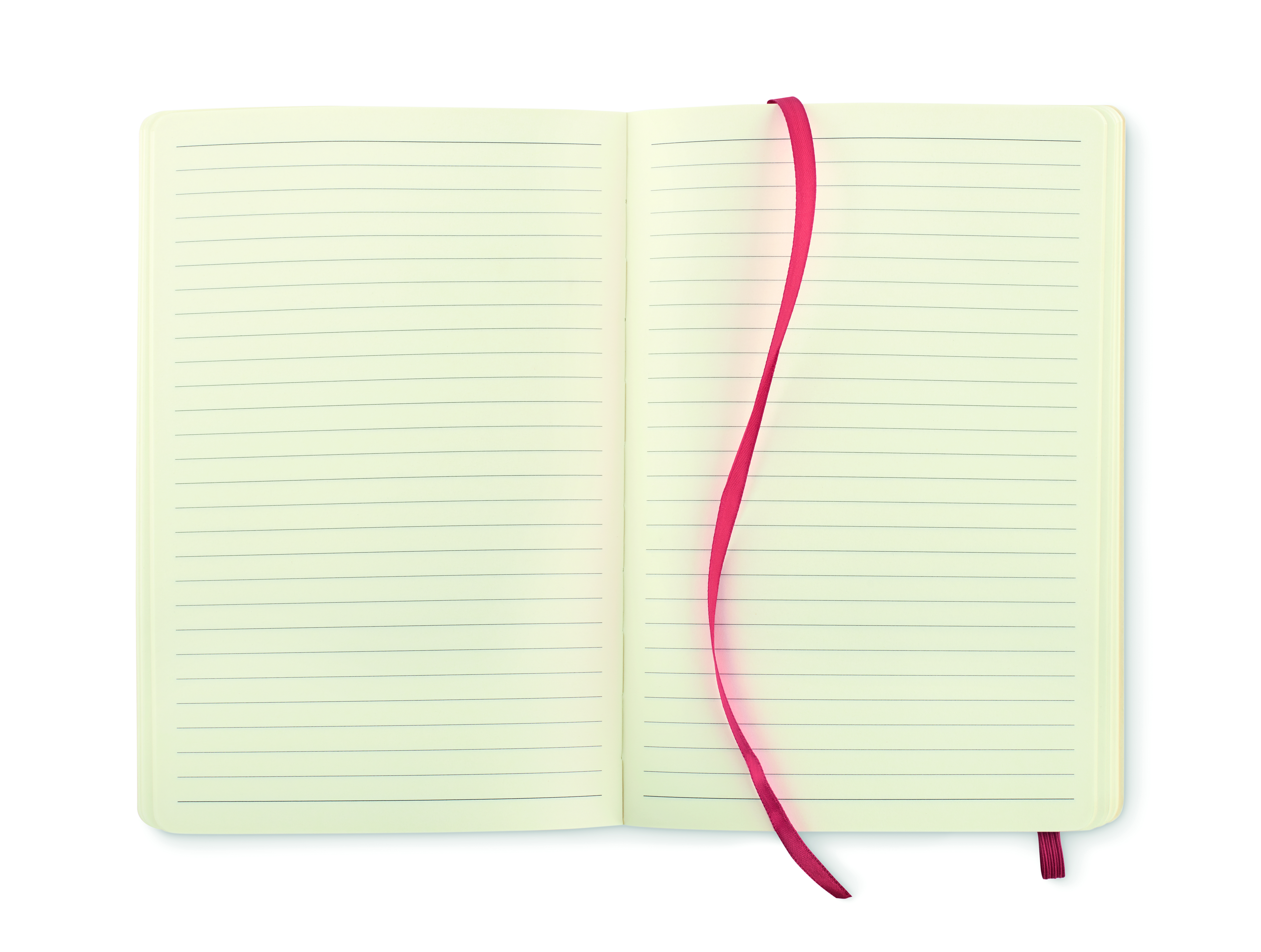 Notatnik A5 z miękką okładką z PU z recyklingu. 160 stron w linie z papieru z recyklingu (80 kartek). Dopasowany elastyczna opaska i zakładka z tasiemki. Rozszerzana kieszeń wewnętrzna z tyłu. FSC®-certified | FSC MIX CREDIT, P7.1, FSC-C213206