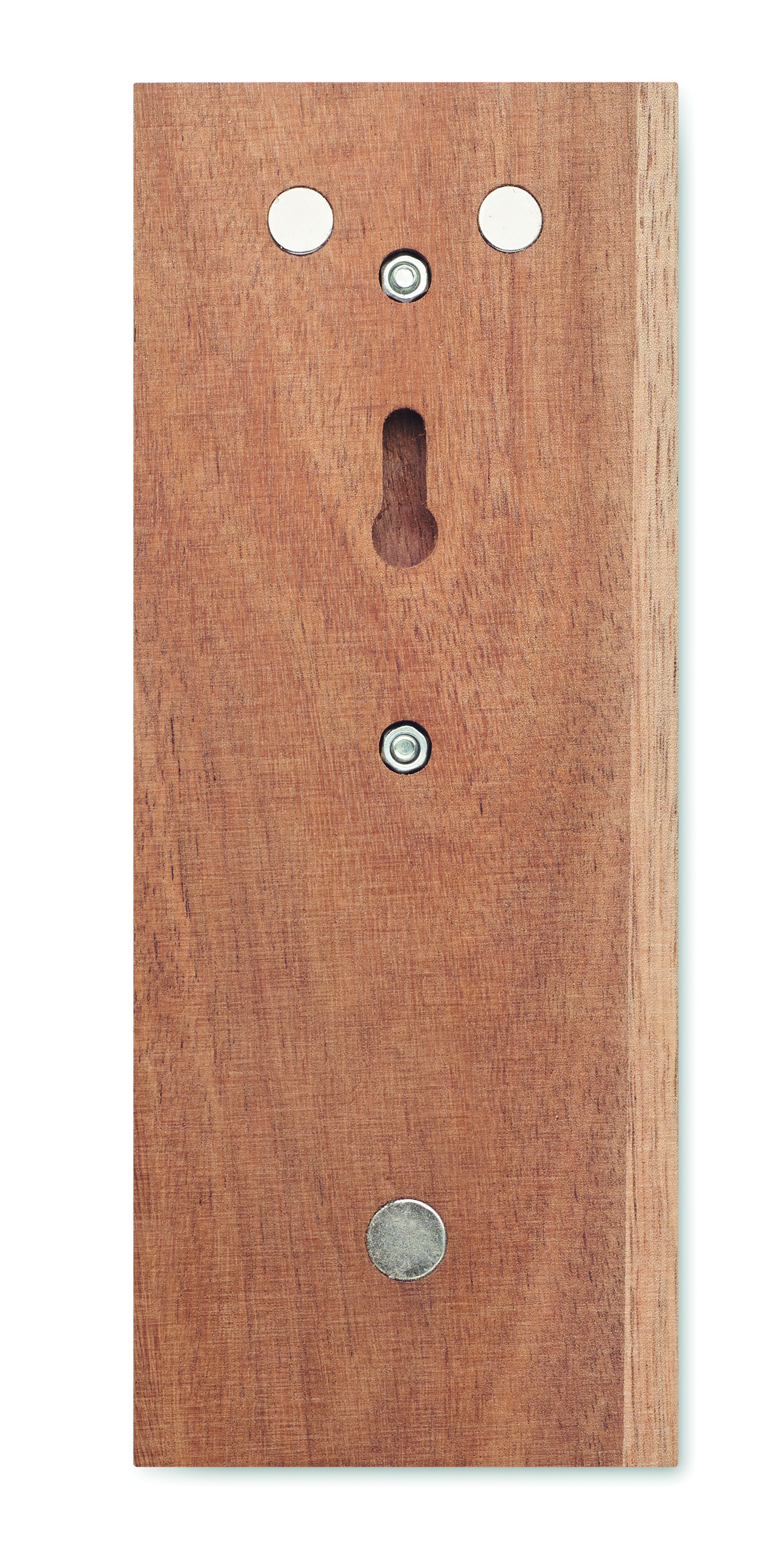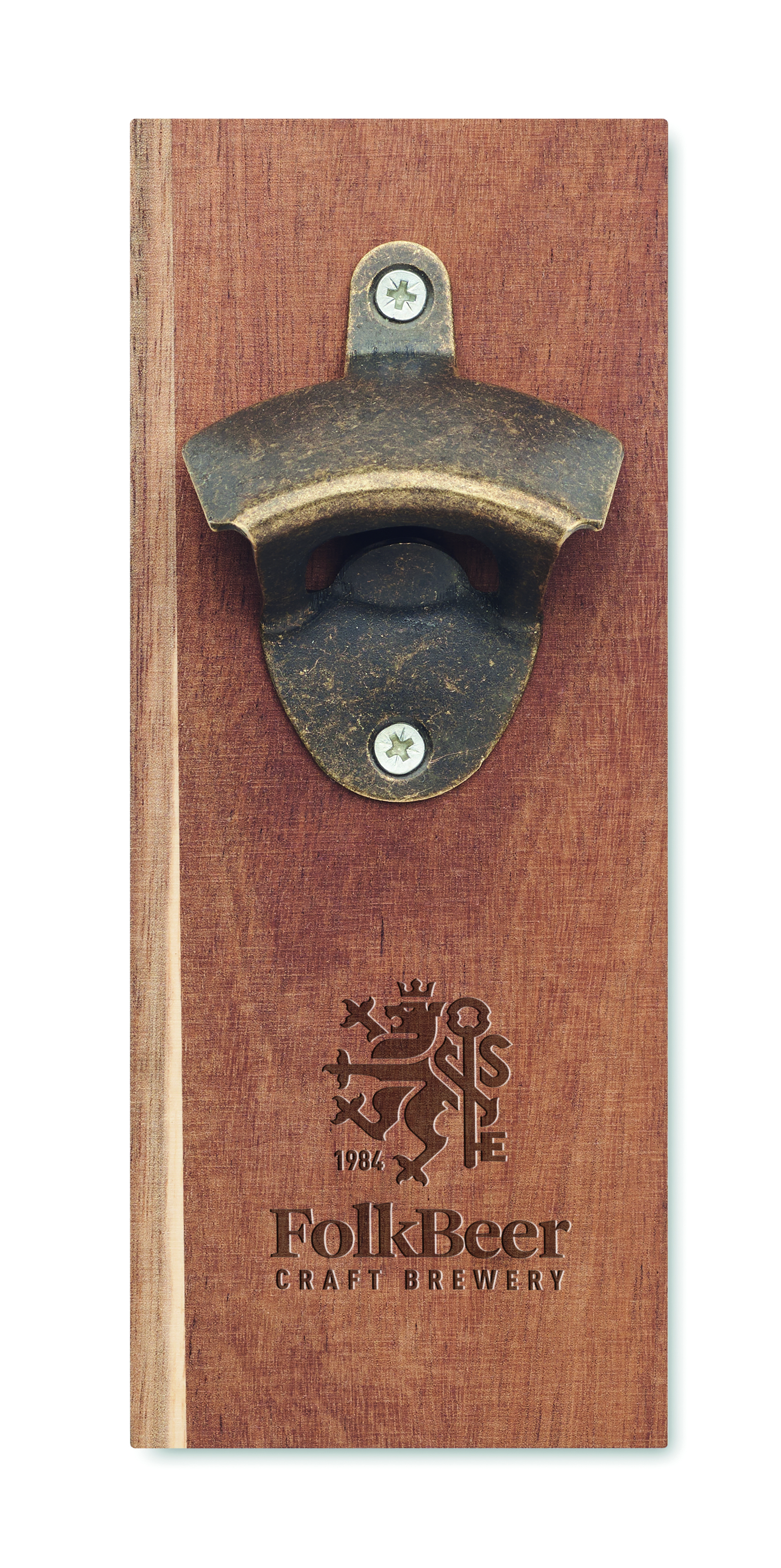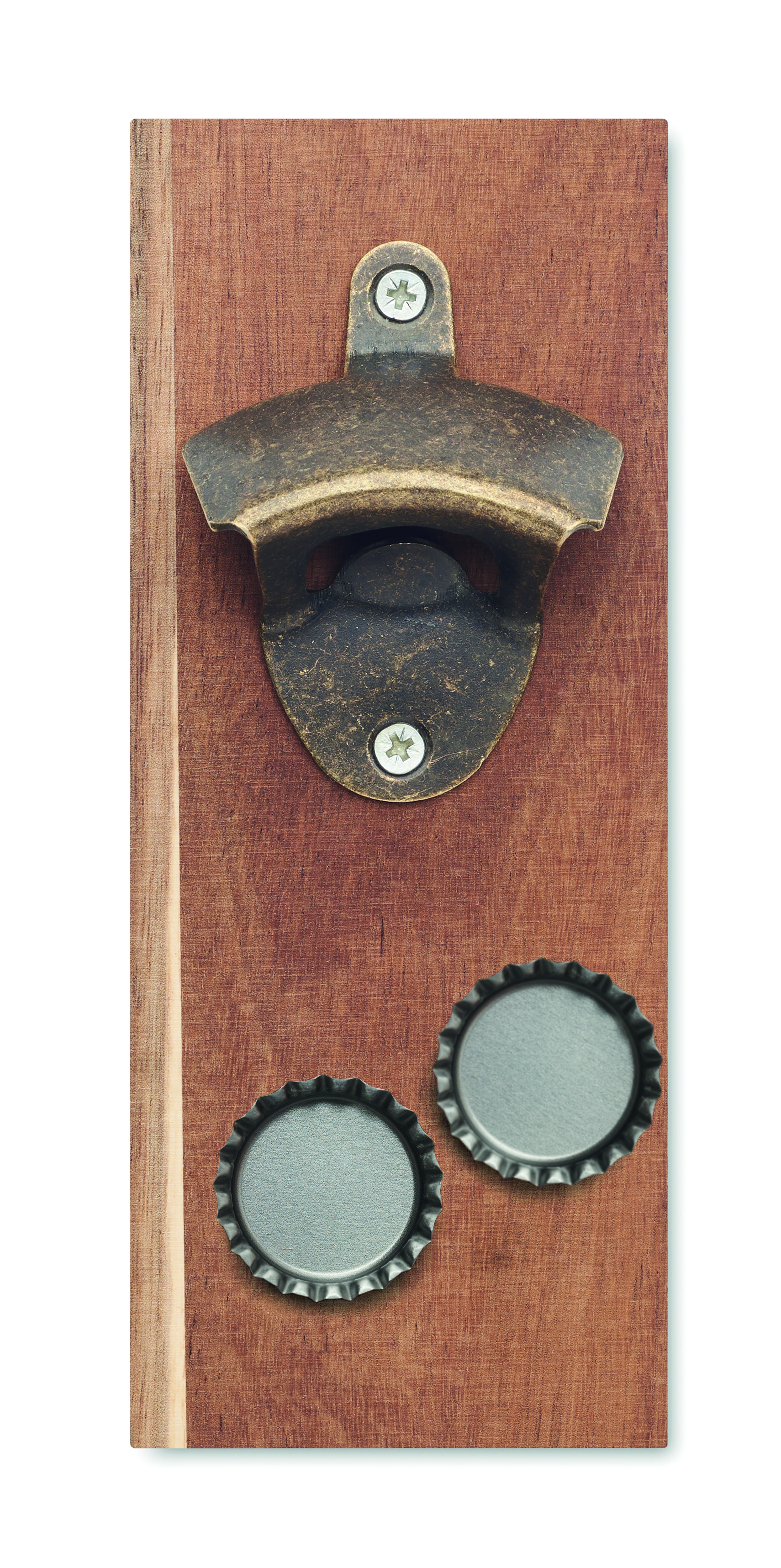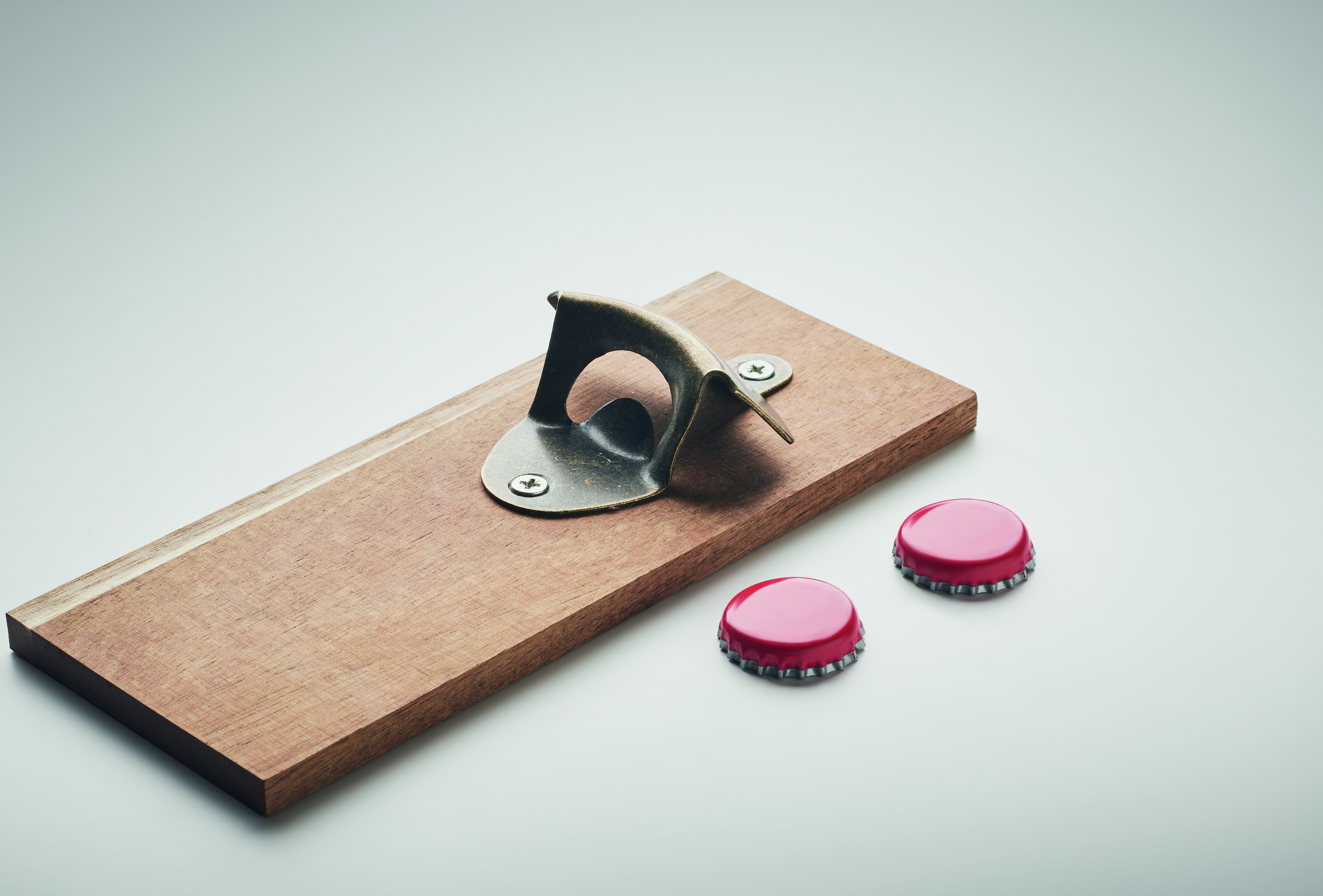 Montowany na ścianie otwieracz do butelek z drewna akacjowego i żelaza. Posiada silny magnes do łapania kapli oraz mocowania na lodówce, grillu itp.