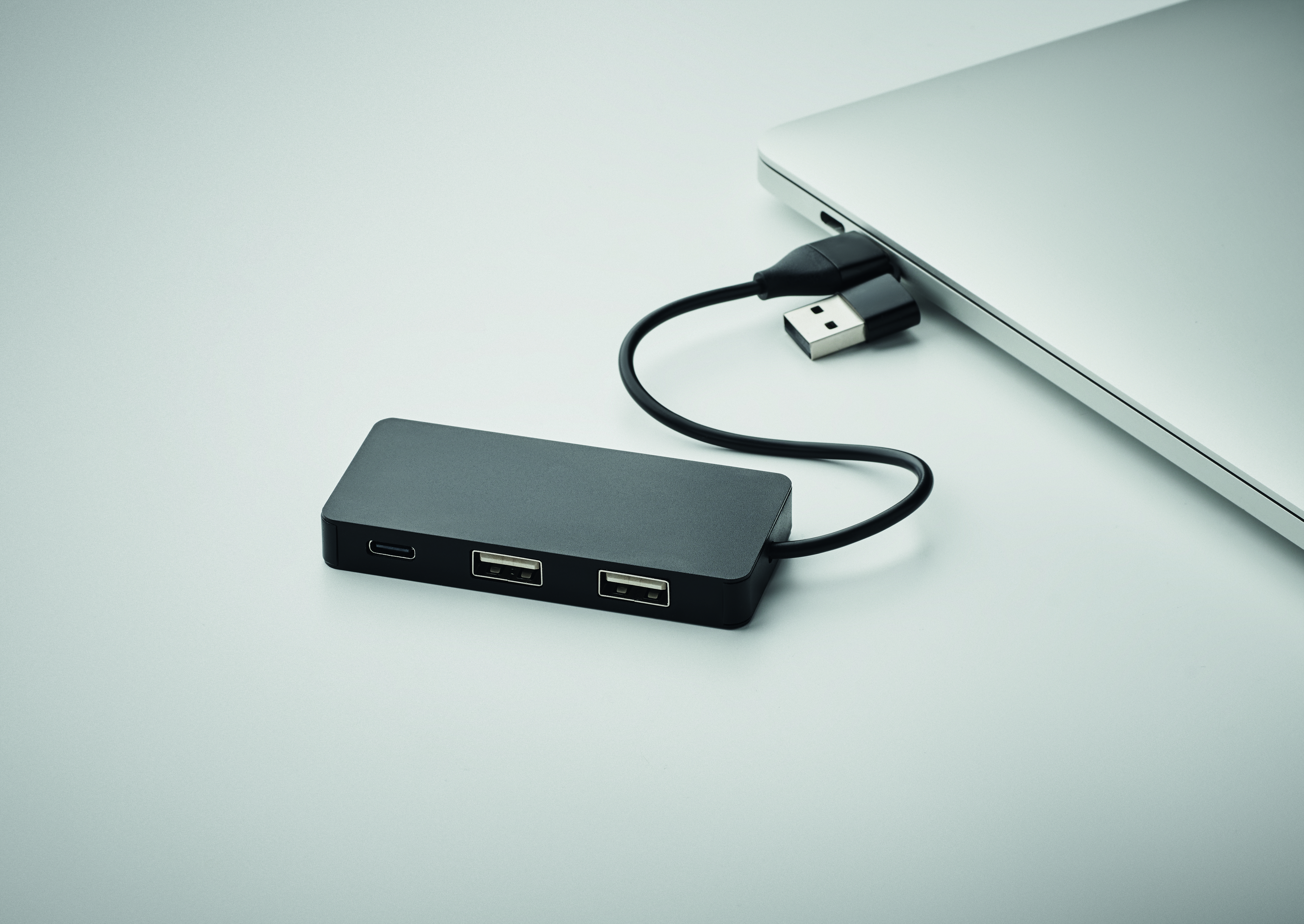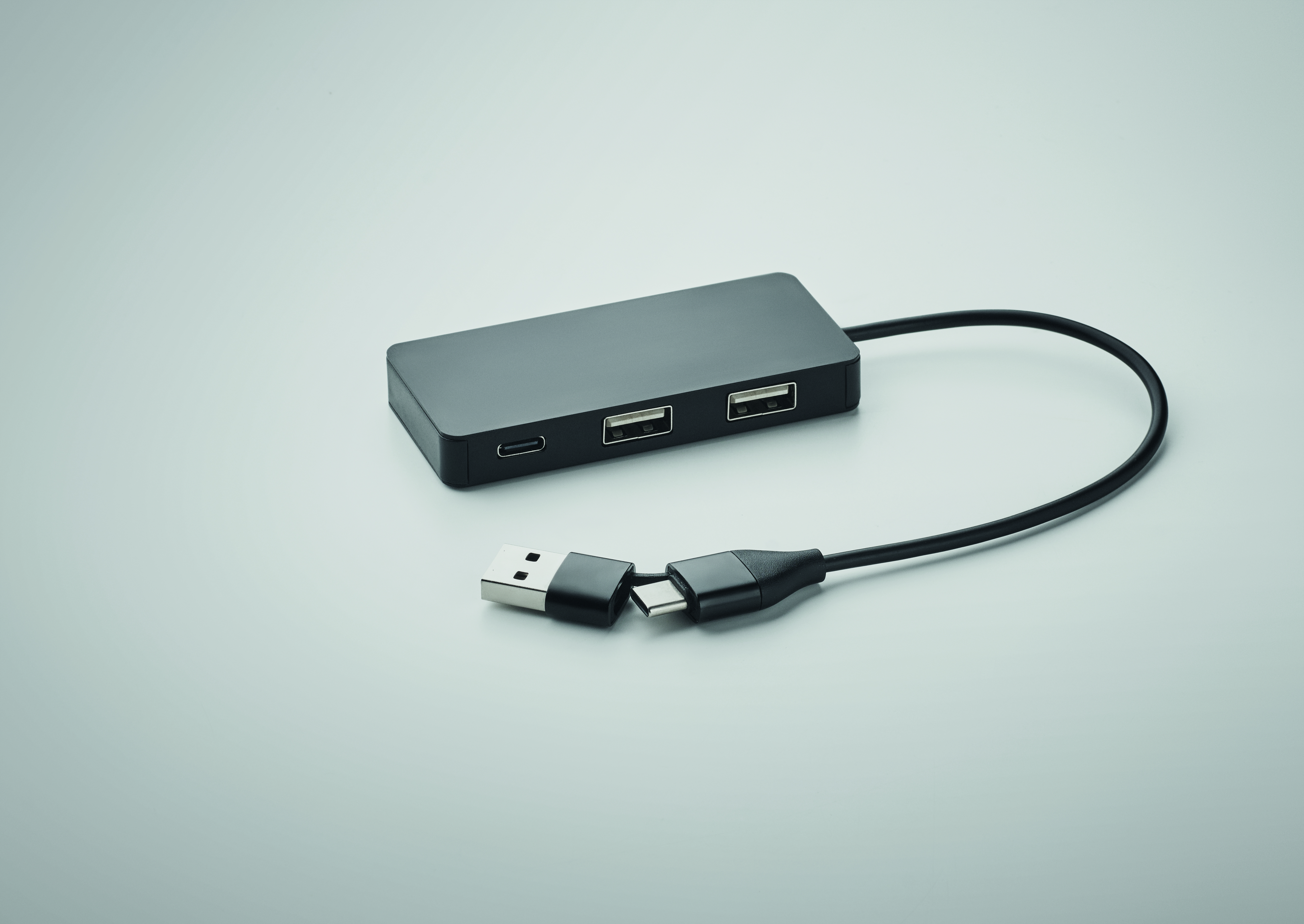 Aluminiowy 3 portowy hub USB. Wyjście: 2 x Type-A i 1 x Type-C. Wejście: 2 w 1 Type-C i Type-A. Długość kabla: 20 cm.