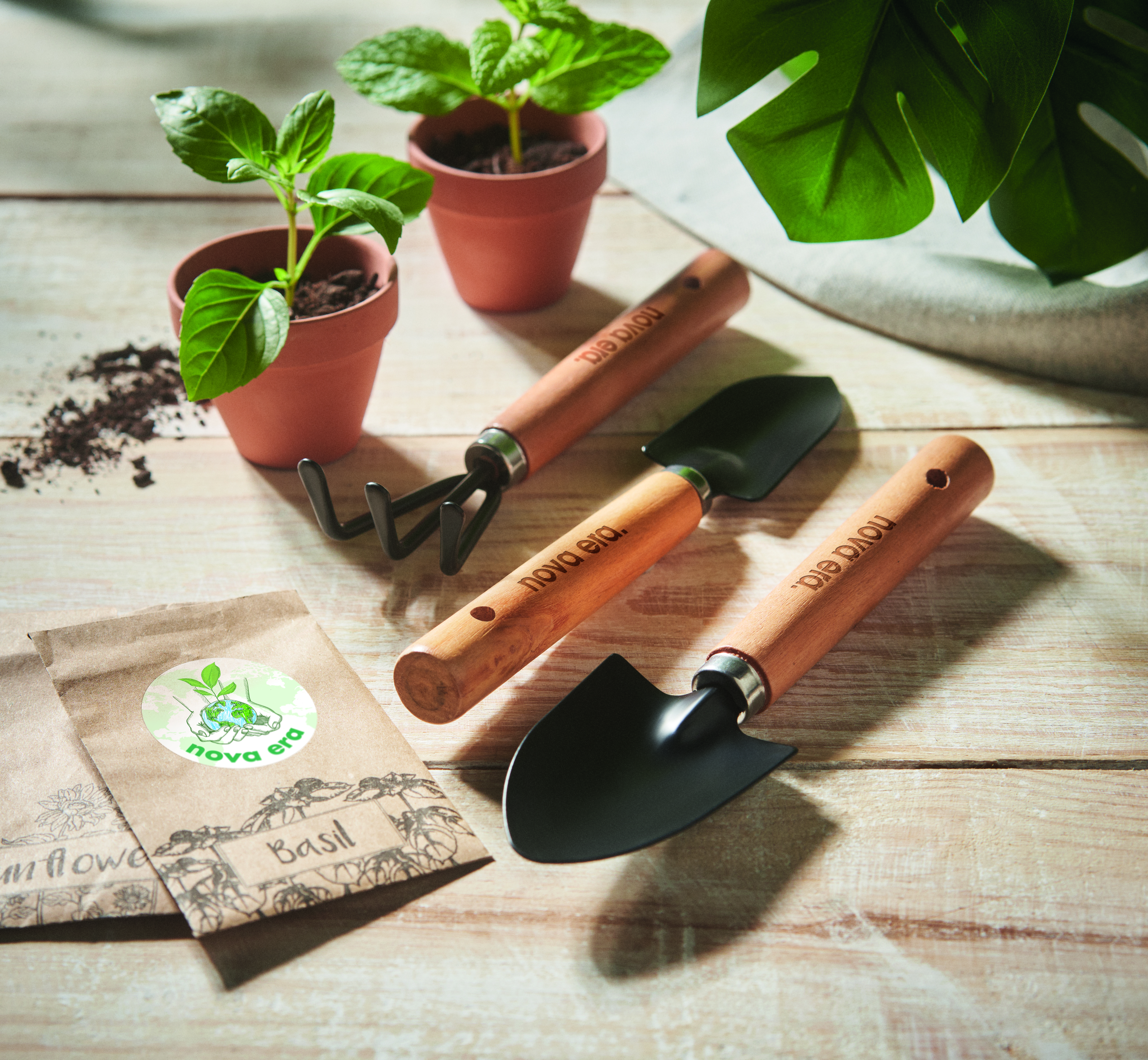 Zestaw 3 narzędzi ogrodowych. Grabki i 2 łopatki. Zapakowane w etui z filcu RPET.