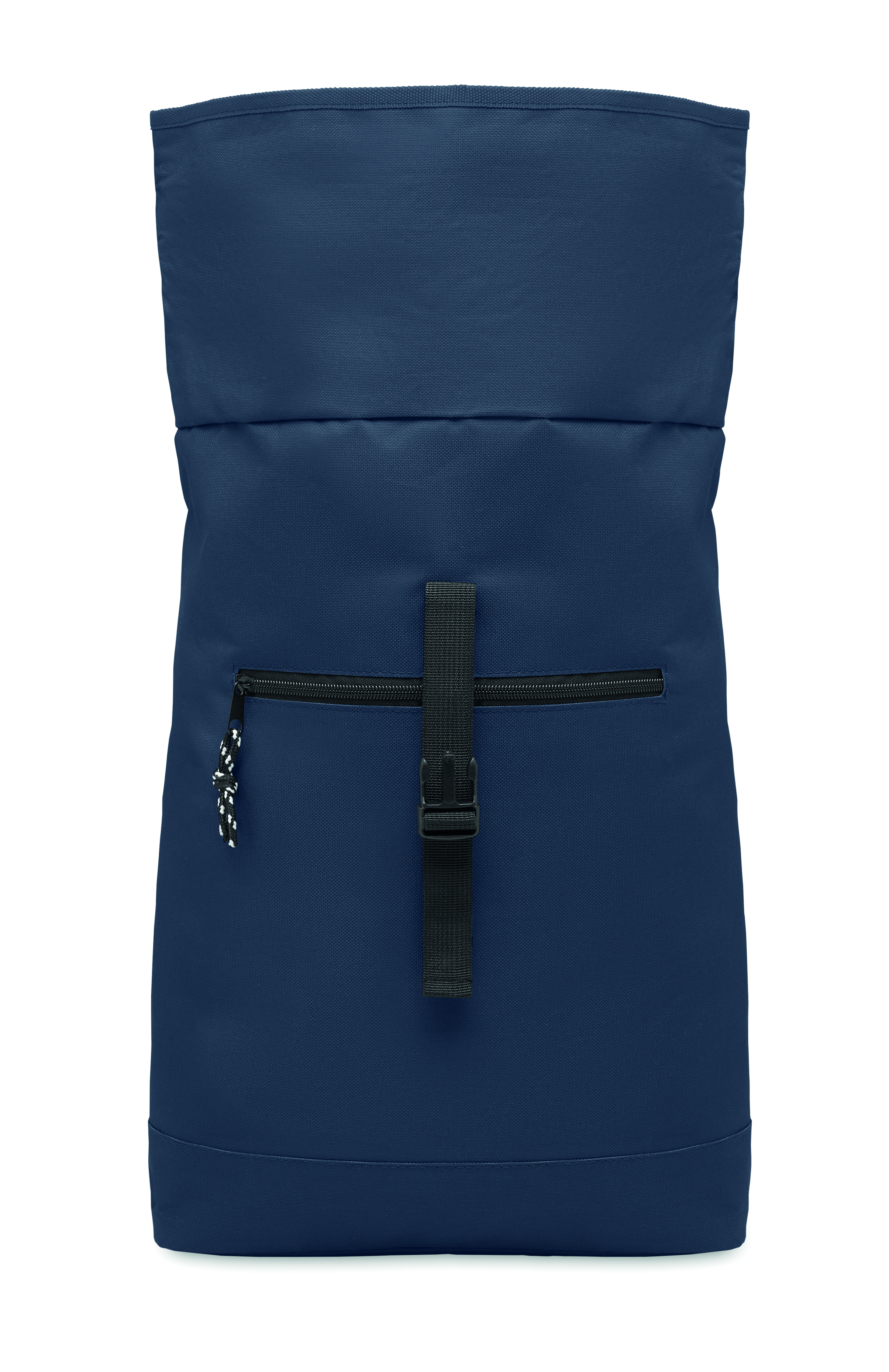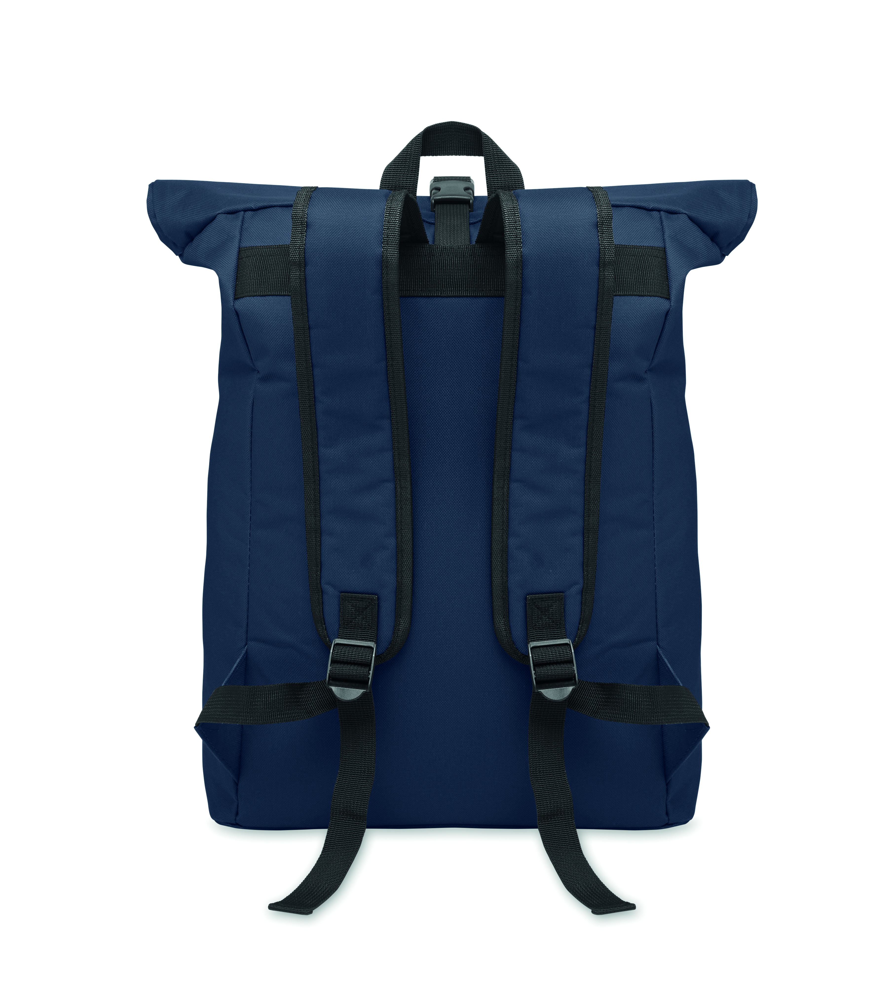 15-calowy zwijany plecak na laptopa typu rolltop z poliestru 600D z wyściełanym tyłem i wzmocnionym spodem. Przednia kieszeń zapinana na zamek. Podszewka 210D.