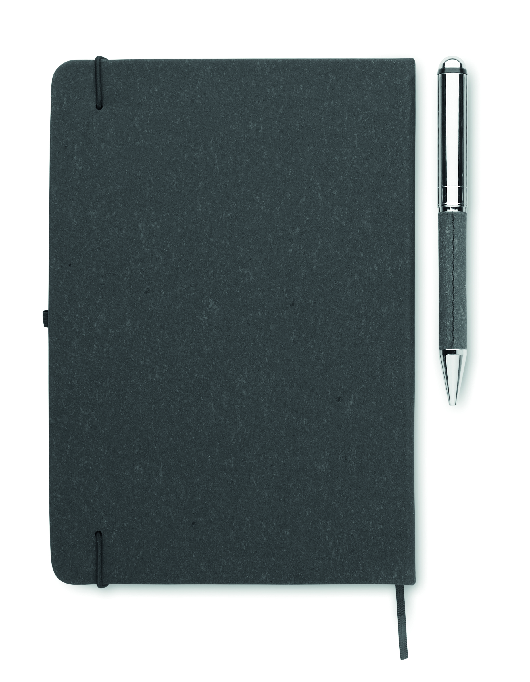 Zestaw upominkowy. Notatnik A5 z twardą okładką, wykonany w 75% ze skóry z recyklingu. Oprawiony. 160 stron w linie (80 kartek)z papieru z recyklingu. Dopasowana gumka zamykająca, wstążkowy znacznik stron i uchwyt na długopis. Dopasowany metalowy długopis. Niebieski tusz. Zapakowany w papierowe pudełko. FSC®-certified | FSC MIX CREDIT, P7.1, FSC-C213206