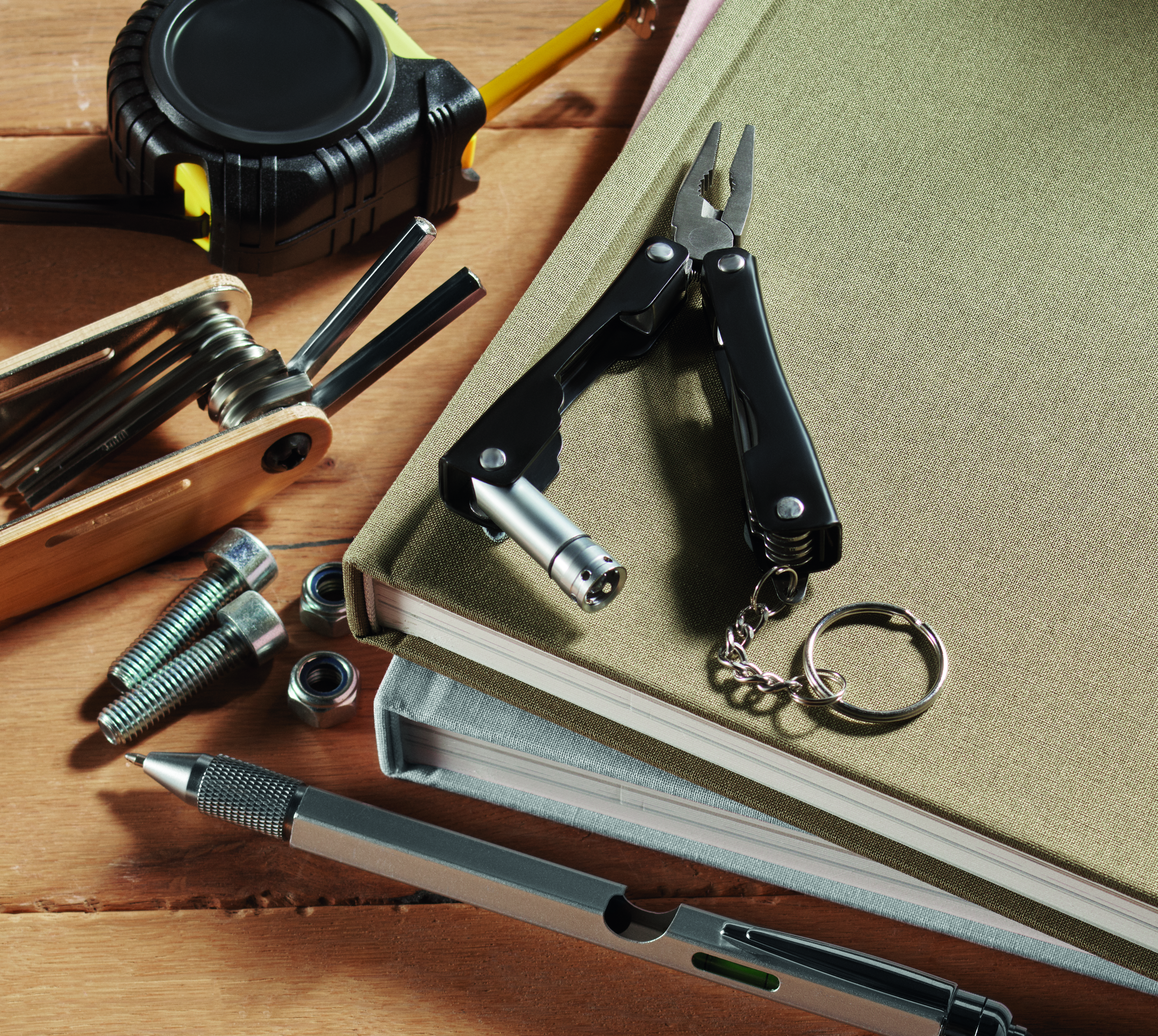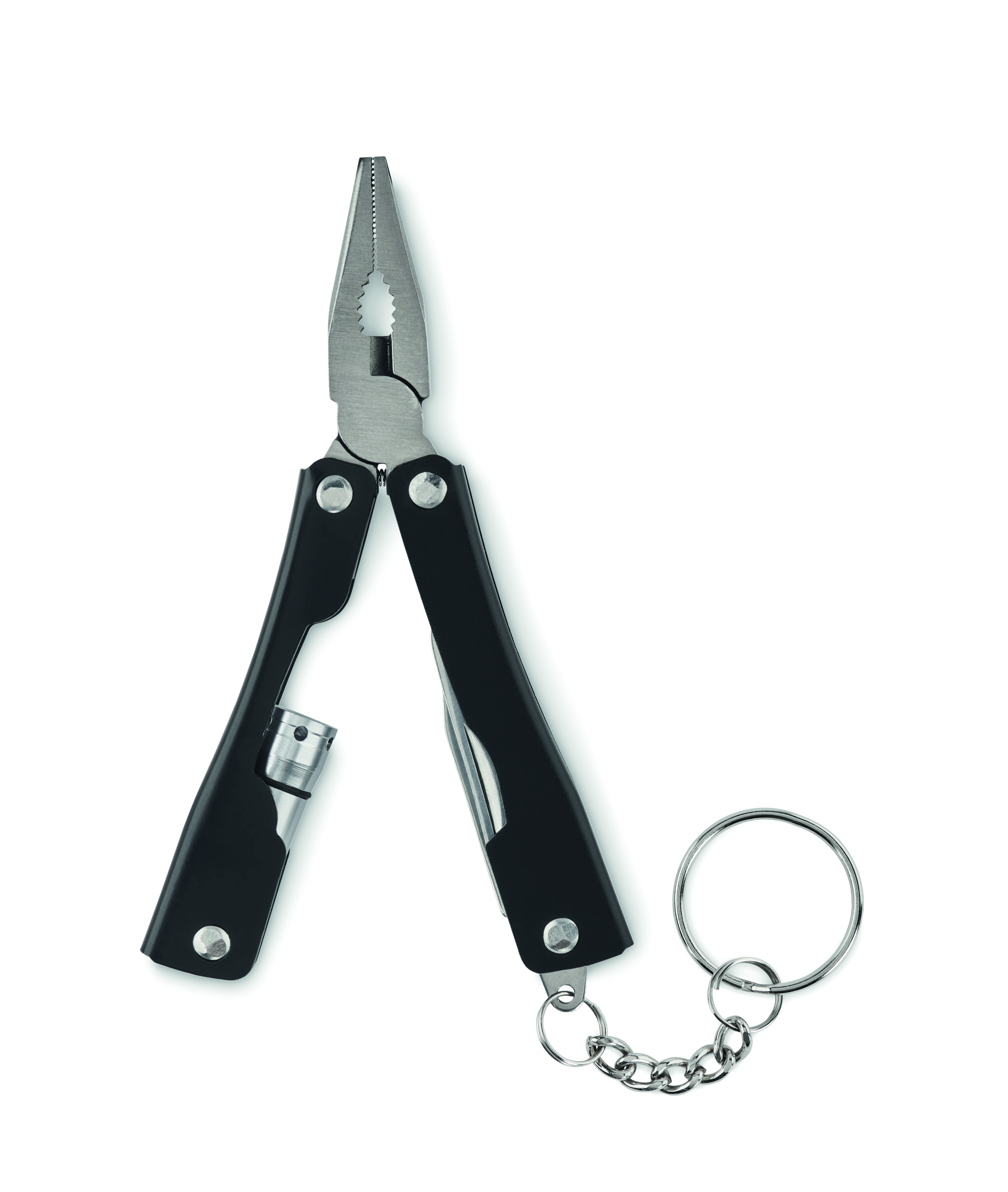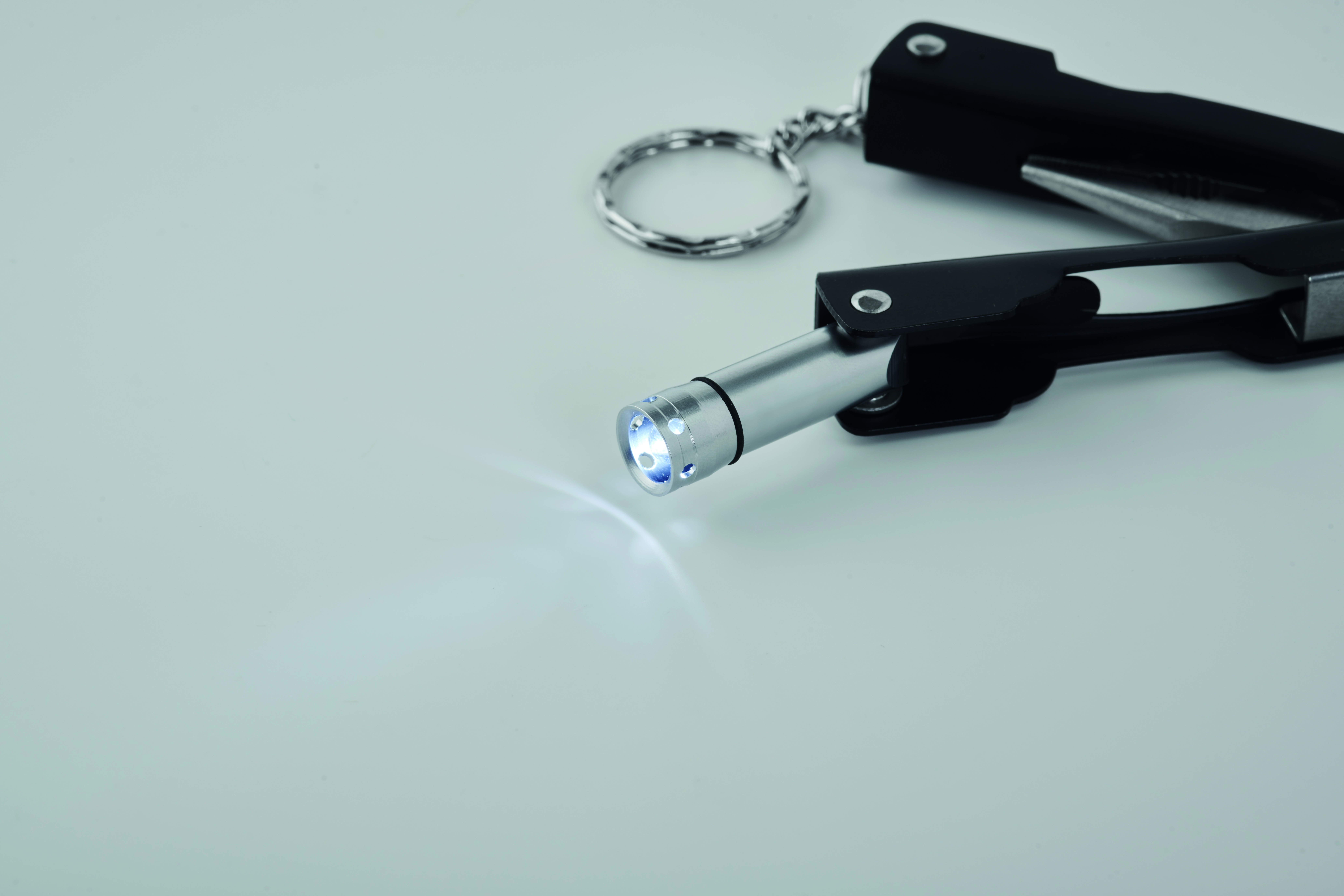 Składany nóż wielofunkcyjny z latarką ze stali nierdzewnej. Zawiera 10 różnych narzędzi oraz etui z poliestru 600D. Zawiera 3 baterie guzikowe AG3.