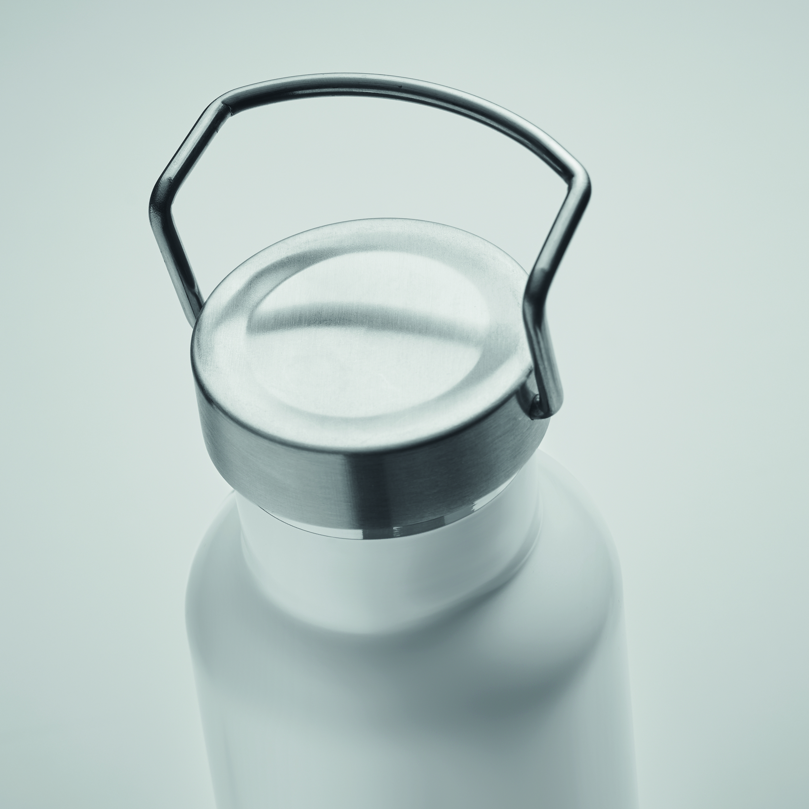 Dwuścienna, izolowana próżniowo butelka z recyklingowanej stali nierdzewnej z pokrywką z uchwytem i korkową podstawą. Nie przecieka. Pojemność: 500 ml. (90% stali nierdzewnej z recyklingu i 10% stali nierdzewnej).