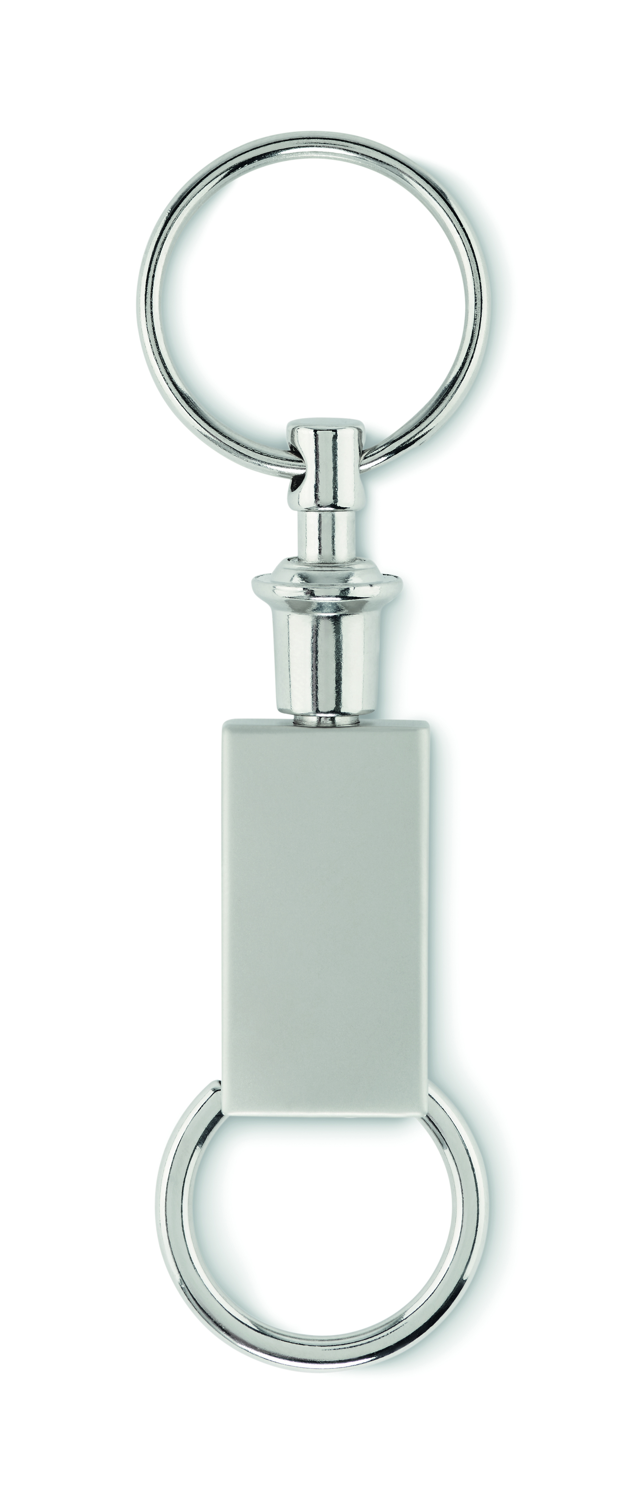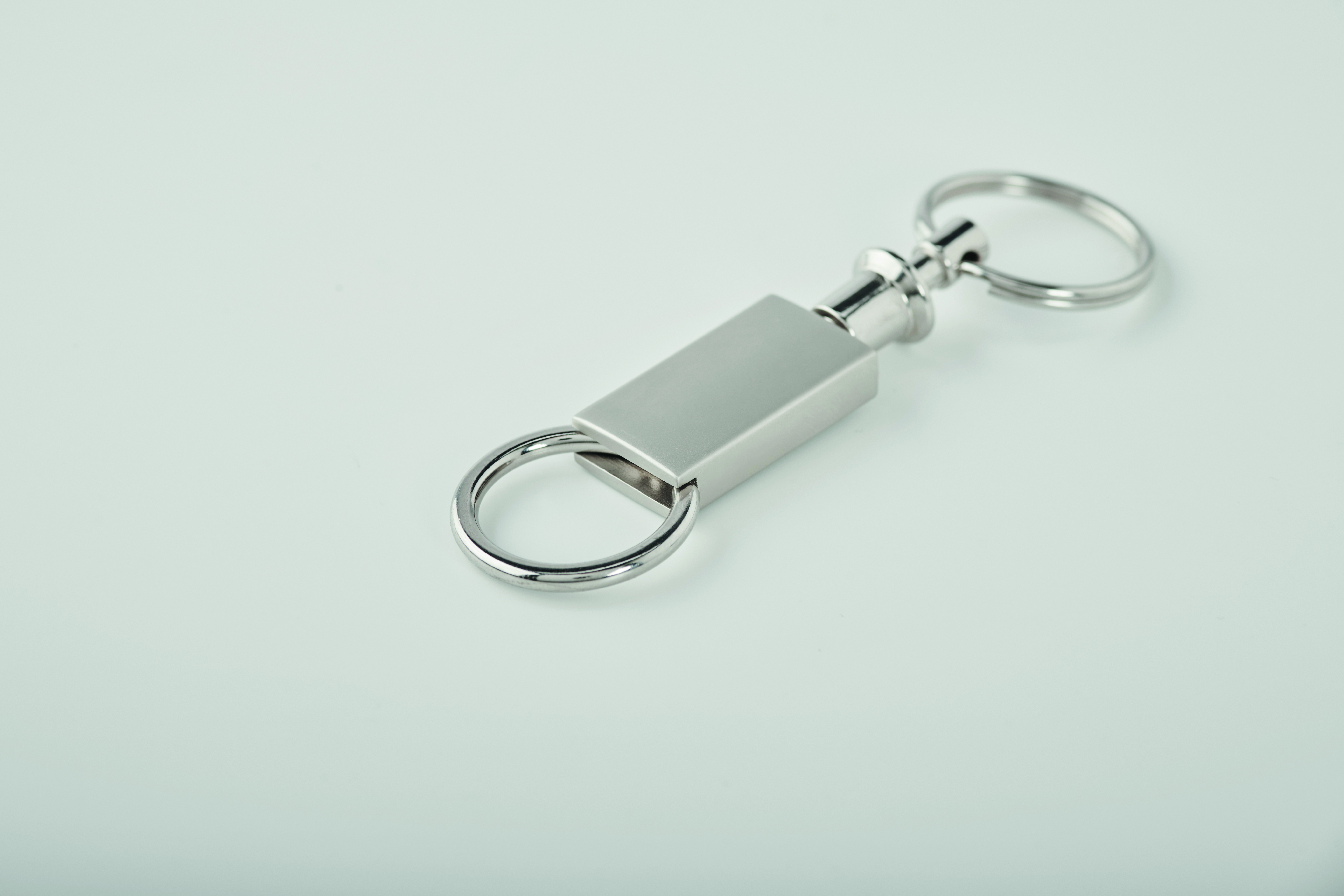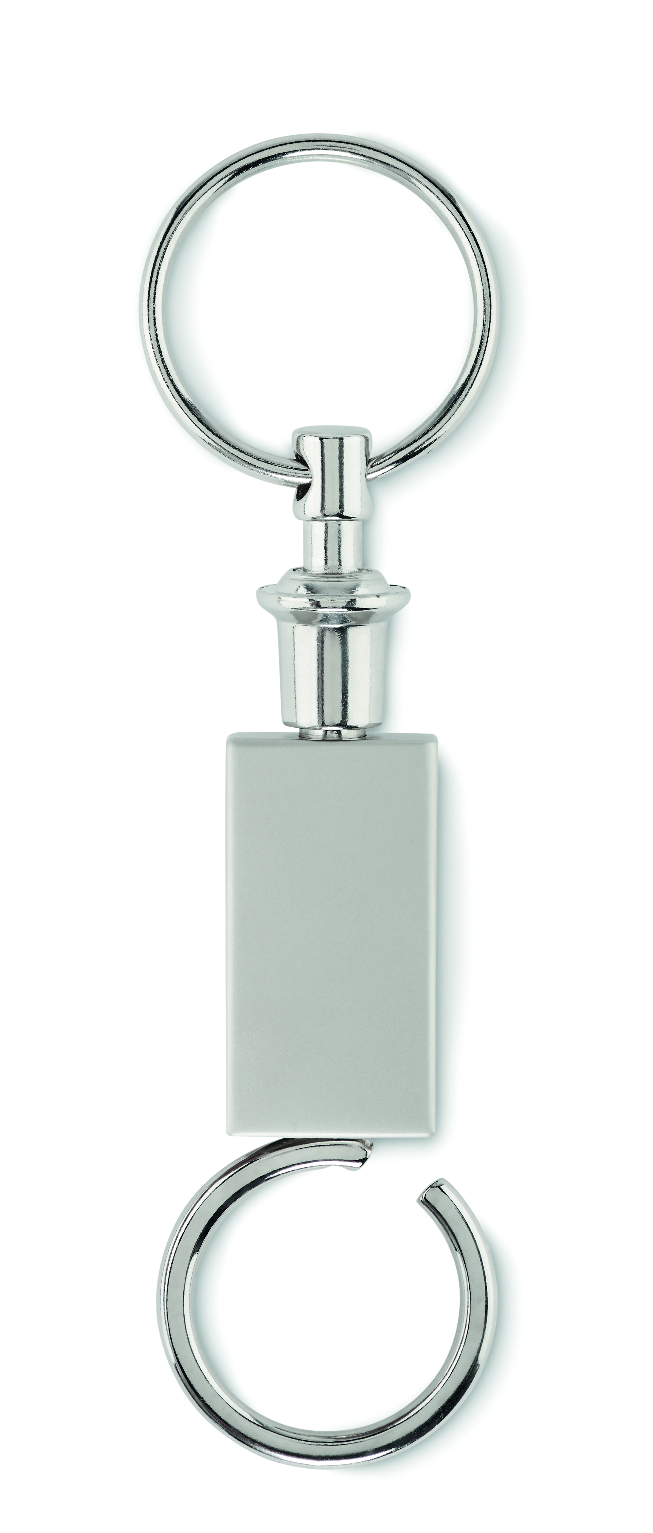 Brelok 2 w 1 ze stopu cynku. Rozdzielany brelok posiada 2 kółka na klucze.