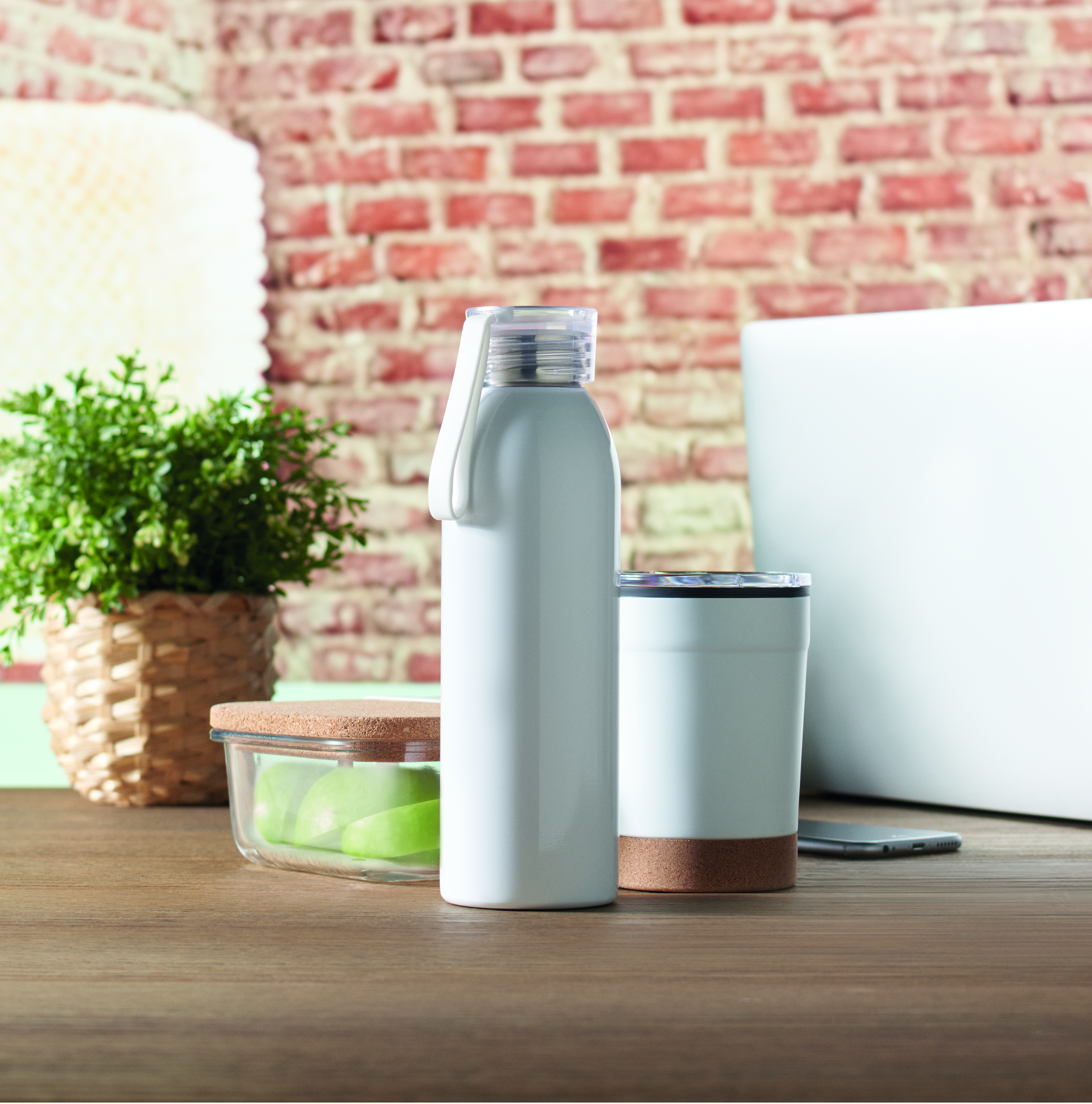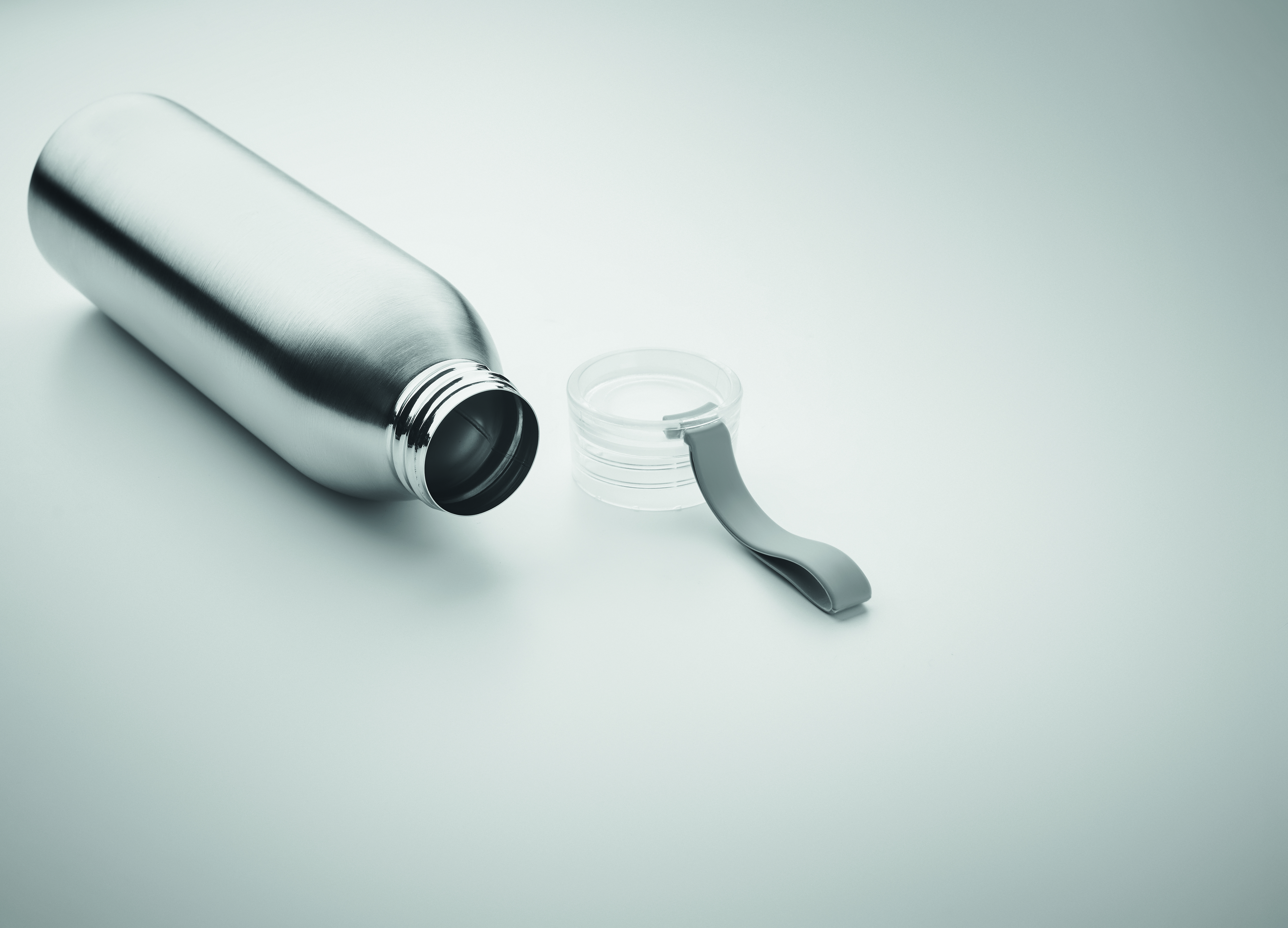 Jednościenna butelka ze stali nierdzewnej z pokrywką z PP i silikonową zawieszką. Pojemność: 650 ml. Ponieważ jest to kubek z pojedynczą ścianką, może dochodzić do wymiany ciepła.