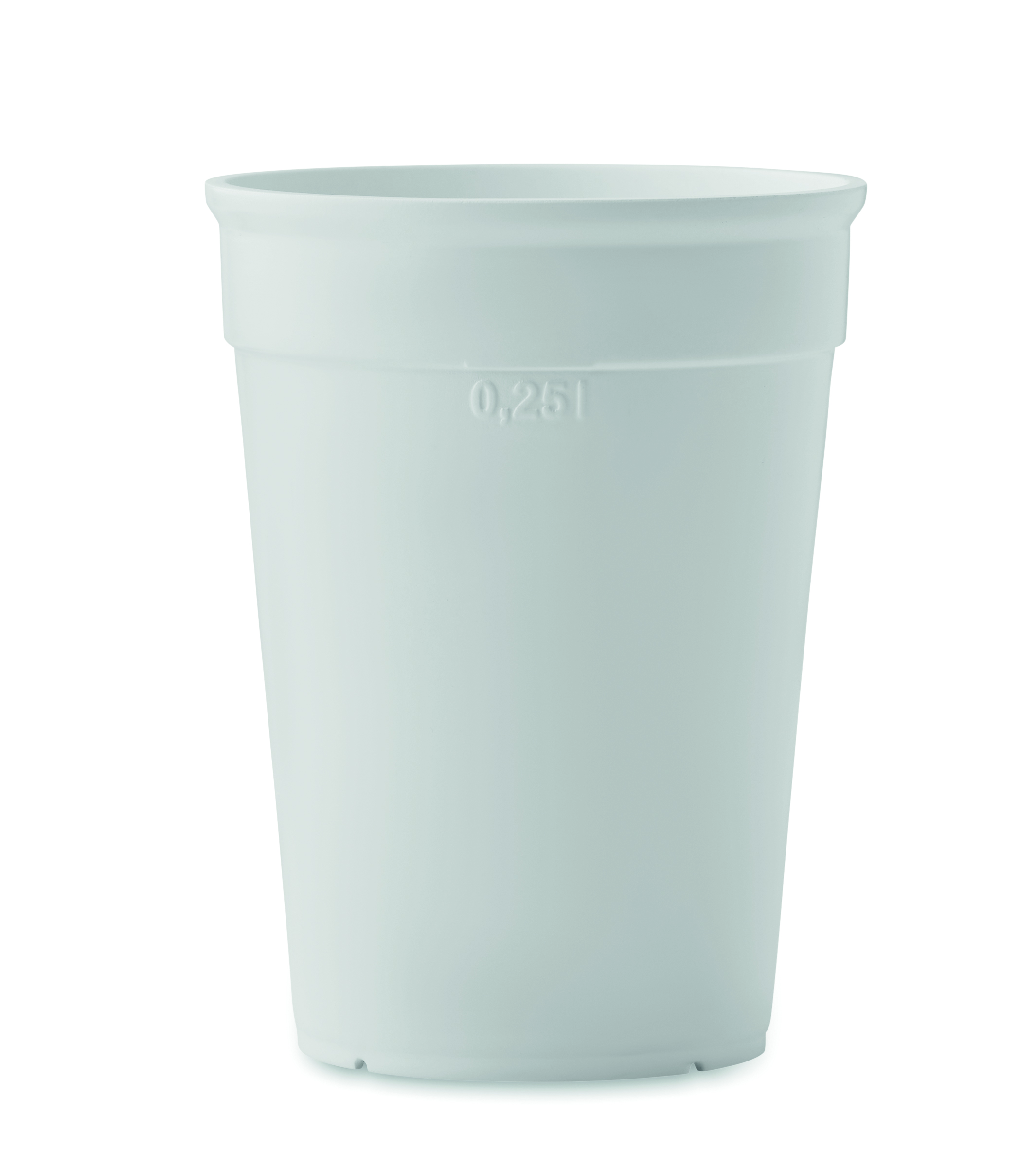 Wielokrotnego użytku jednościankowy kubek na kawę z PP pochodzącego. Pojemność: 250 ml. Ponieważ jest to kubek z pojedynczą ścianką, może dochodzić do wymiany ciepła.