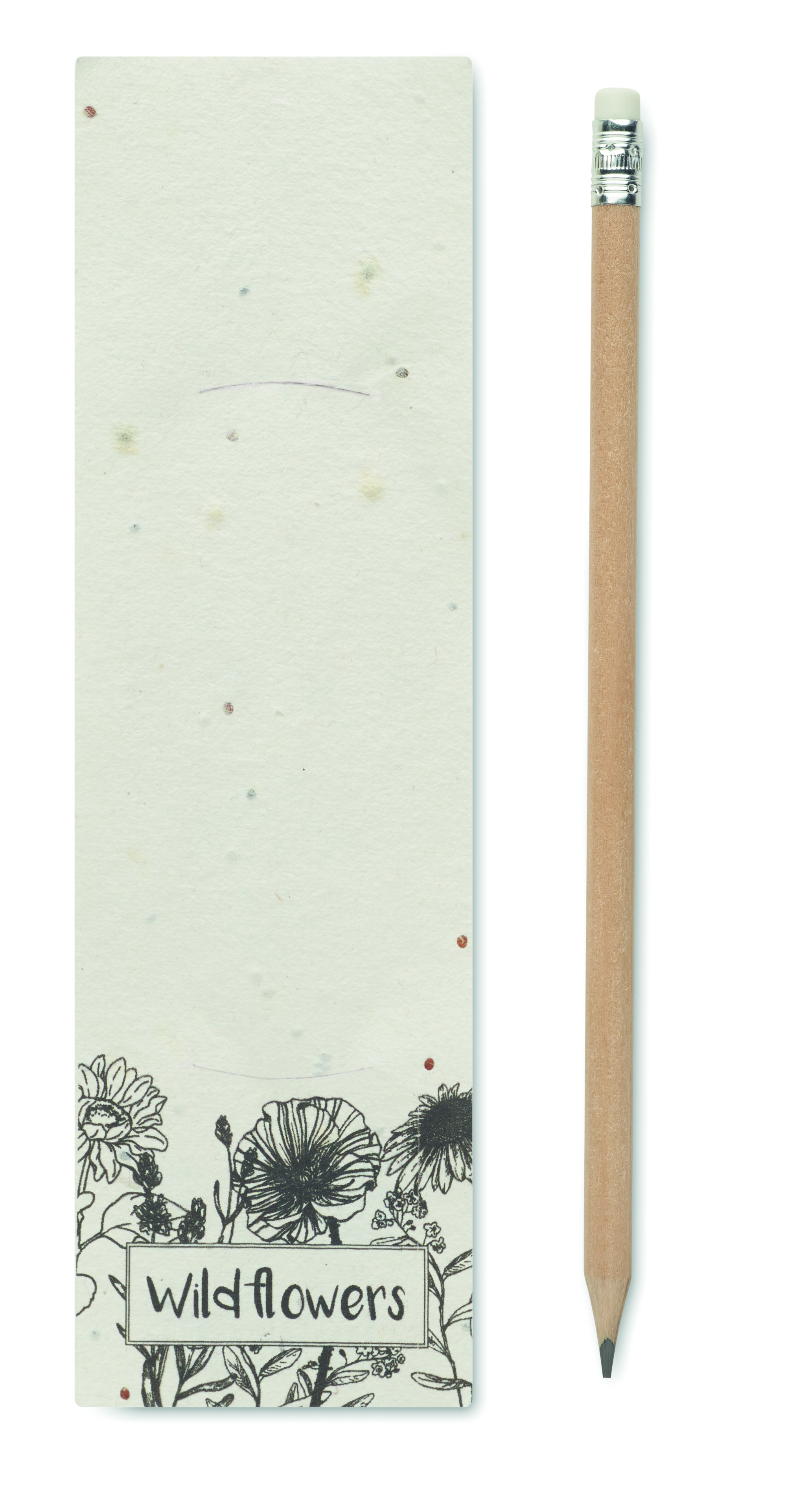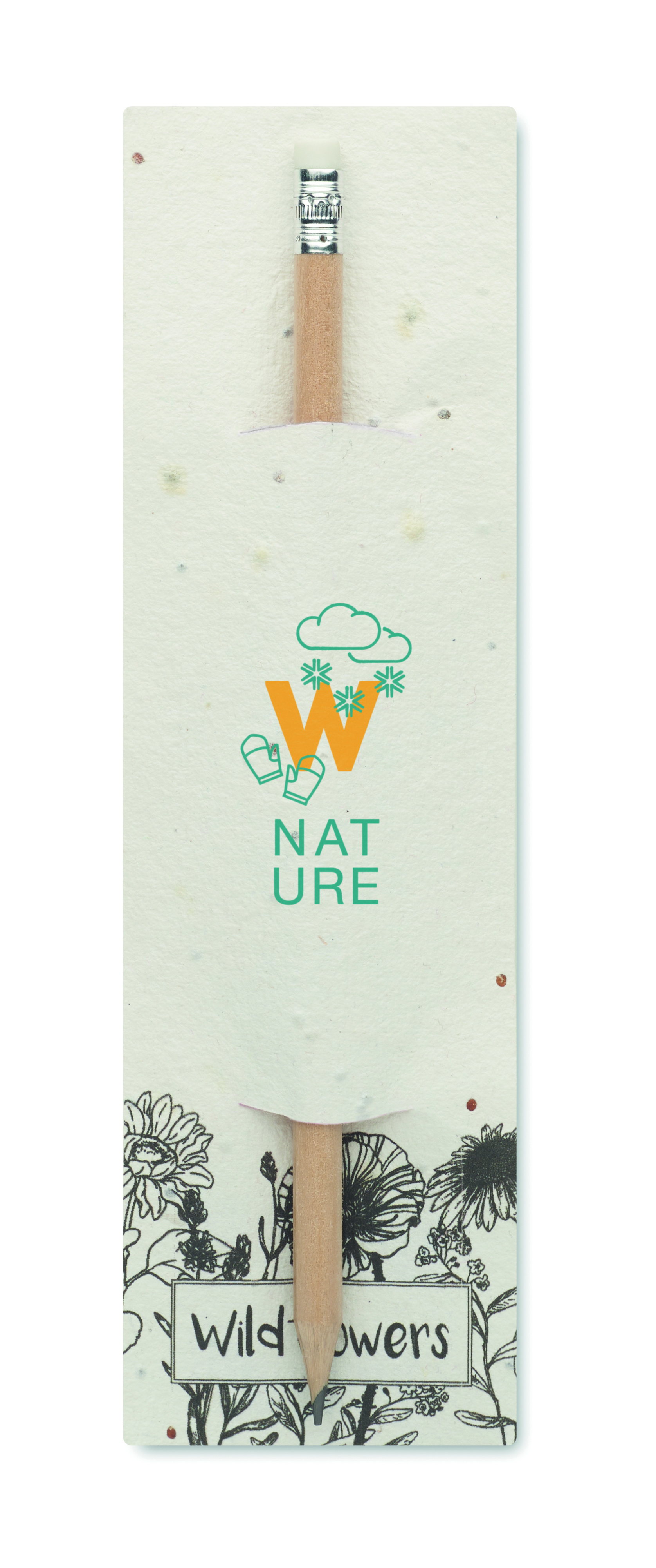 Ołówek z naturalnego drewna z gumką. Zapakowany w saszetkę z papieru siewnego (polne kwiaty).