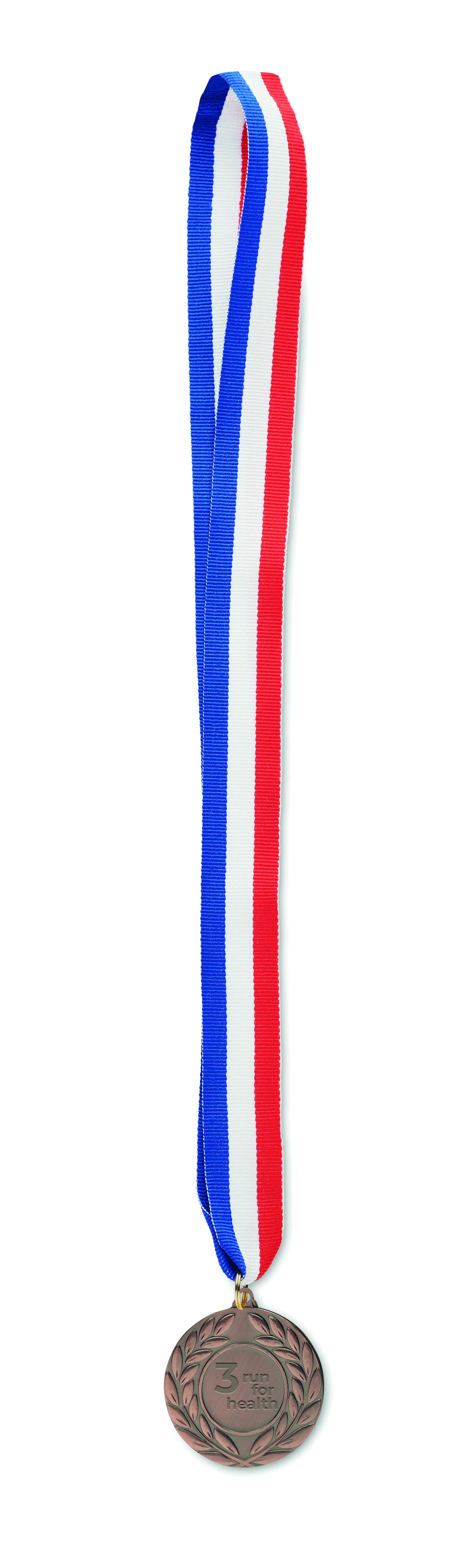 Medal wykonany z żelaza z poliestrowym paskiem w kolorach niebieskim, białym i czerwonym. Średnica 5 cm