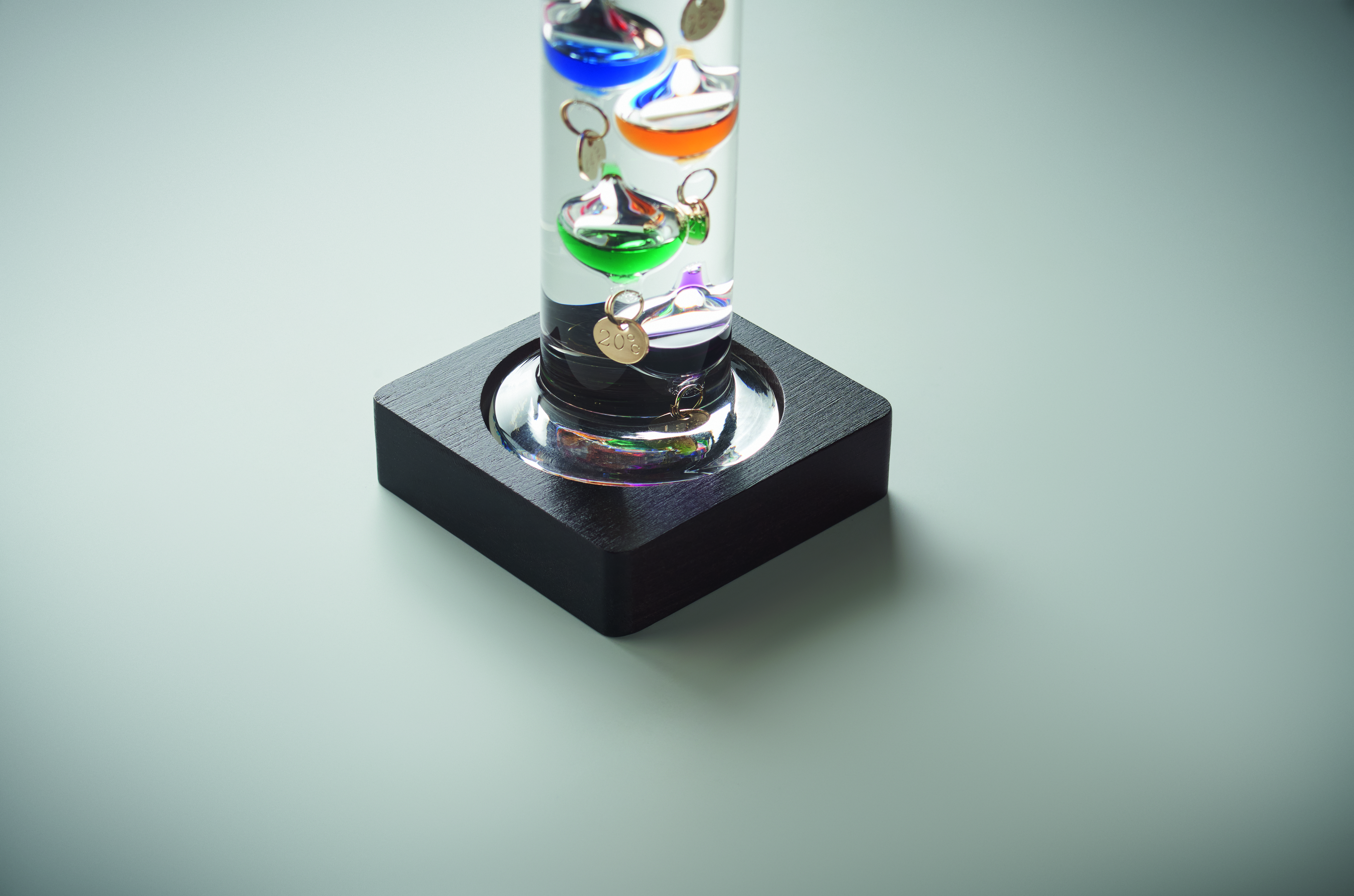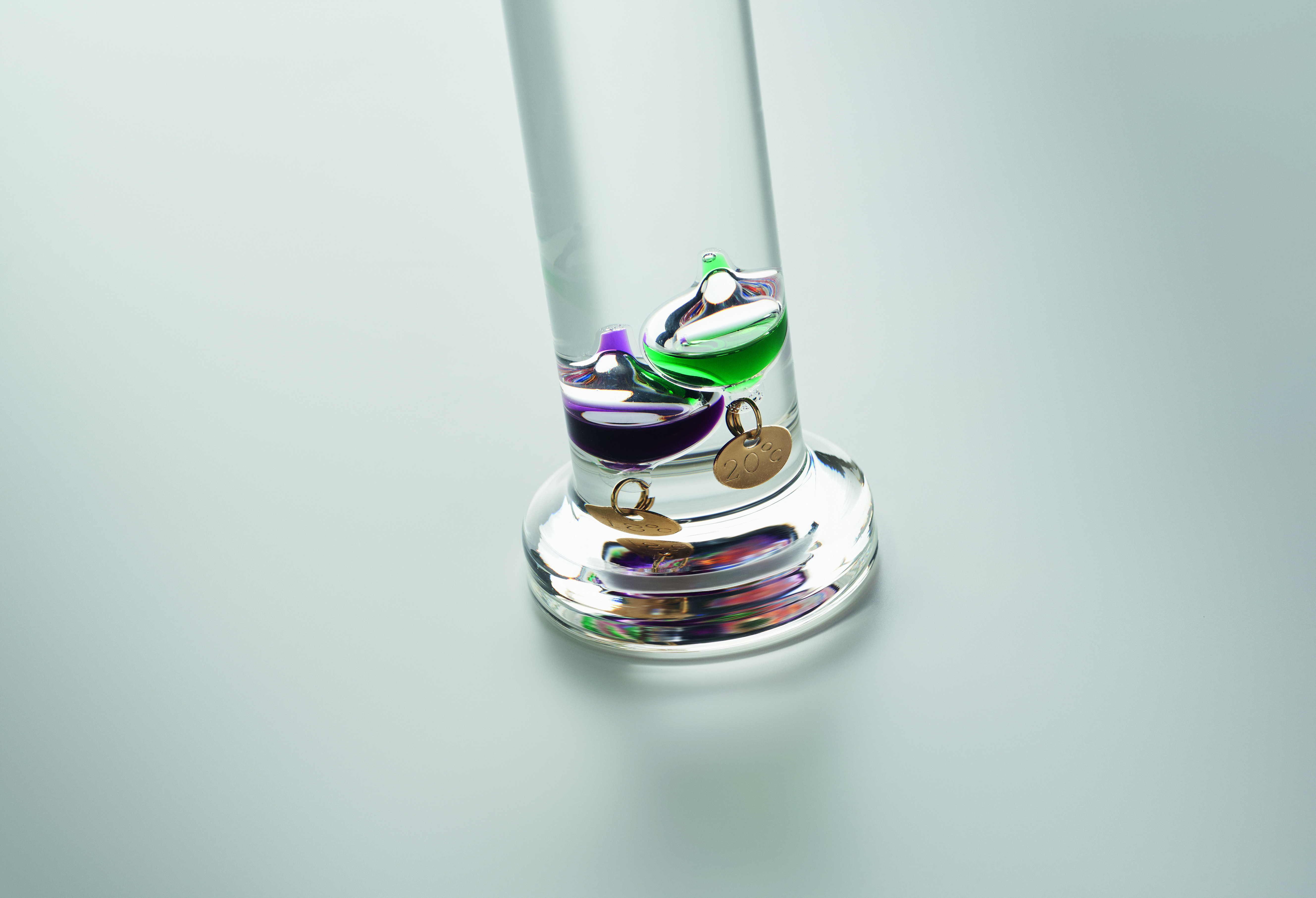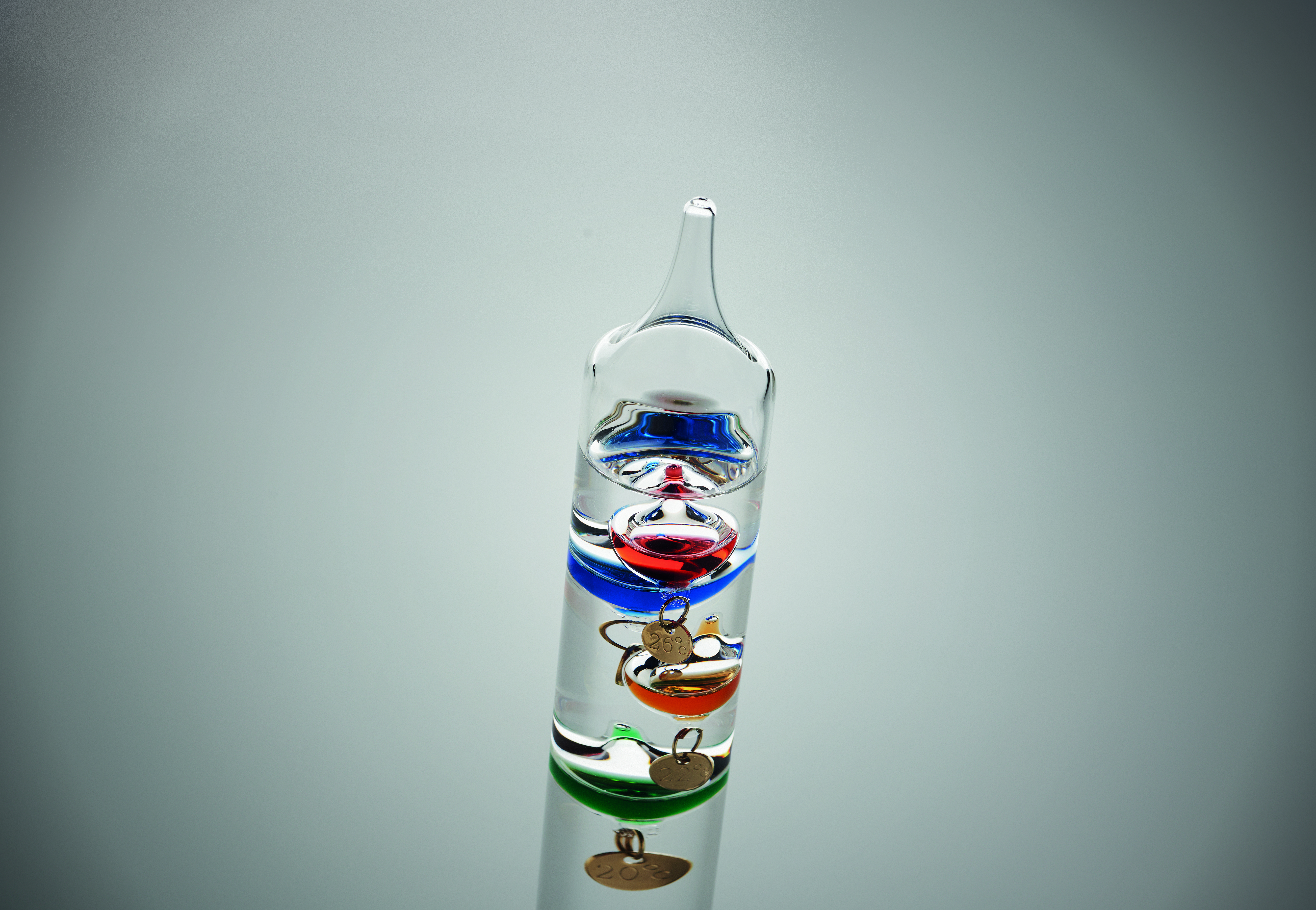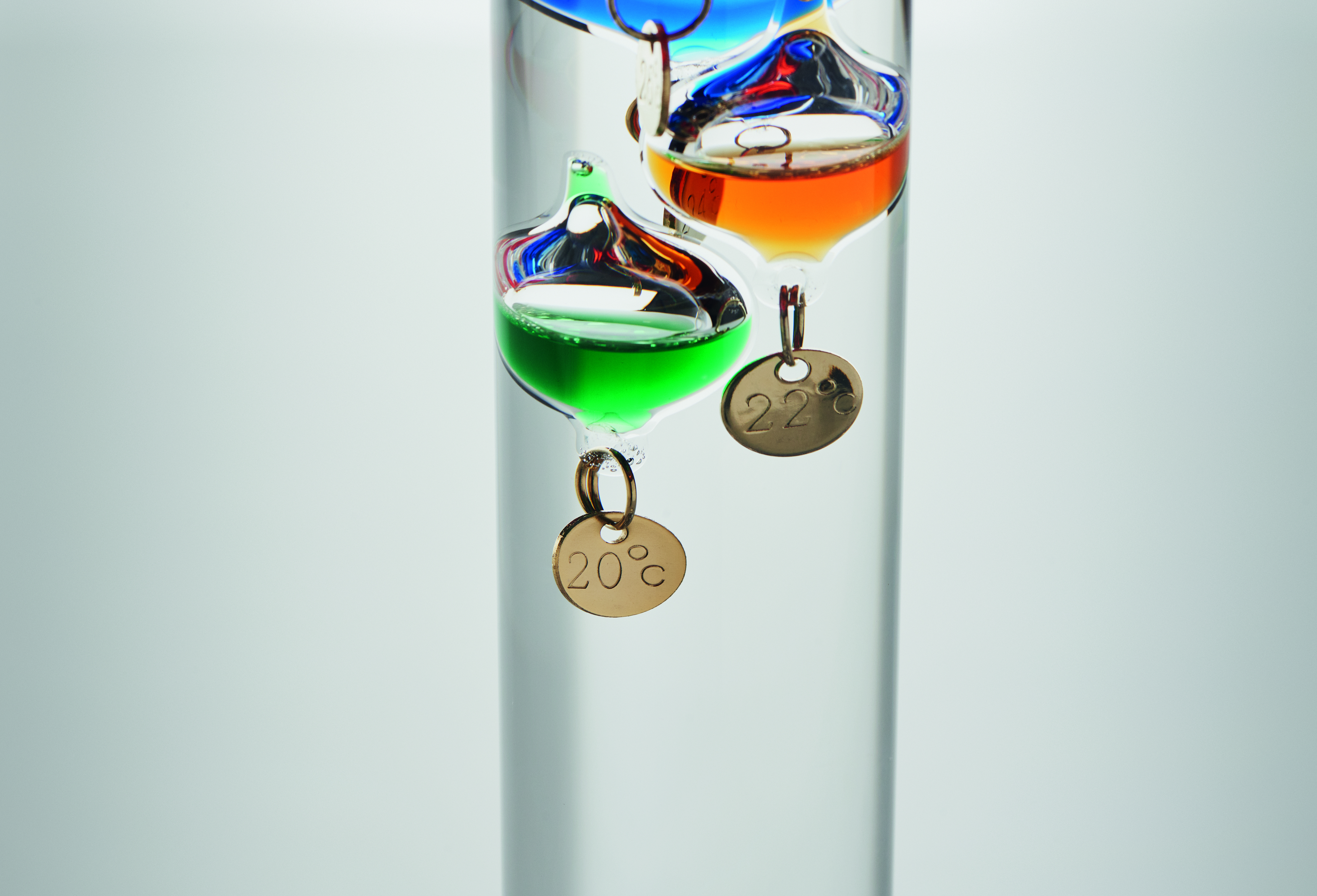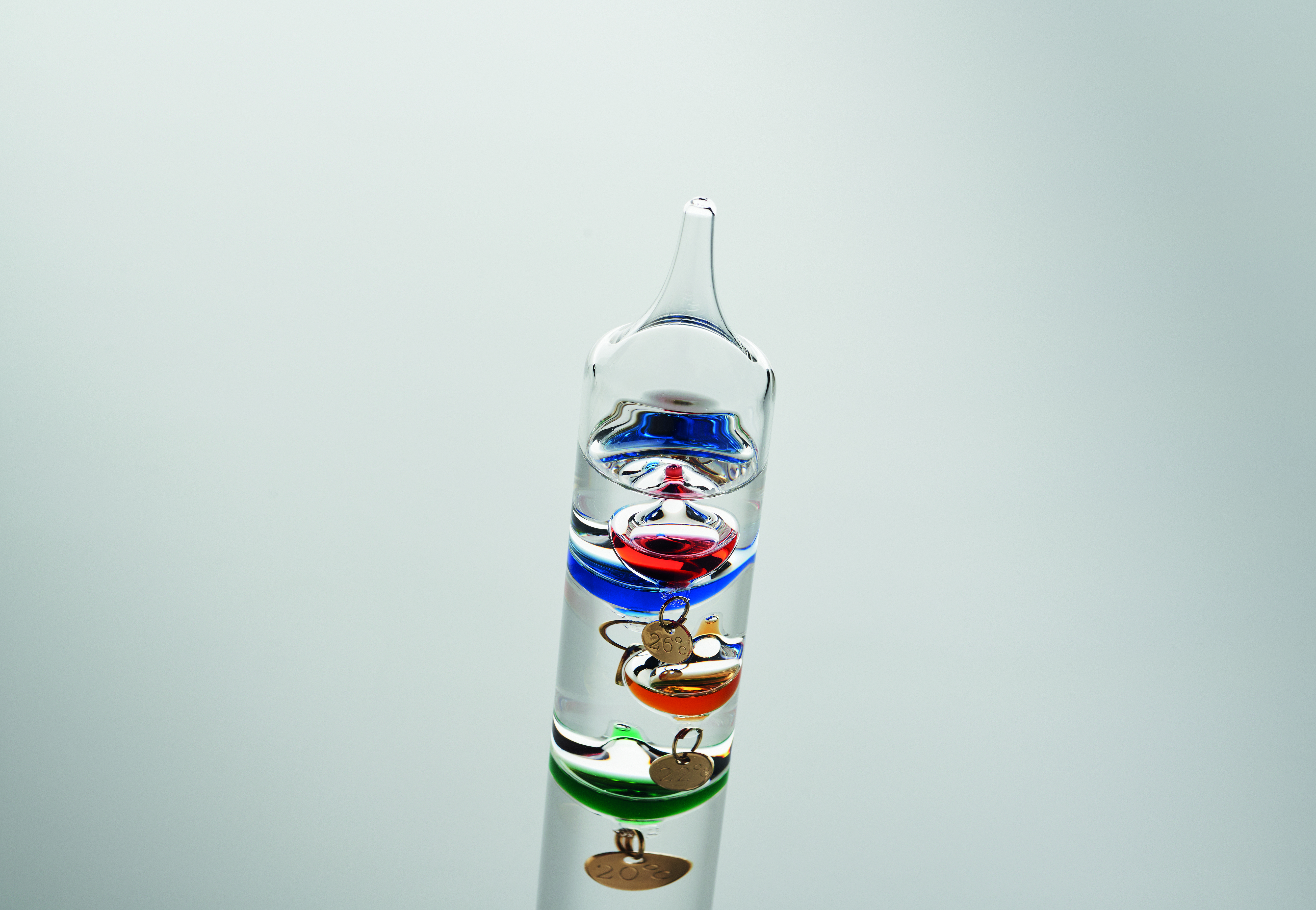 Szklany termometr Galileo z pięcioma kolorowymi pływającymi kulami. Każda kula wskazuje temperaturę od 18°c do 26°: Czerwona - 26°, Niebieska - 24°, Pomarańczowa - 22°, Zielona - 20° i Fioletowa - 18°. Najniższa kula w górnej grupie wskazuje temperaturę otoczenia.