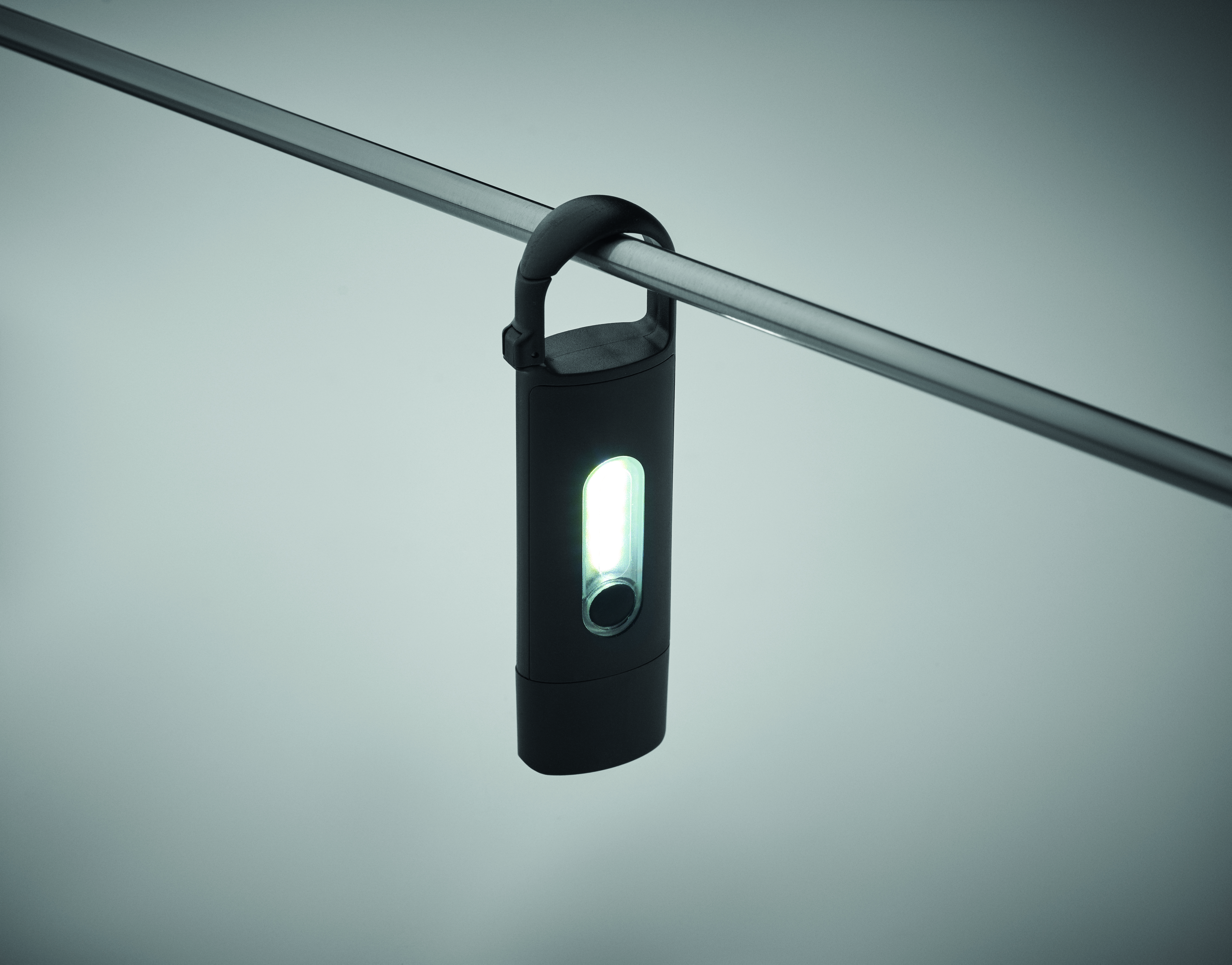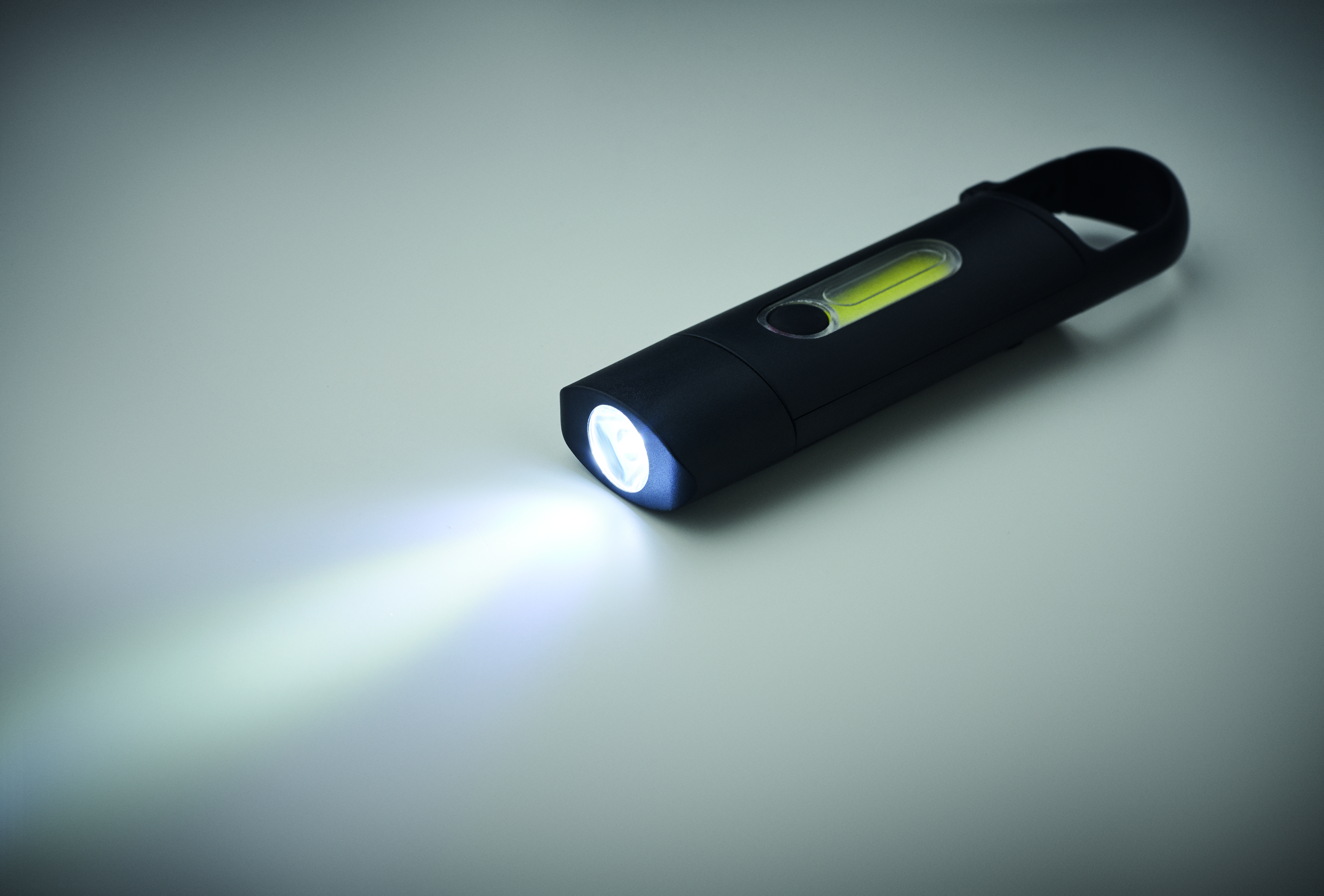 Kieszonkowa latarka akumulatorowa COB z karabińczykiem z tworzywa ABS. Światło awaryjne i 3 tryby oświetlenia. 1 x akumulator litowy 3,7 V, 200 mAh (w zestawie, niewymienialny).