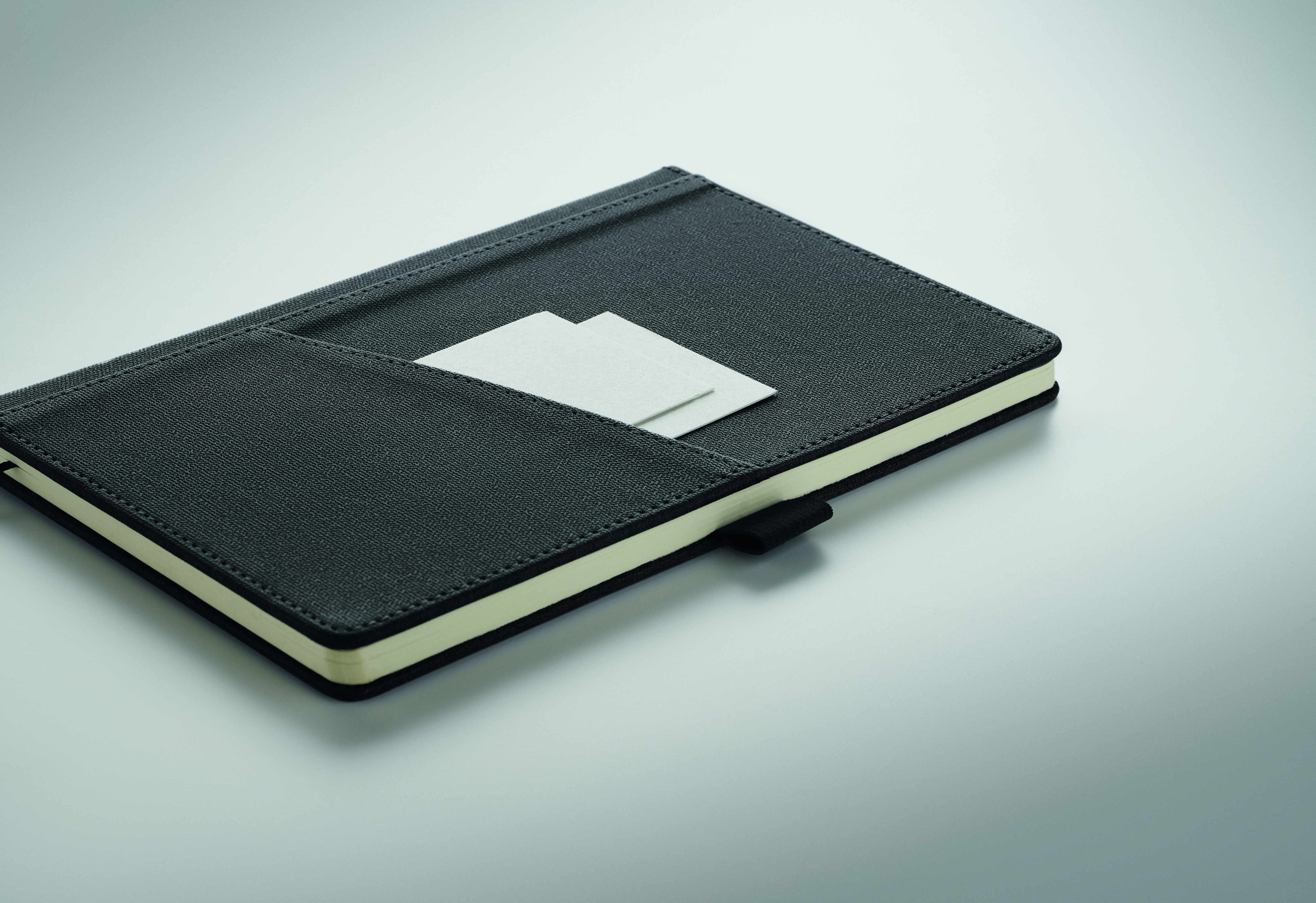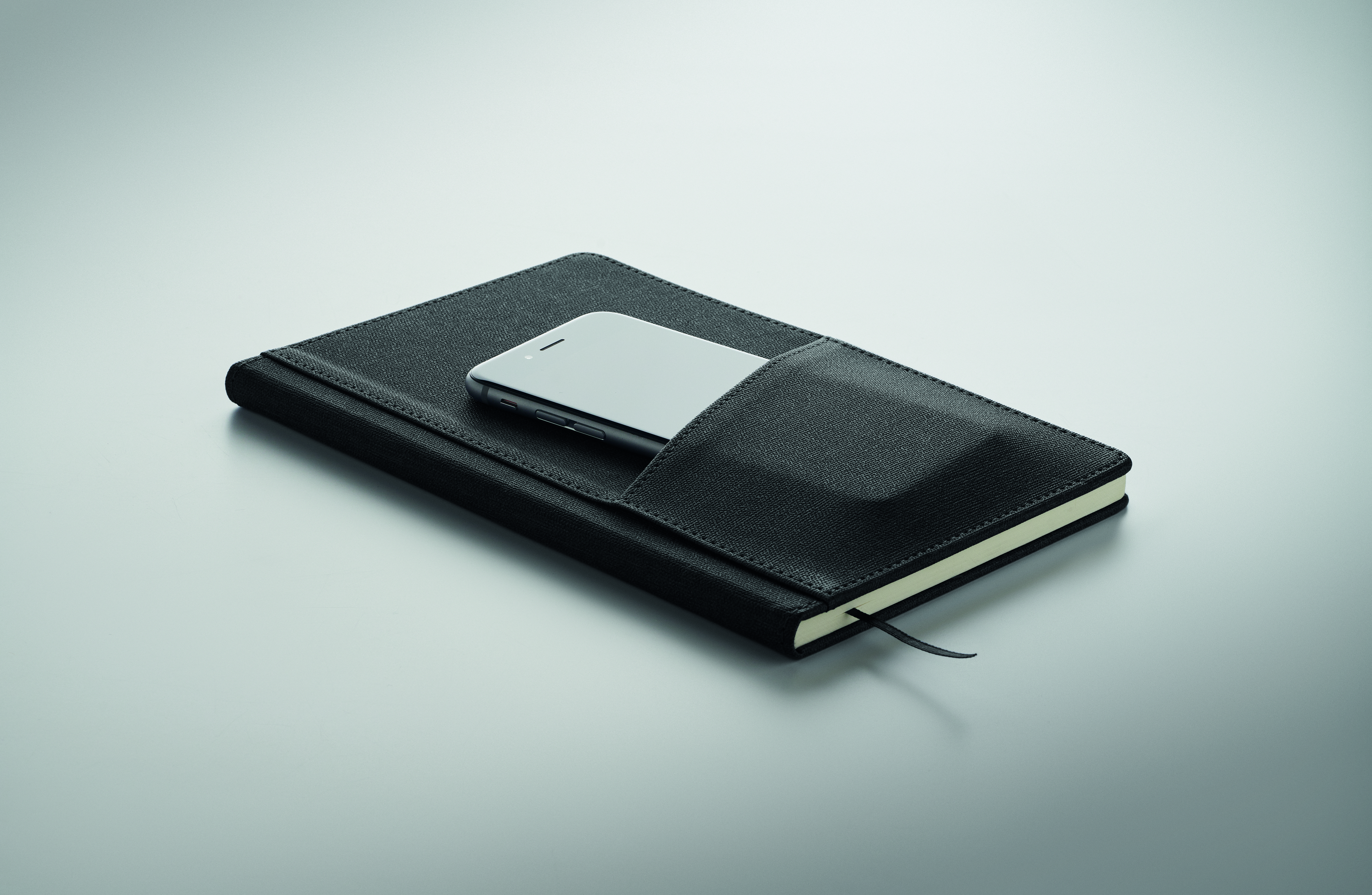 Notatnik A5 w twardej okładce z PU z kieszenią na telefon z przodu. Obwoluta. 160 stron w linie (80 kartek) z papieru z recyklingu. Dopasowana zakładka wstążkowa. FSC®-certified | FSC MIX CREDIT, P7.1, FSC-C213206