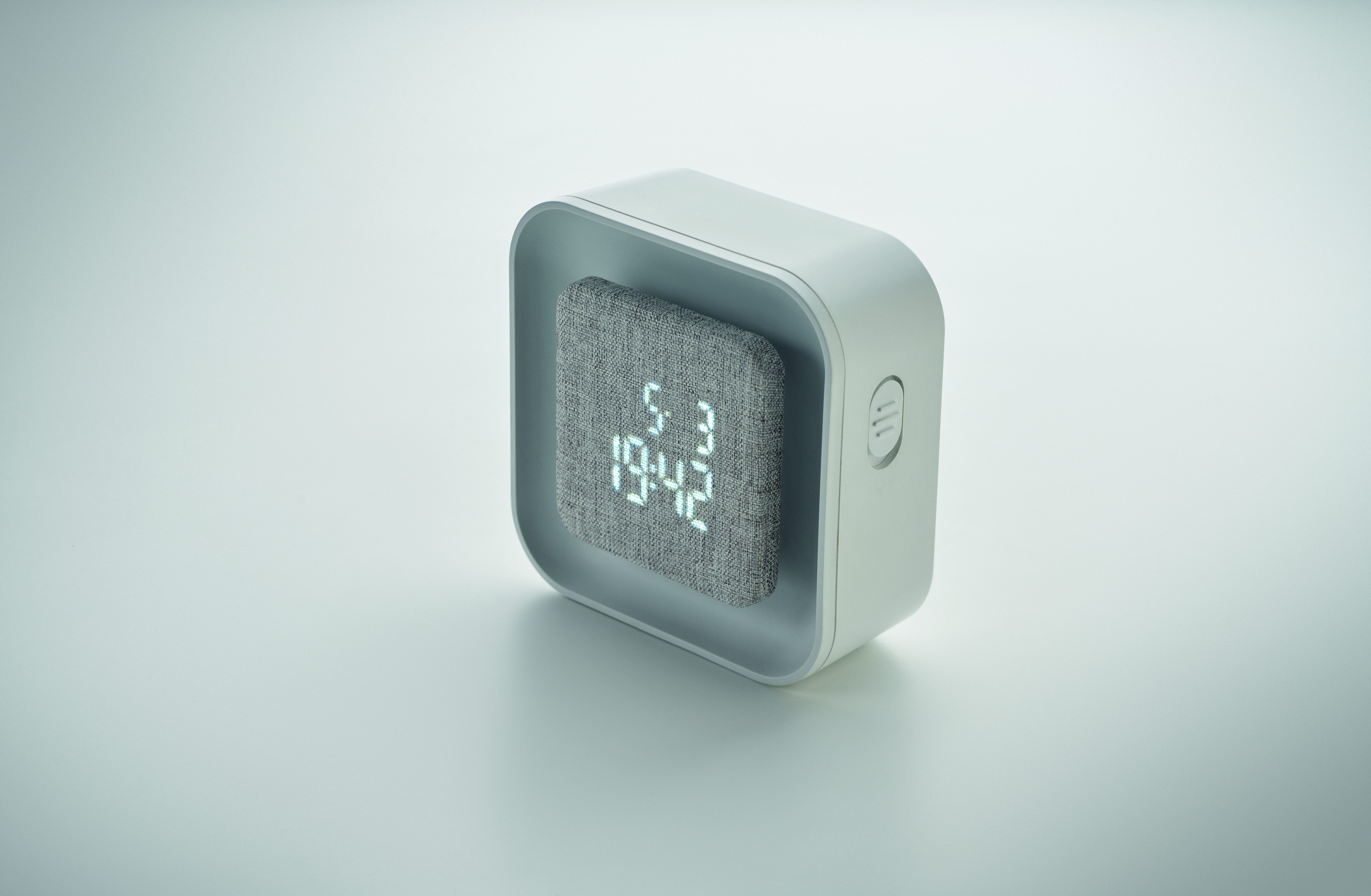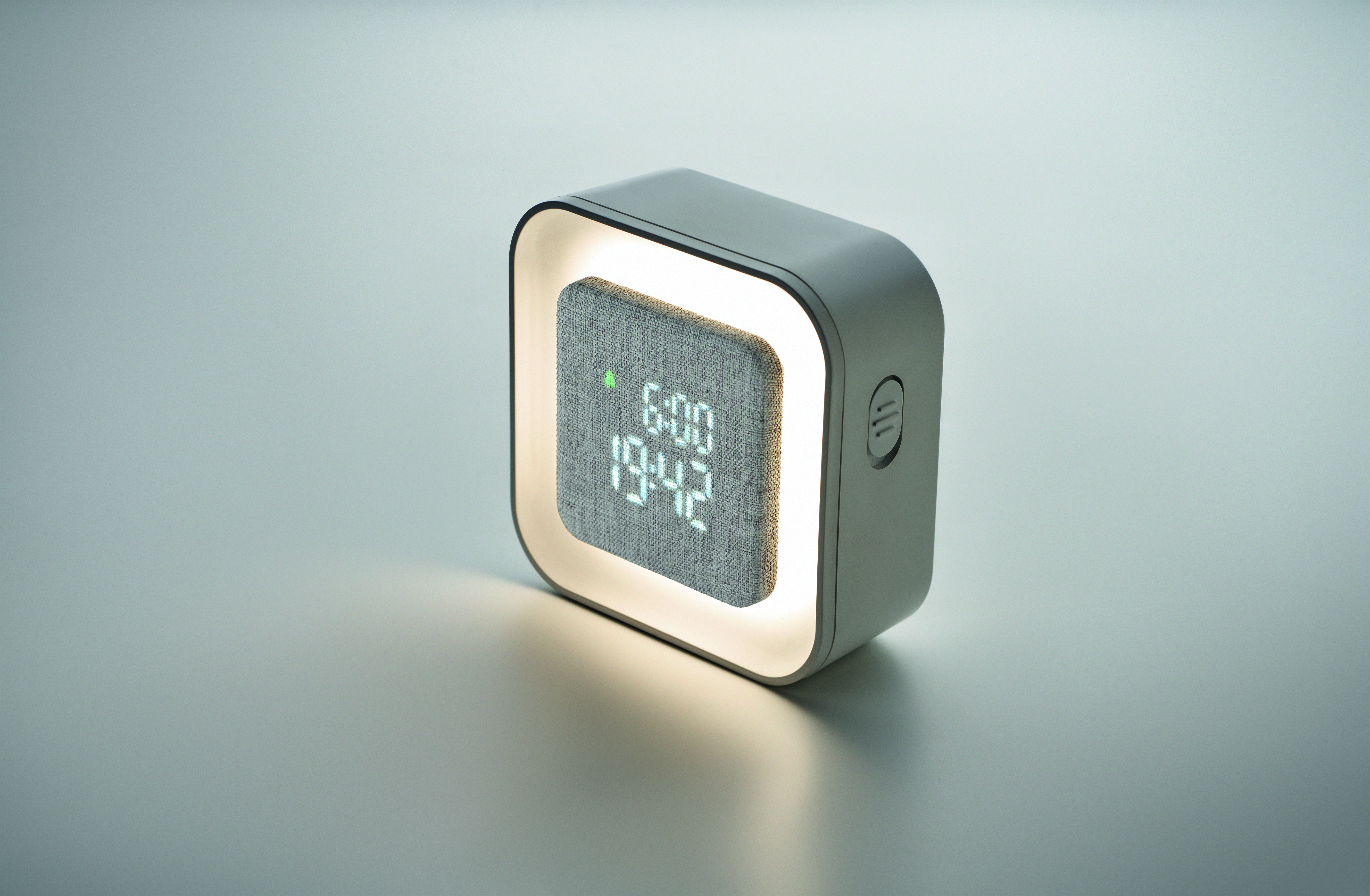 Budzik LED z tworzywa ABS i RPET pochodzącego z recyklingu. Wyświetlany tylko rok kalendarzowy tylko w trybie alarmu. Regulowane oświetlenie. Zasilanie bateryjne.