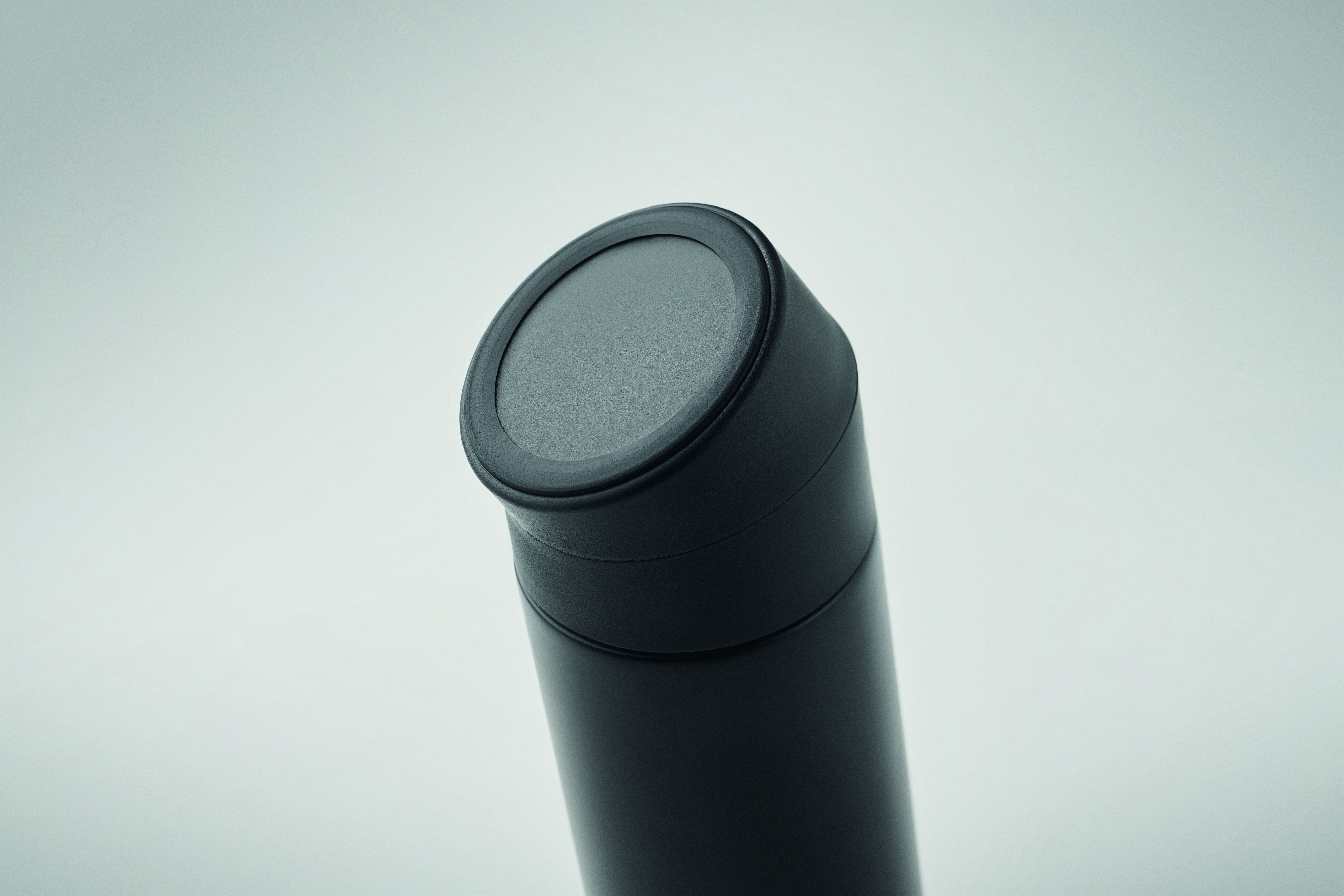 Dwuścienna butelka z izolacją próżniową z recyklingowanej stali nierdzewnej (90% z recyklingowanej stali nierdzewnej i 10% ze stali nierdzewnej) z silikonową, antypoślizgową zakrętką z uchwytem na telefon. Pojemność: 420 ml.
