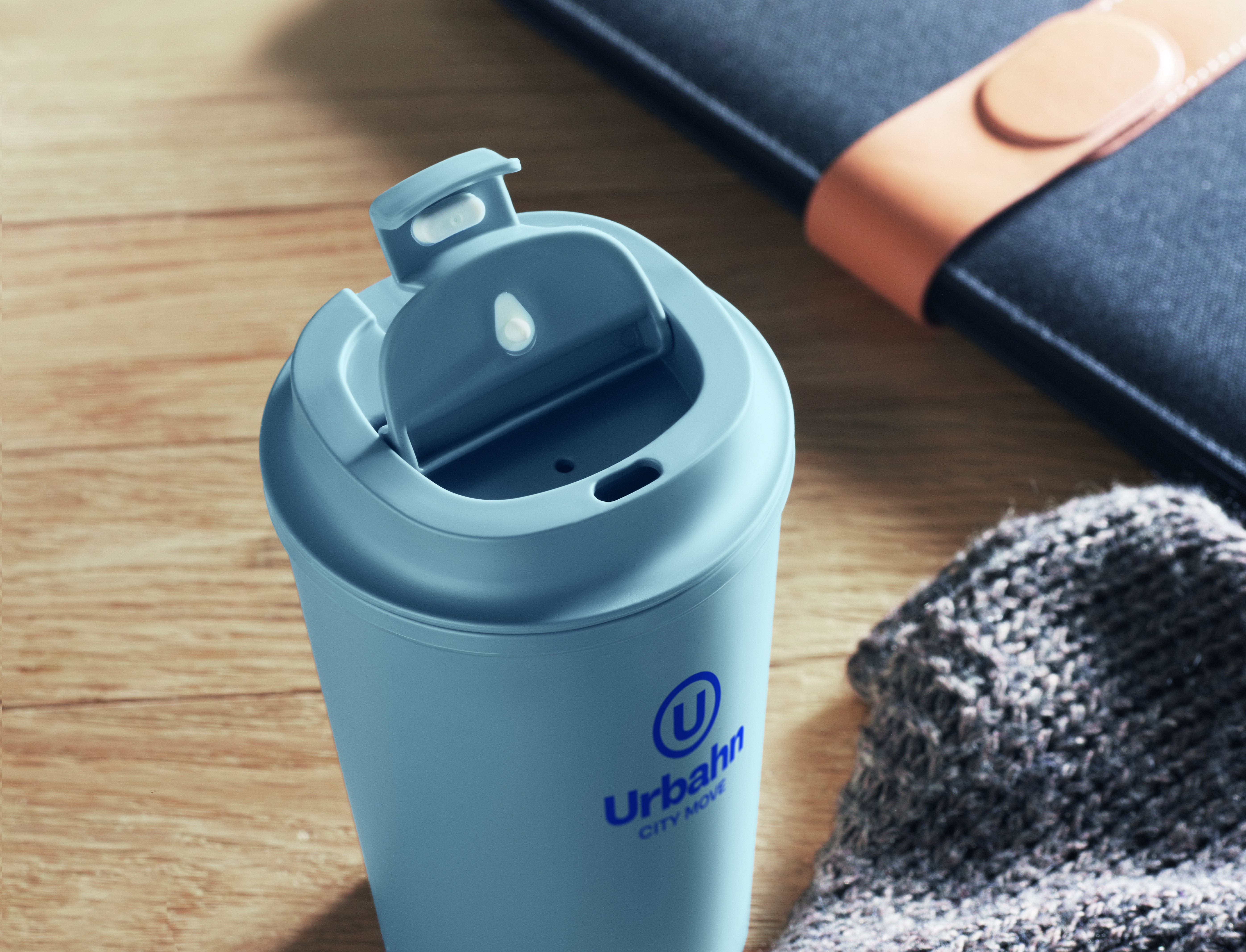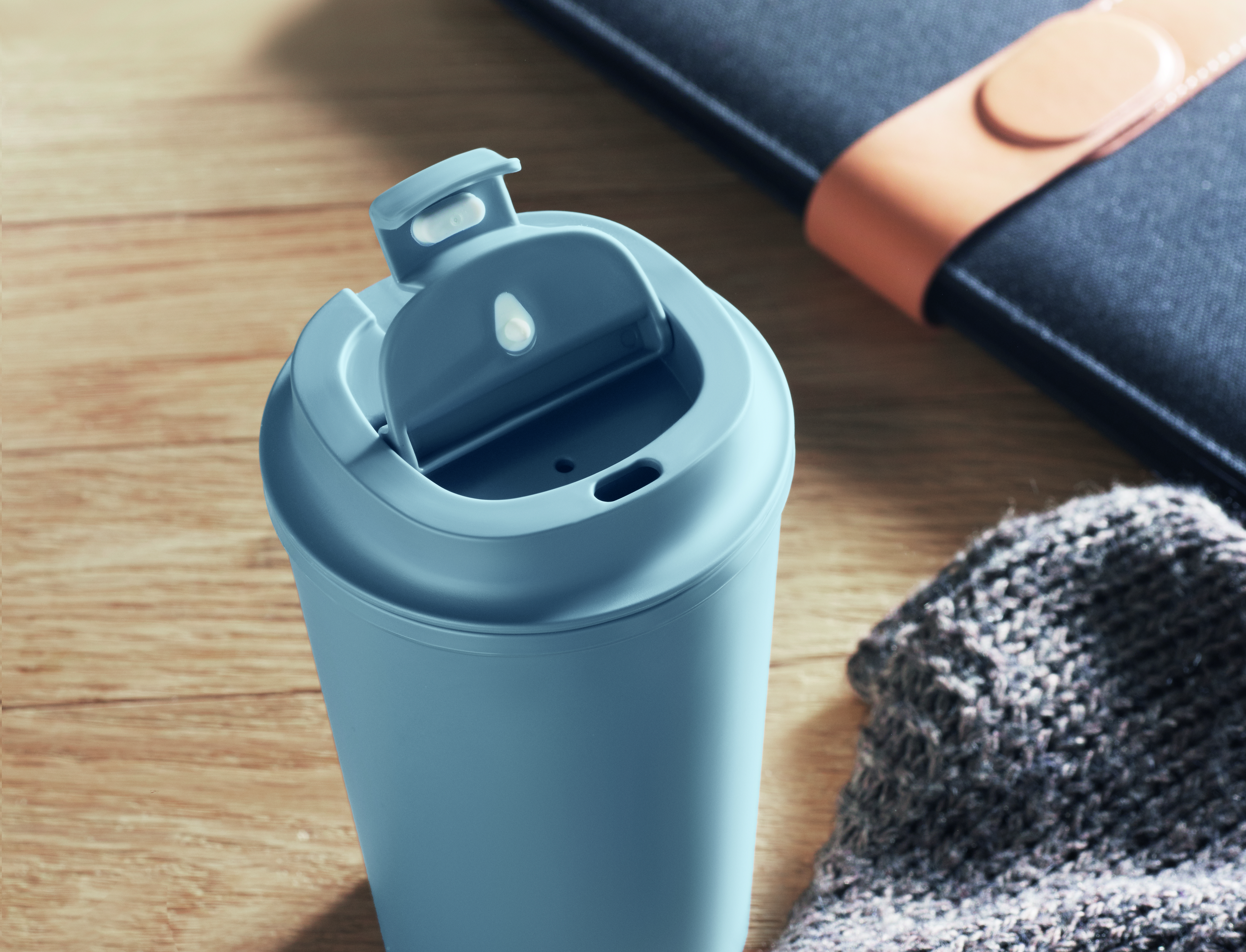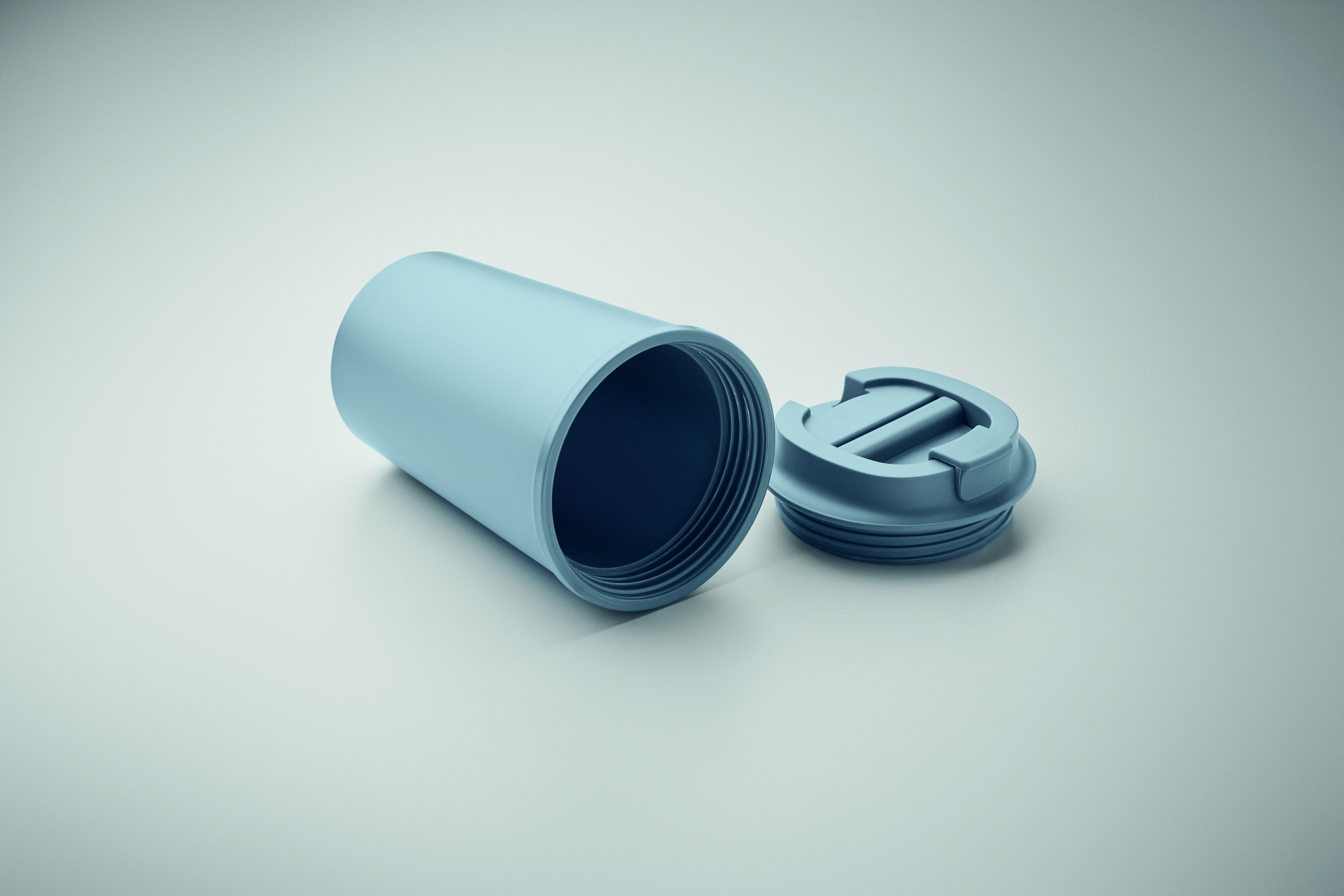 Kubek z podwójnymi ściankami z kukurydzy PLA z pokrywką do picia z PP z wewnętrznym TPR. Pojemność: 350 ml.