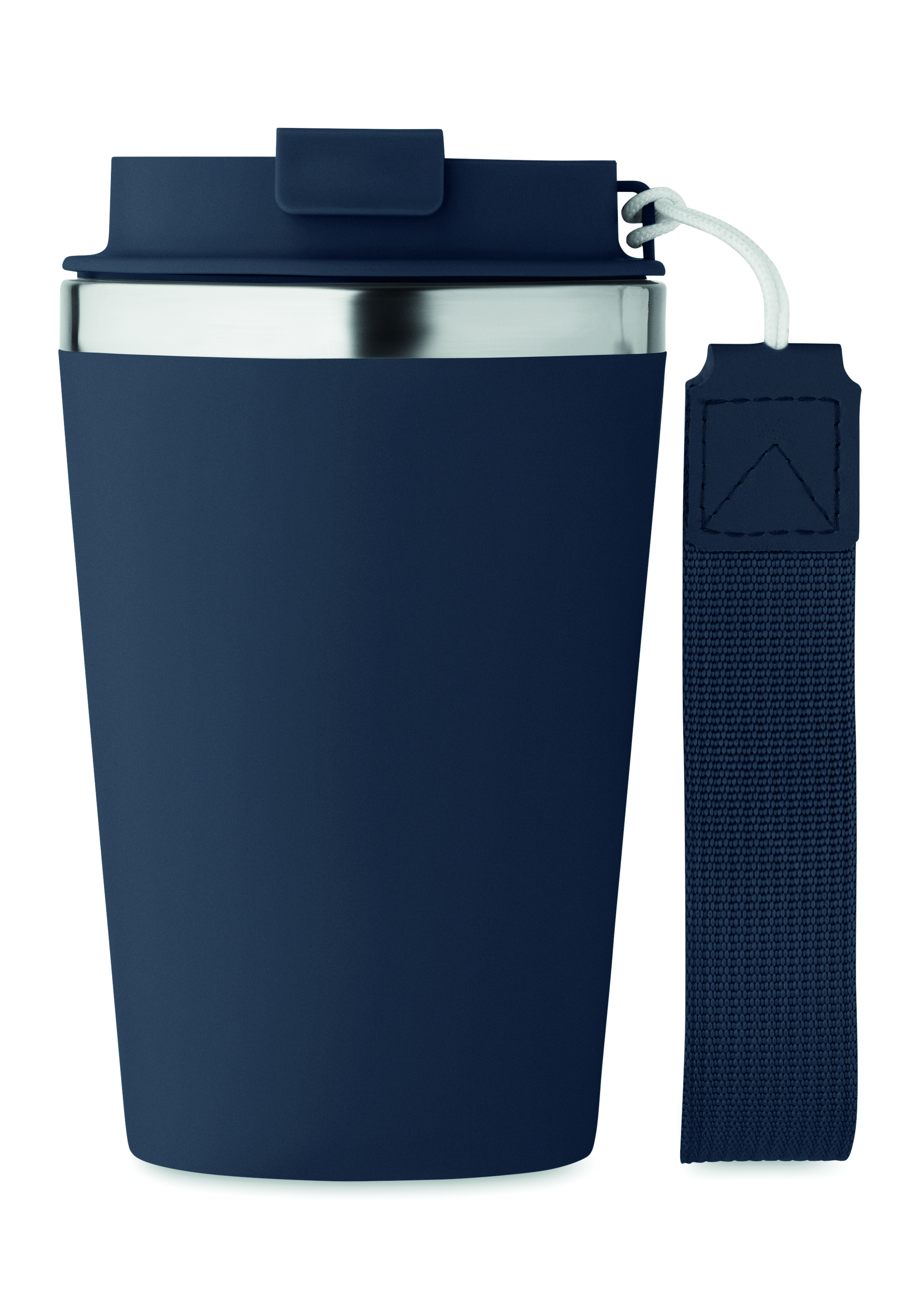 Kubek z podwójnymi ściankami z recyklingowanej stali nierdzewnej (90% recyklingowanej stali nierdzewnej i 10% stali nierdzewnej) z zewnętrzną warstwą z PP i paskiem na nadgarstek z RPET. Pojemność: 350 ml.