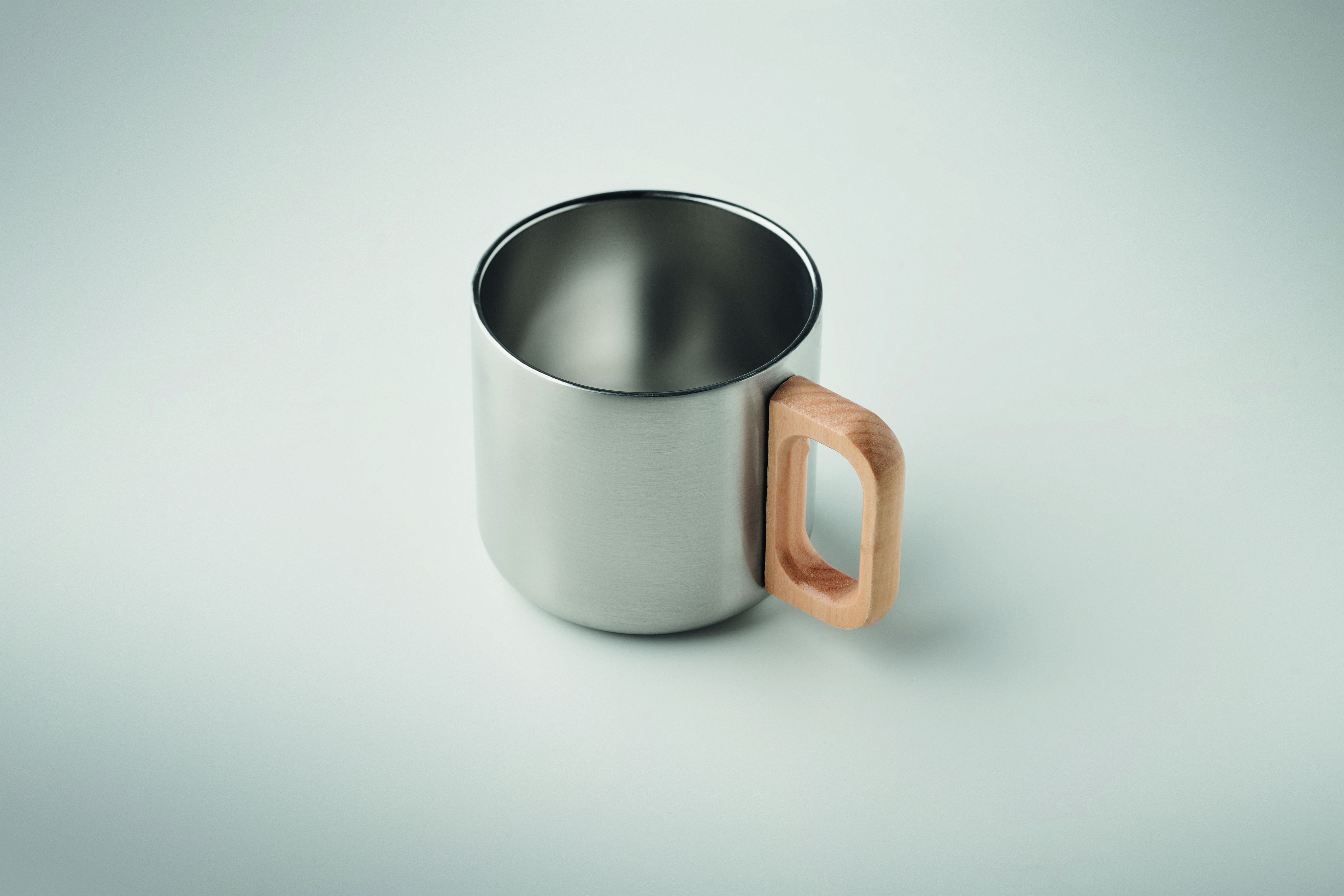 Kubek z podwójnymi ściankami z przetworzonej stali nierdzewnej (90% przetworzonej stali nierdzewnej i 10% stali nierdzewnej) z drewnianym uchwytem. Pojemność: 350 ml.
