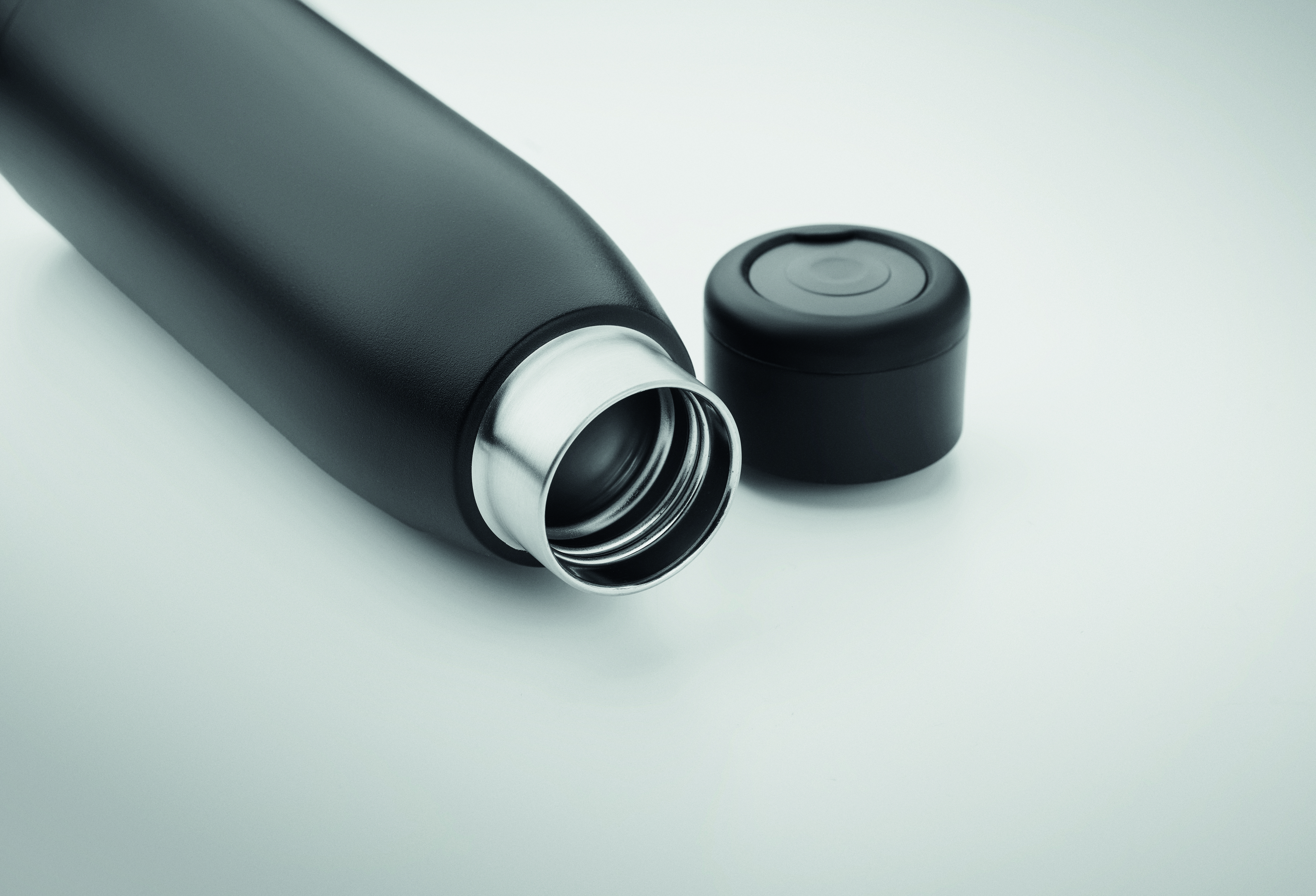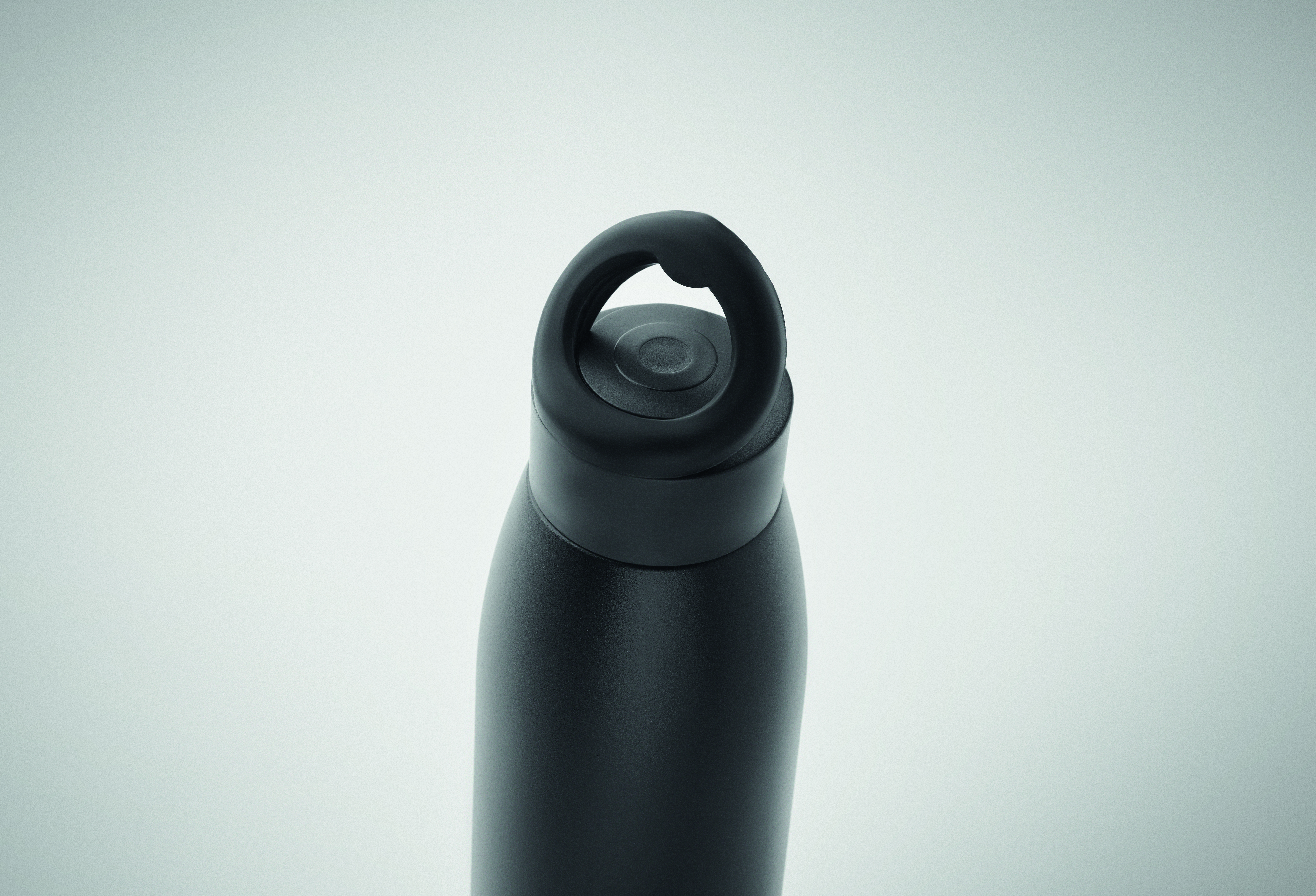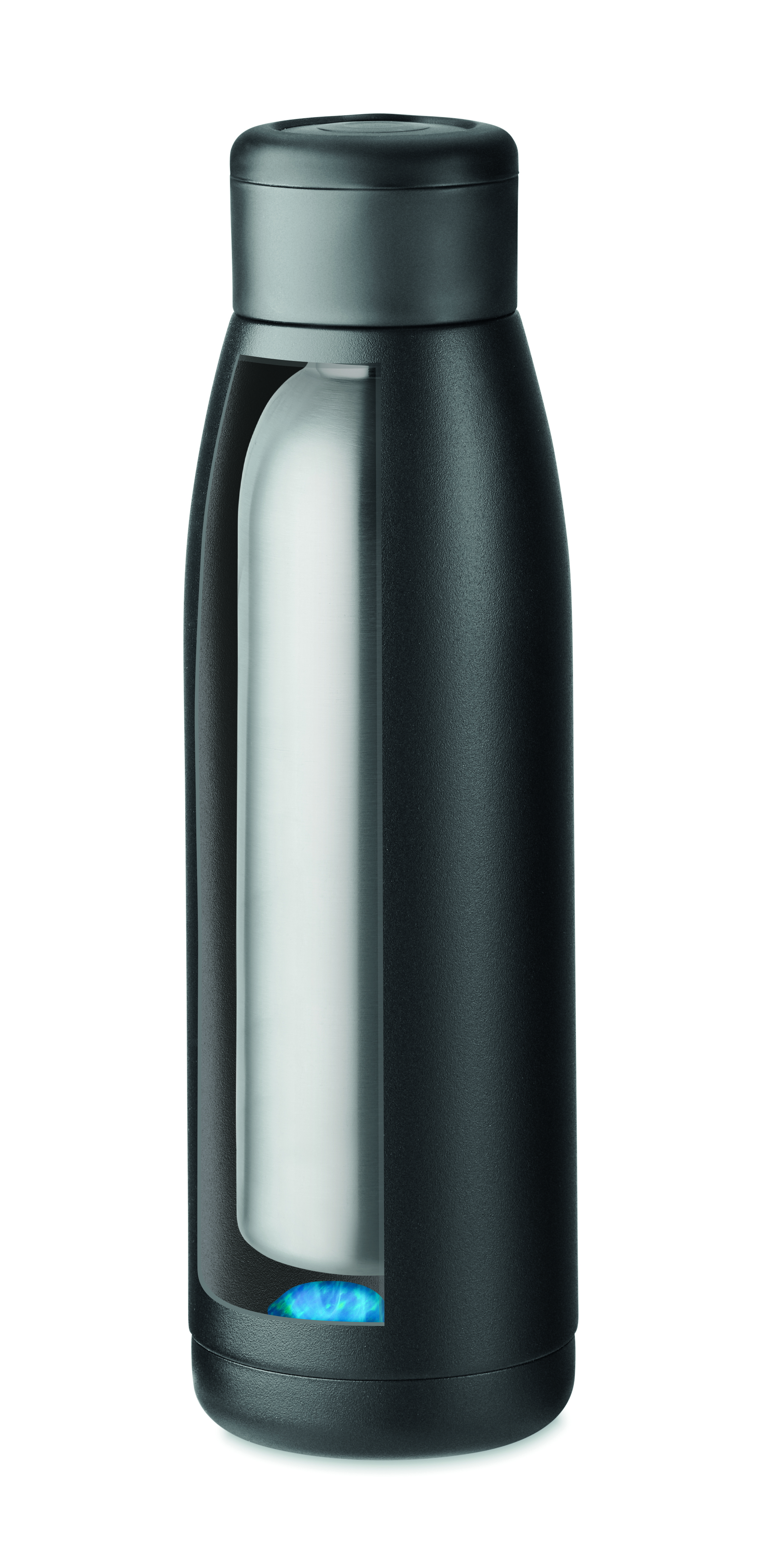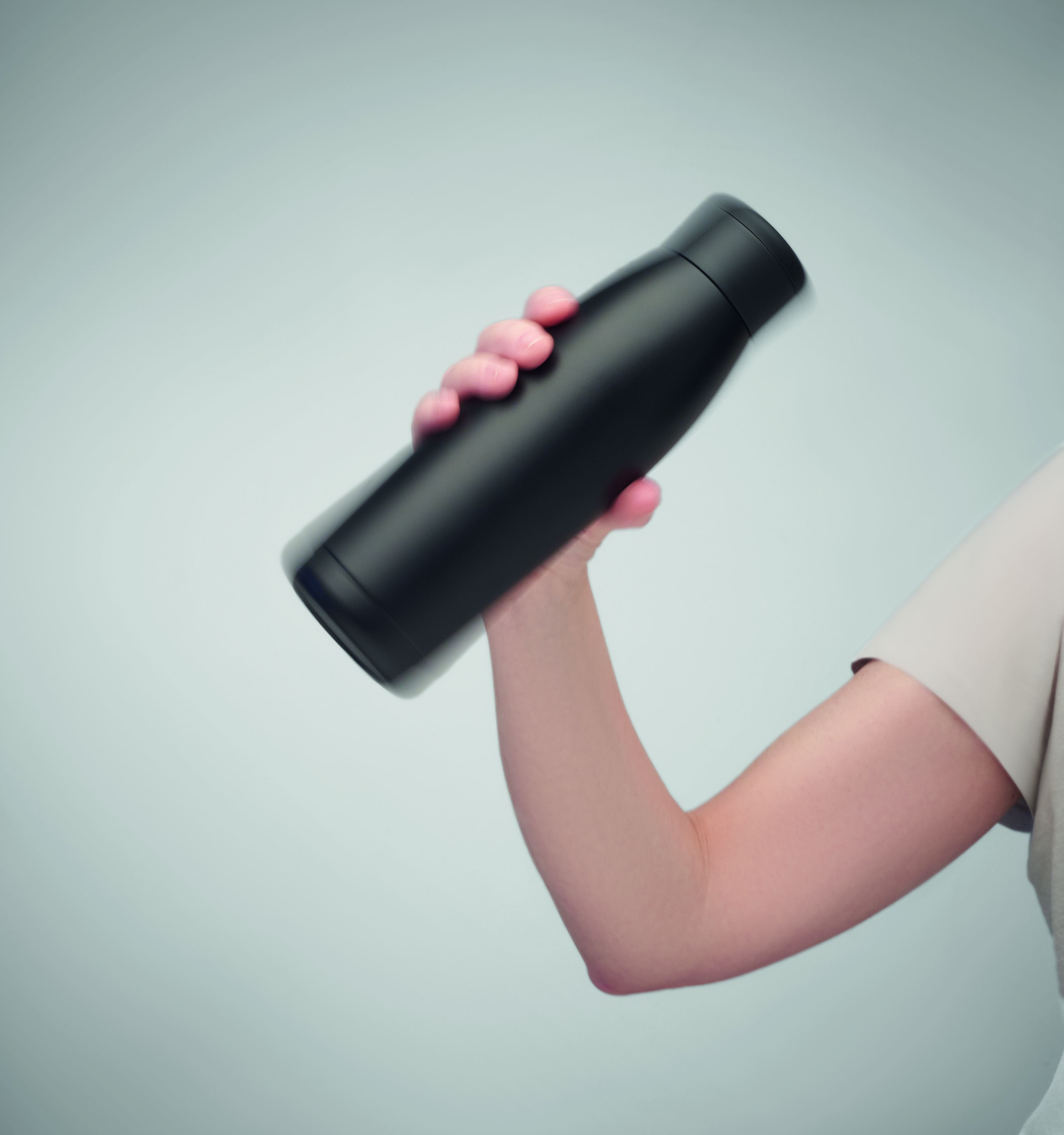 Dwuścienna butelka (90% z recyklingowanej stali nierdzewnej i 10% ze stali nierdzewnej) z silikonową pokrywką. Wystarczy potrząsnąć, aby temperatura powierzchni zmieniła się na ogrzewanie lub chłodzenie, w zależności od płynu znajdującego się w środku. 400 ml.