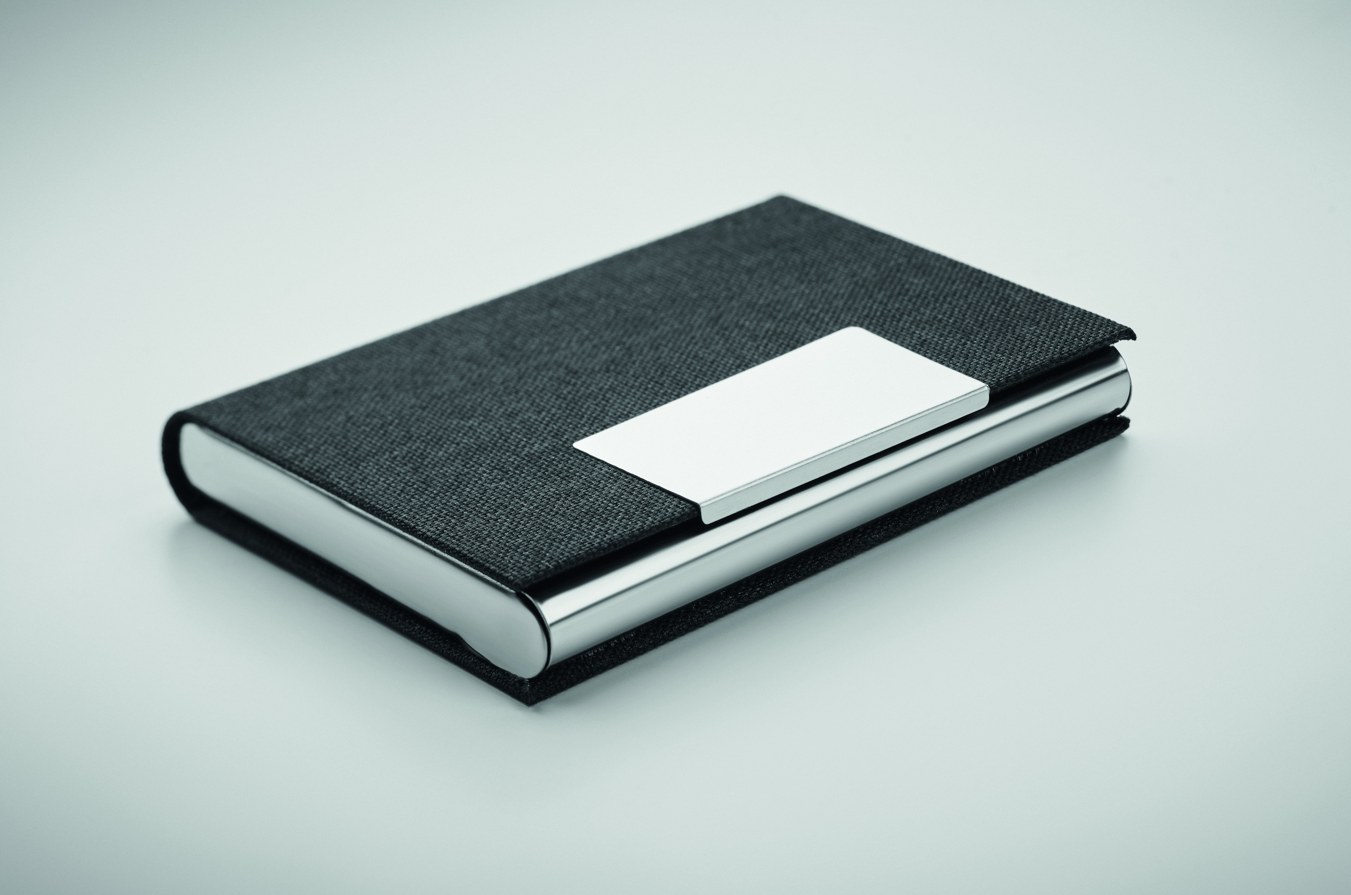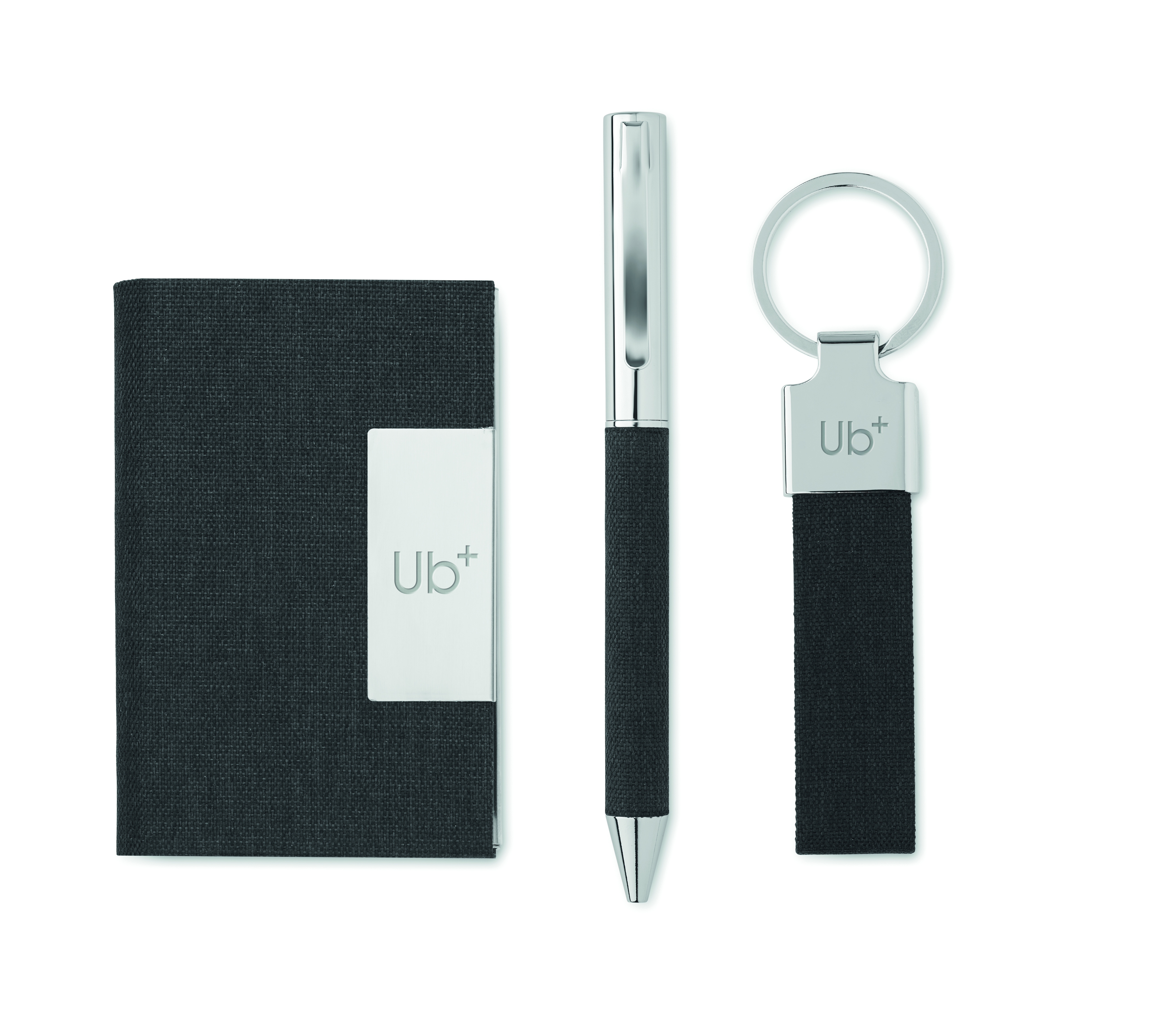3-częściowy zestaw upominkowy w pudełku. Zawiera metalowy przekręcany długopis z detalami z poliestru RPET, brelok do kluczy z poliestru RPET i etui na karty z poliestru RPET z metalową płytką. Niebieski tusz.