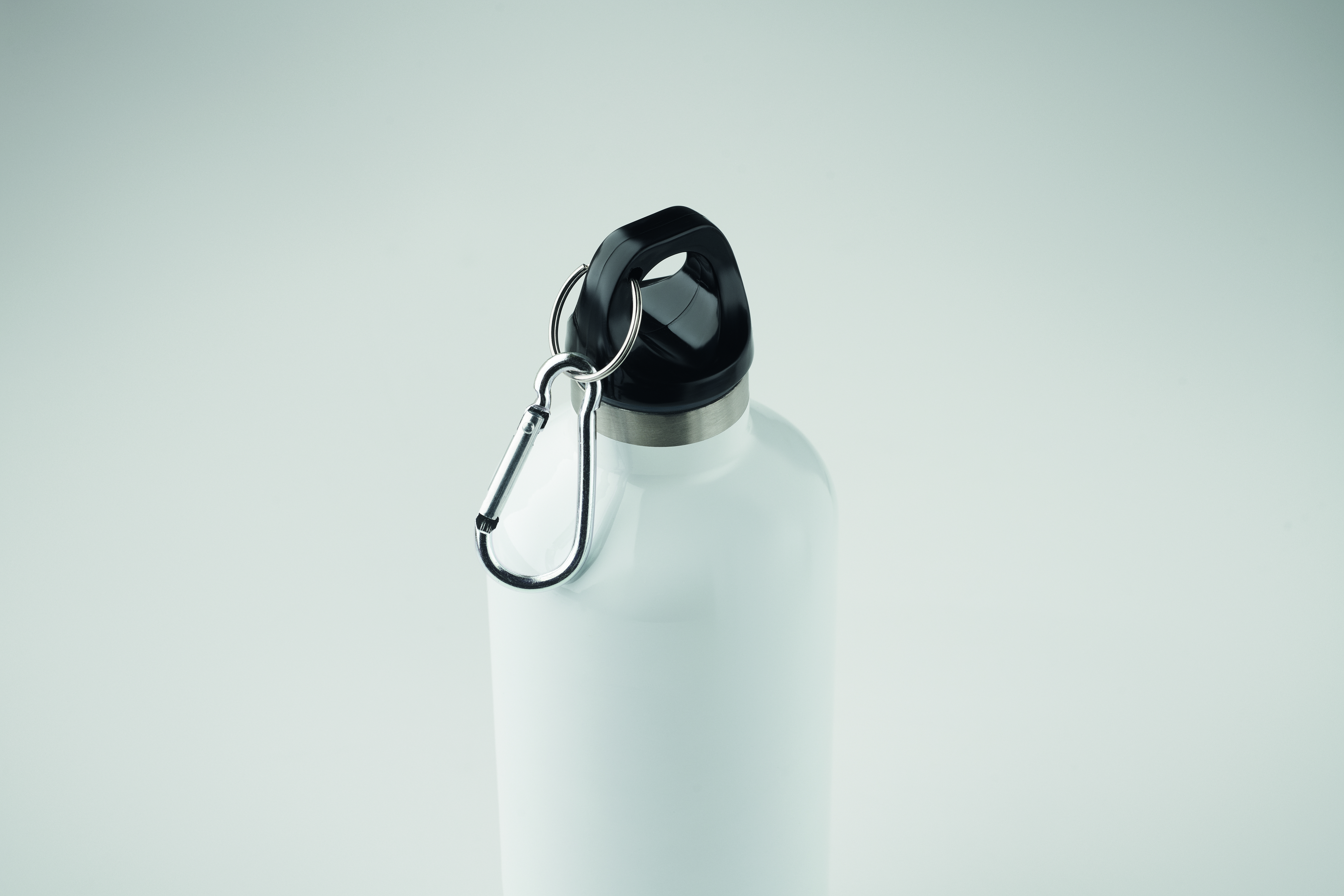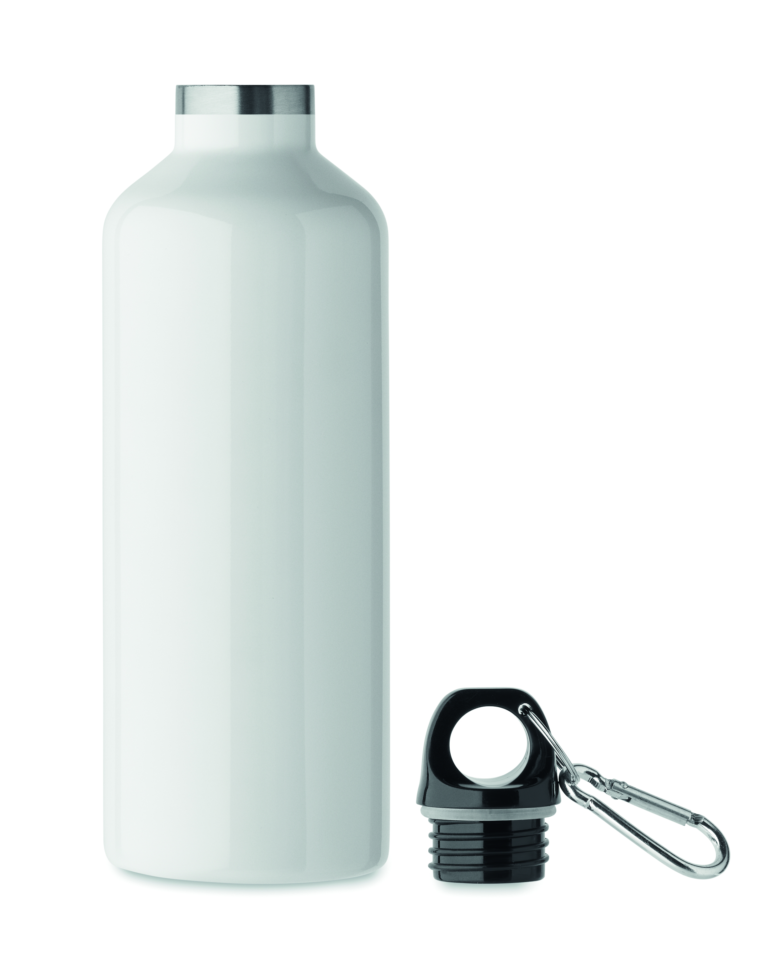 Dwuścienna butelka z izolacją próżniową wykonana ze stali nierdzewnej z recyklingu (90% stali nierdzewnej z recyklingu i 10% stali nierdzewnej) z zakrętką z karabińczykiem. Pojemność: 500 ml.