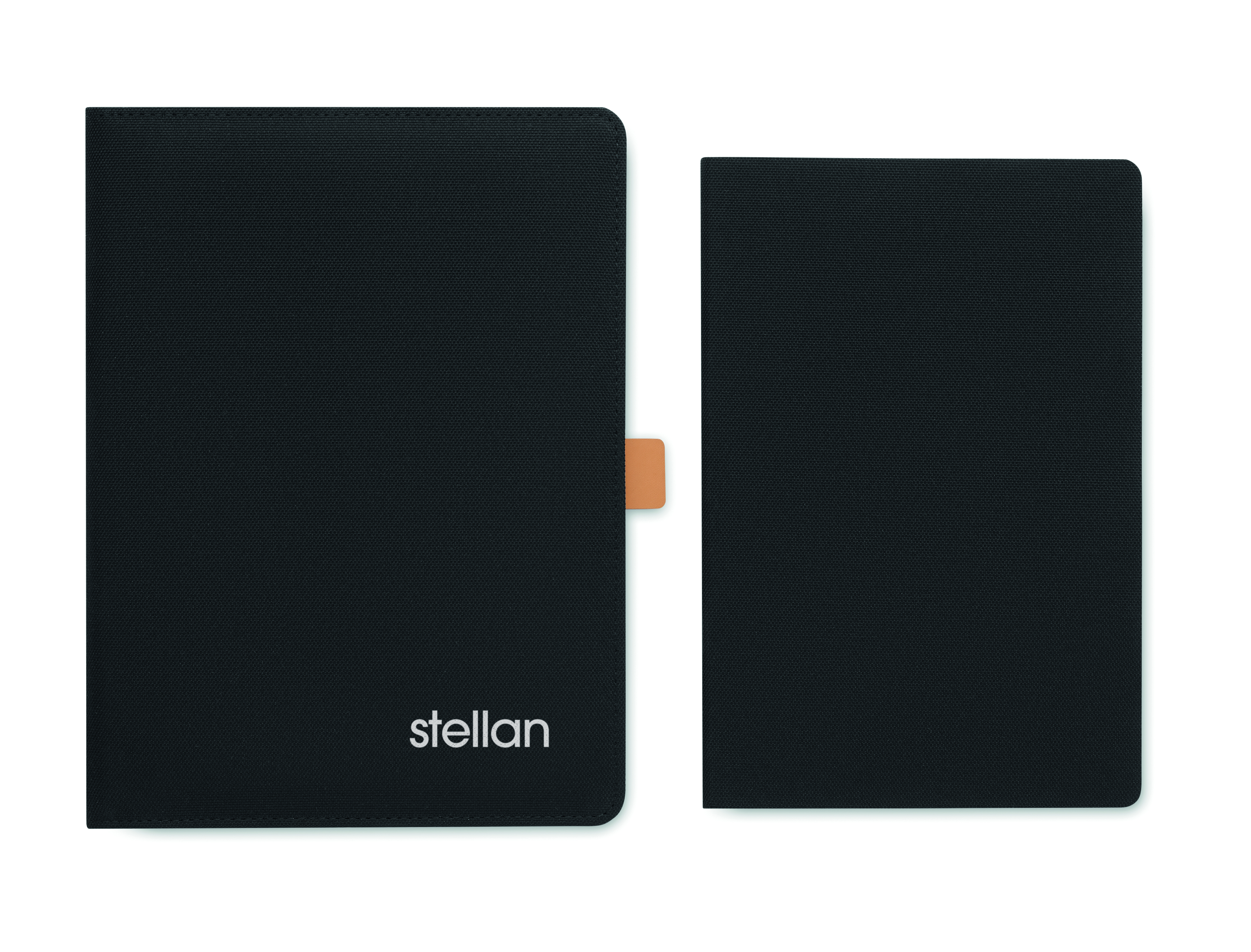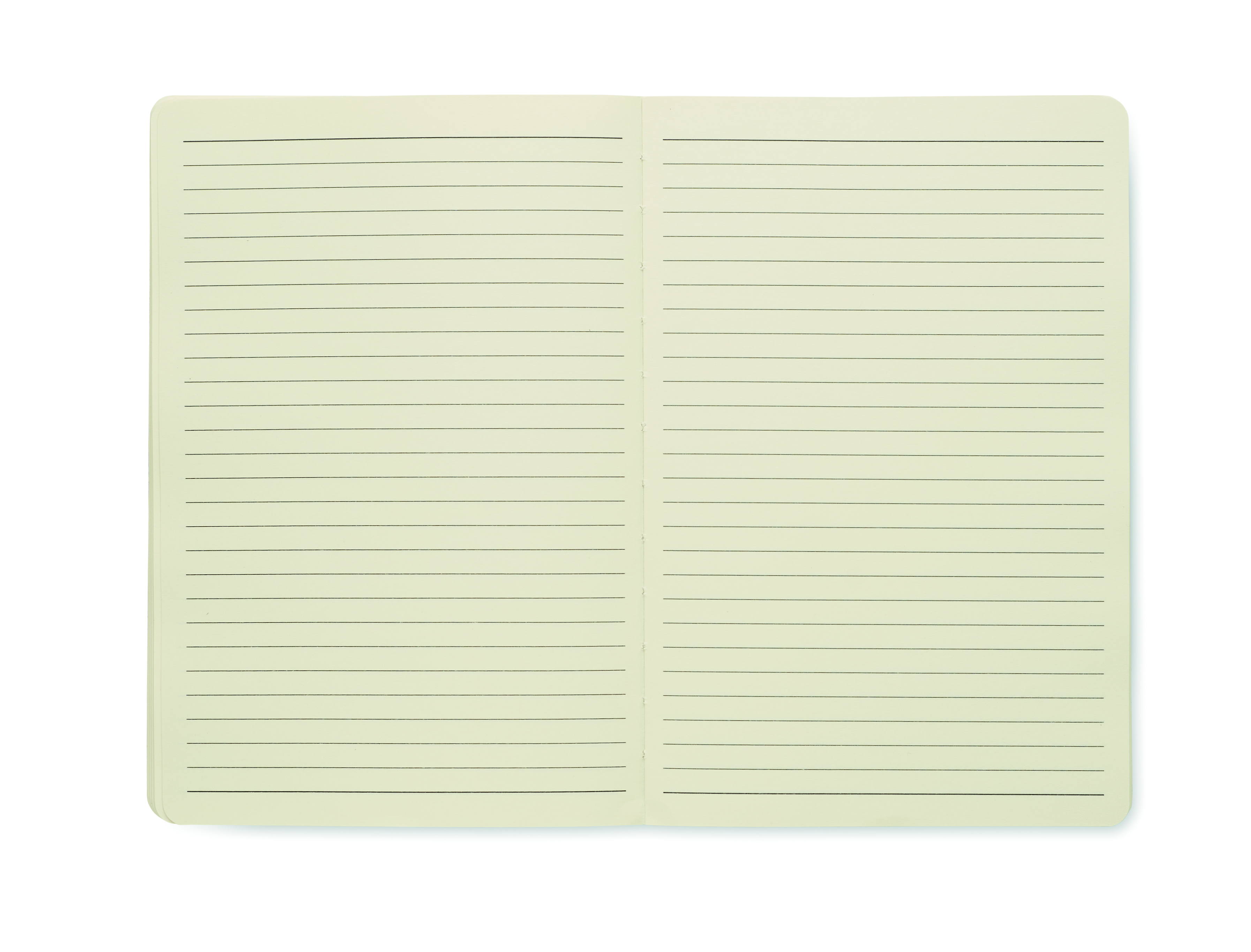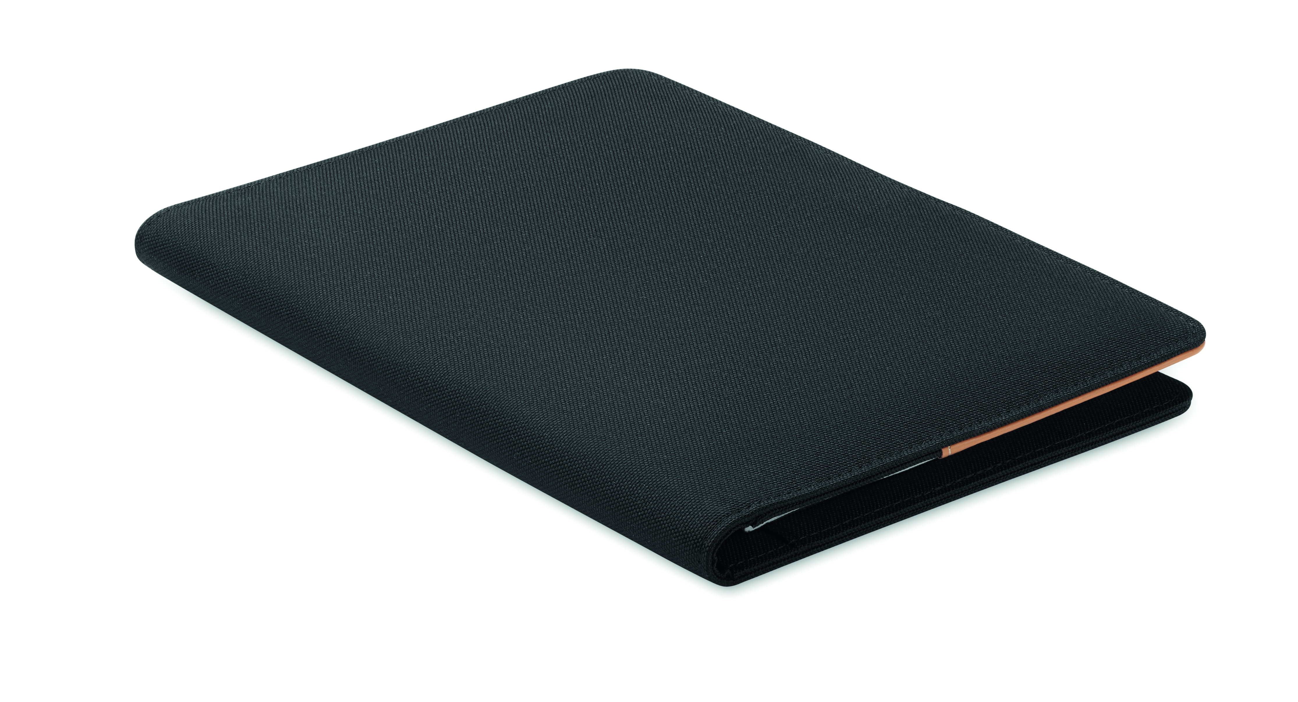 Teczka A5 z RPET z detalami ze sztucznej skóry. Notatnik A5 z twardą, korkową okładką. Oprawiony. 128 stron w linie z papieru z recyklingu (64 arkusze). Uchwyt na długopis. 2 kieszonki na karty i jedna duża przegroda. Elastyczny pasek, z metalowymi detalami. FSC®-certified | FSC MIX, P8.6, FSC-C213206