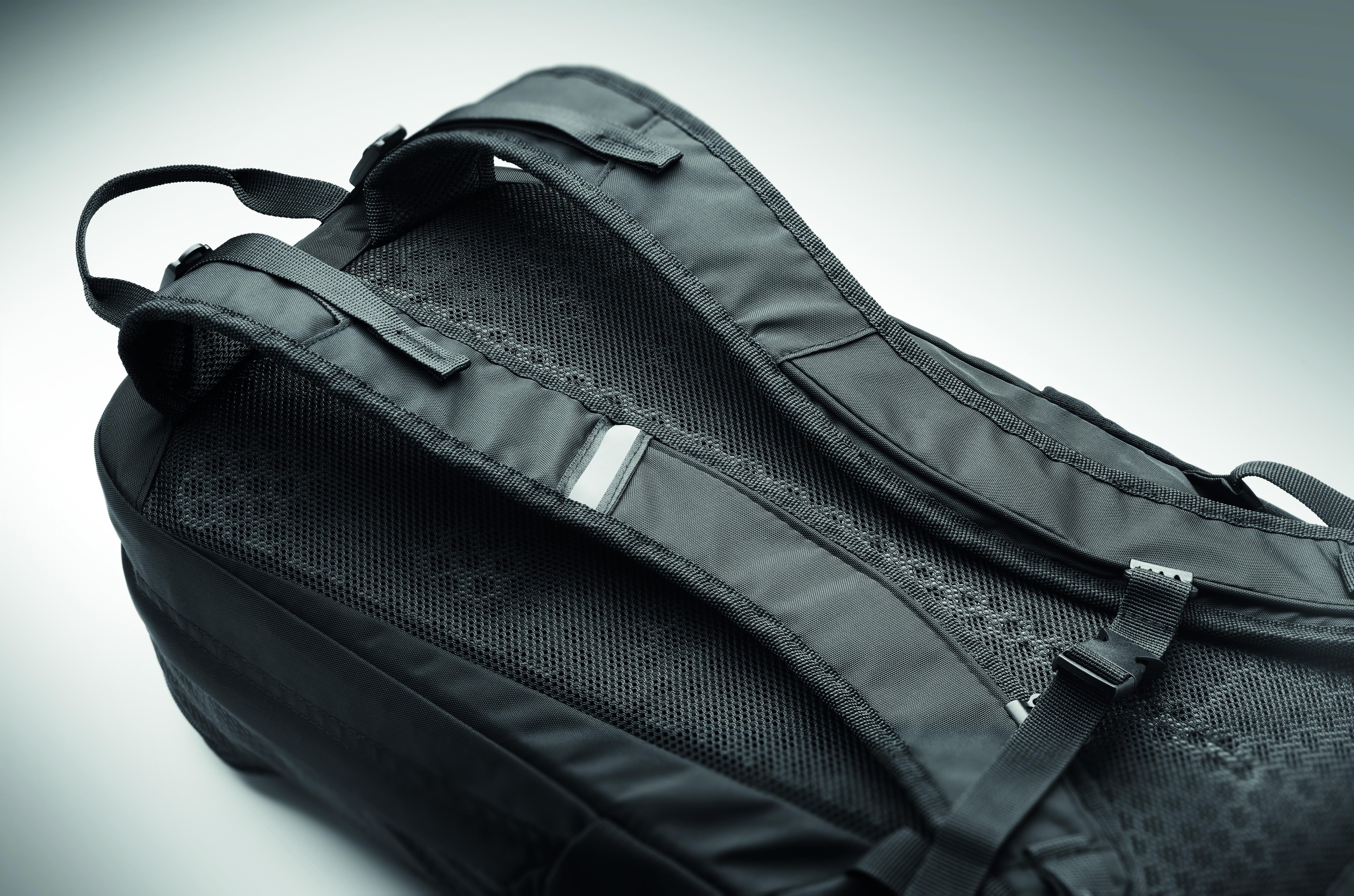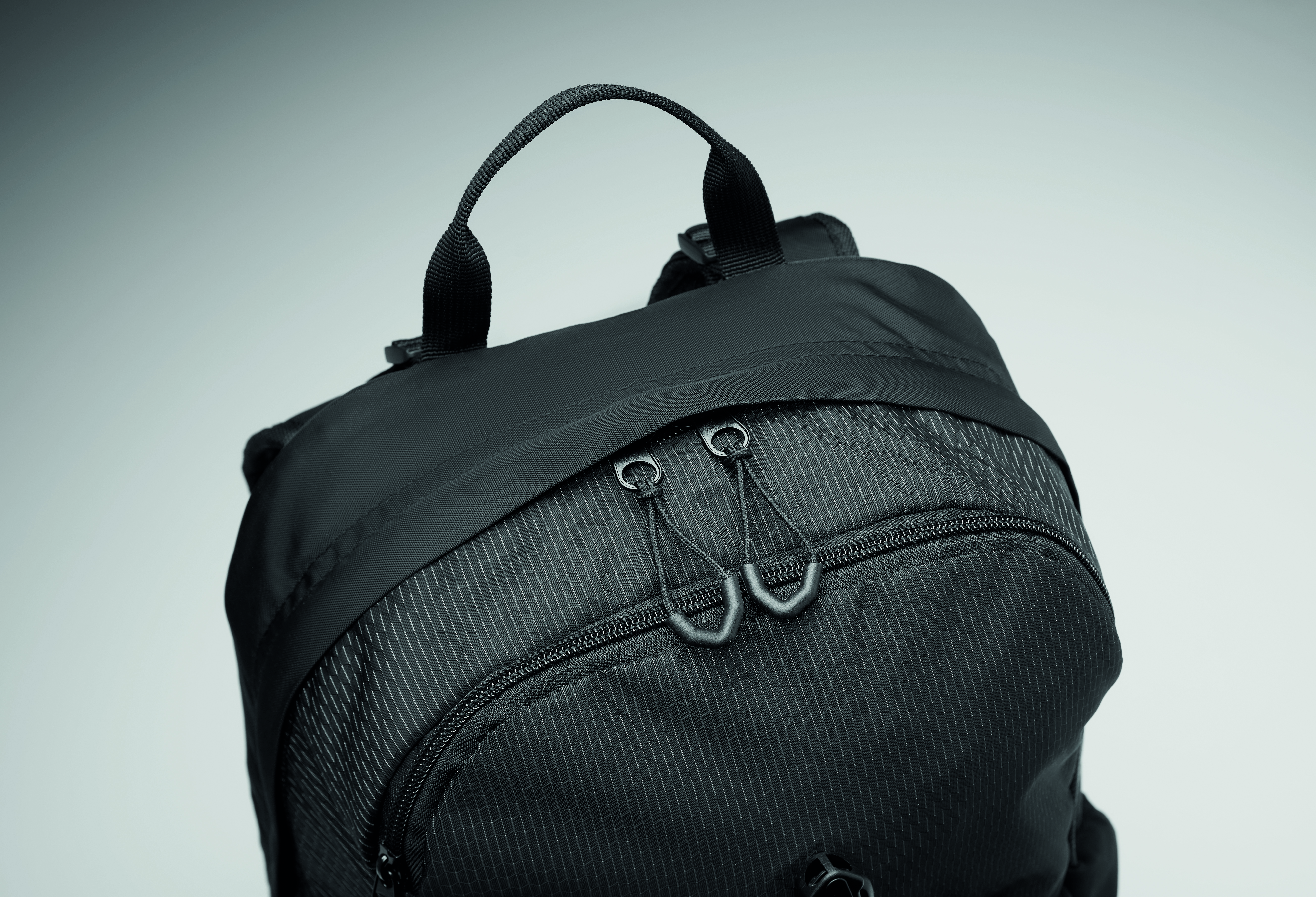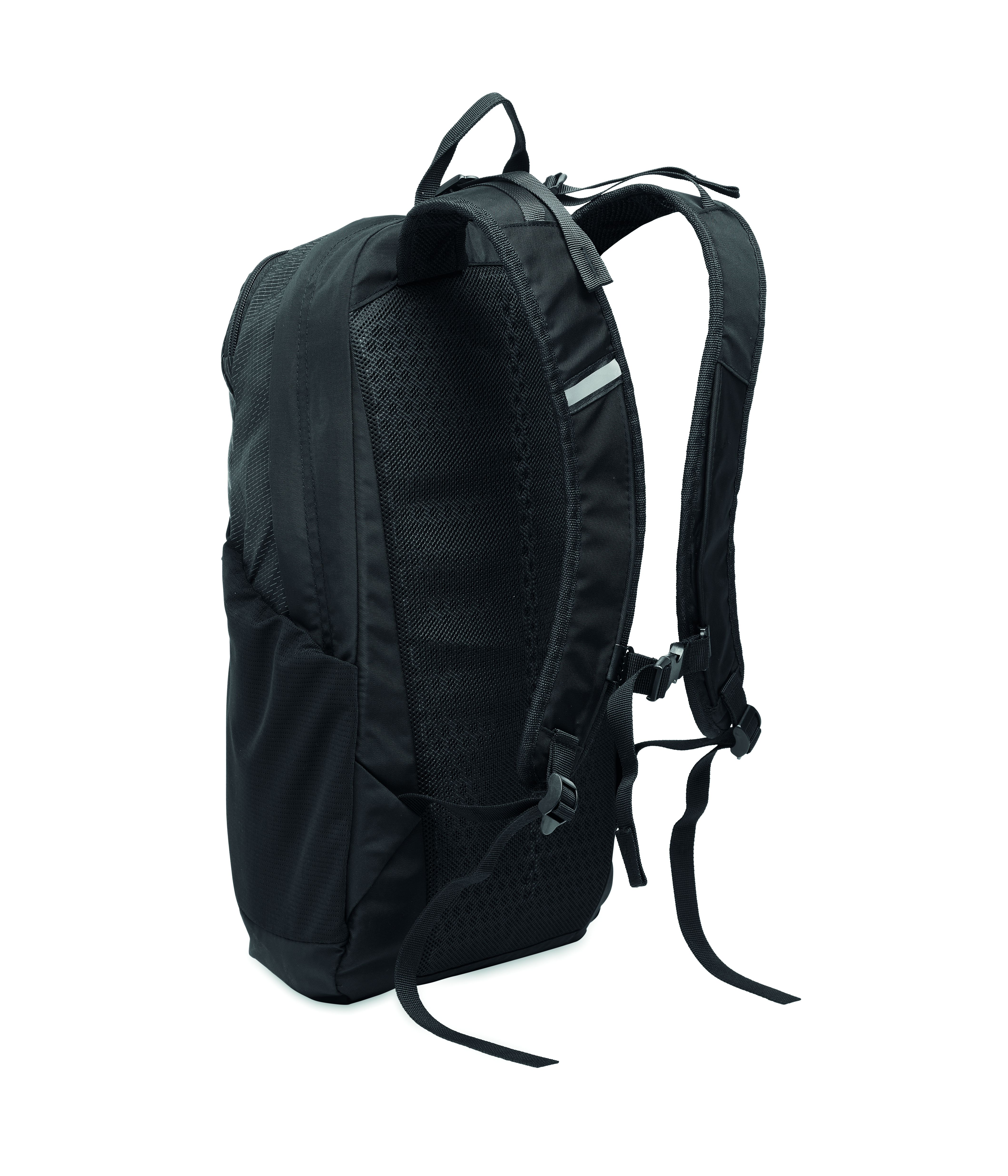 Plecak turystyczny 18L z wodoodpornego nylonu 420D z odblaskiem. Wewnętrzna przegroda na laptop 15 cali. Przednia komora na zamek i jedna przednia wsuwana kieszeń z zapięciem na klamrę. Dwie boczne wsuwane kieszenie. Wyściełane plecy i szelki. Wentylowany tył.