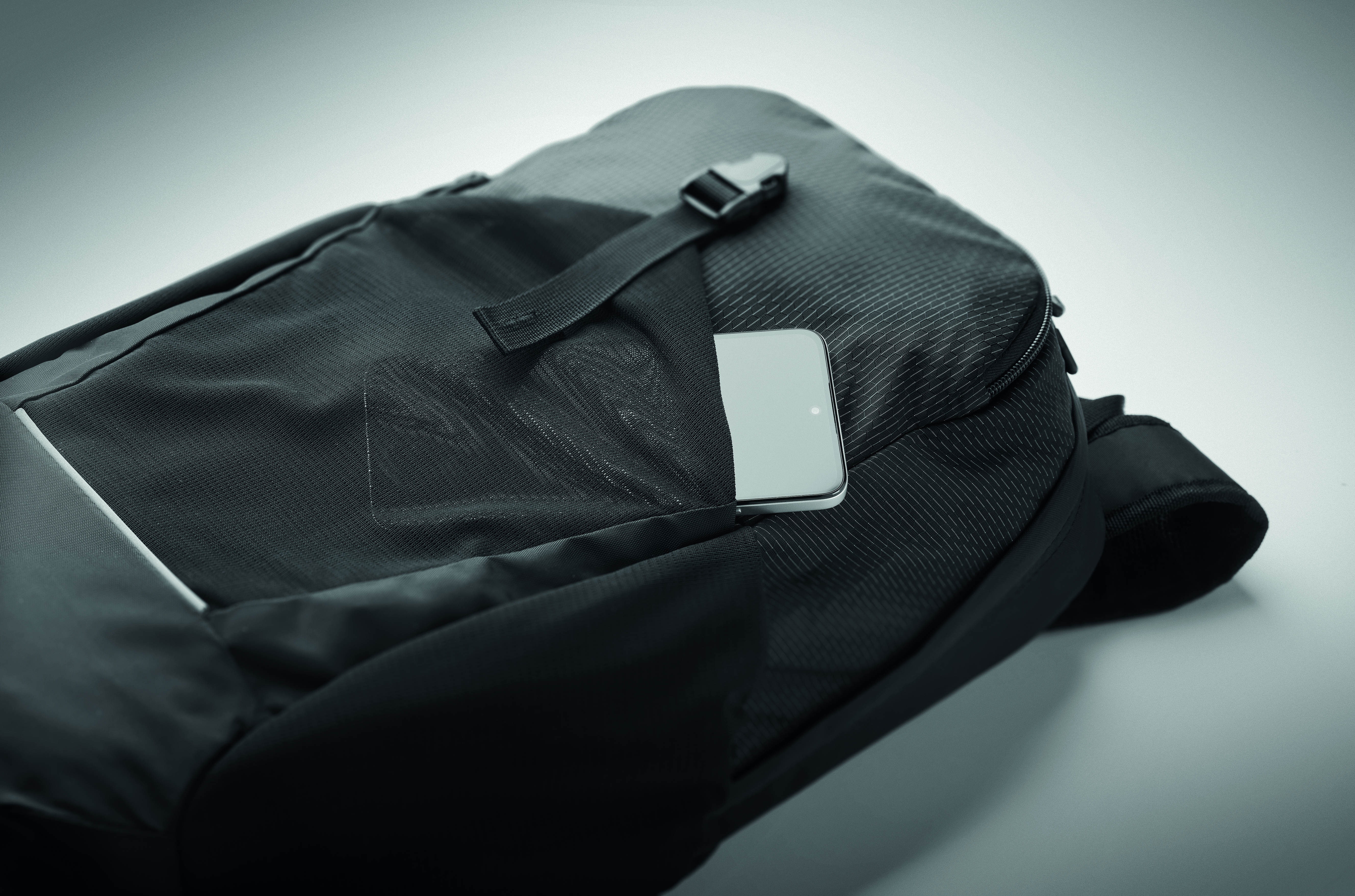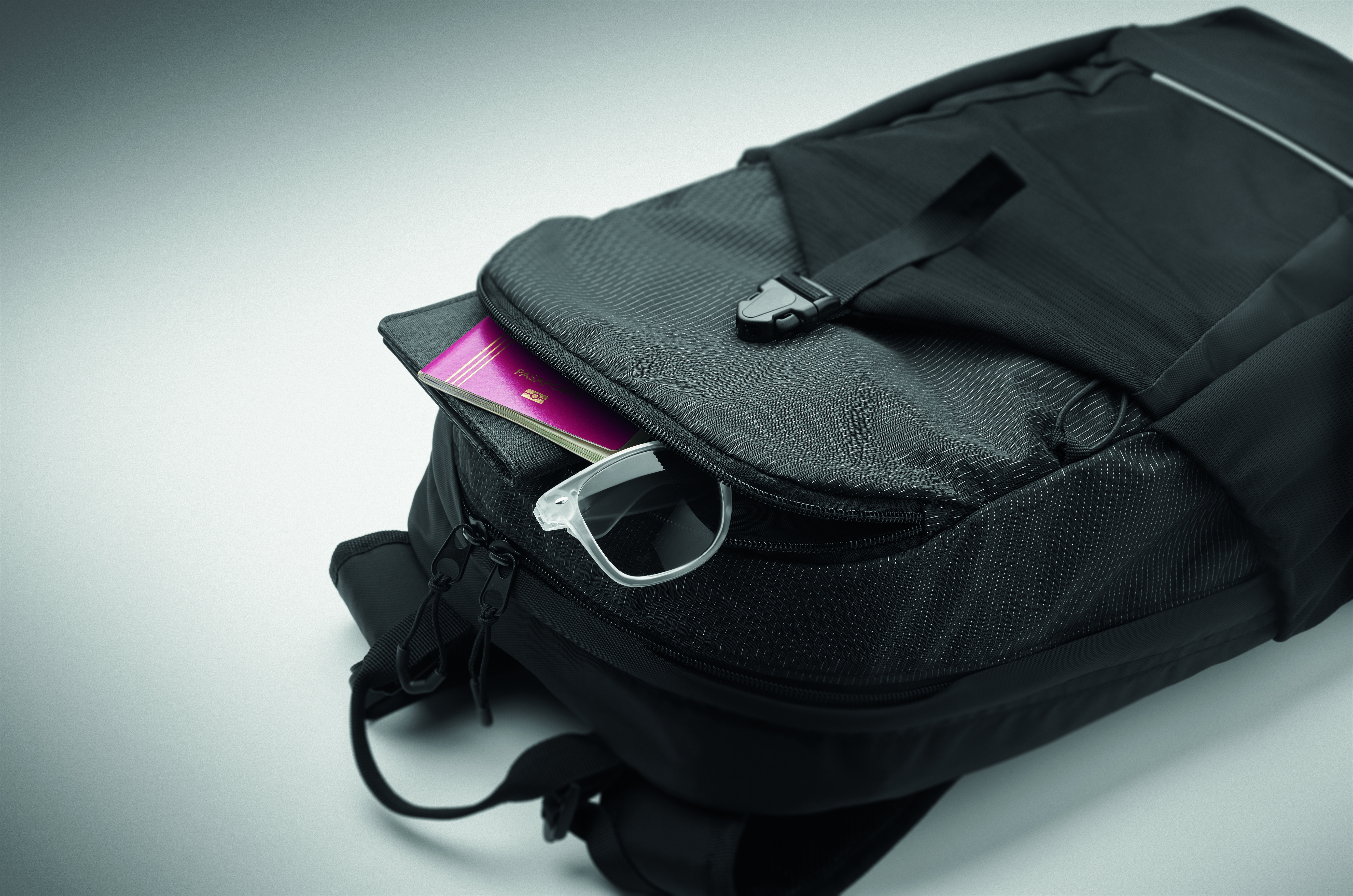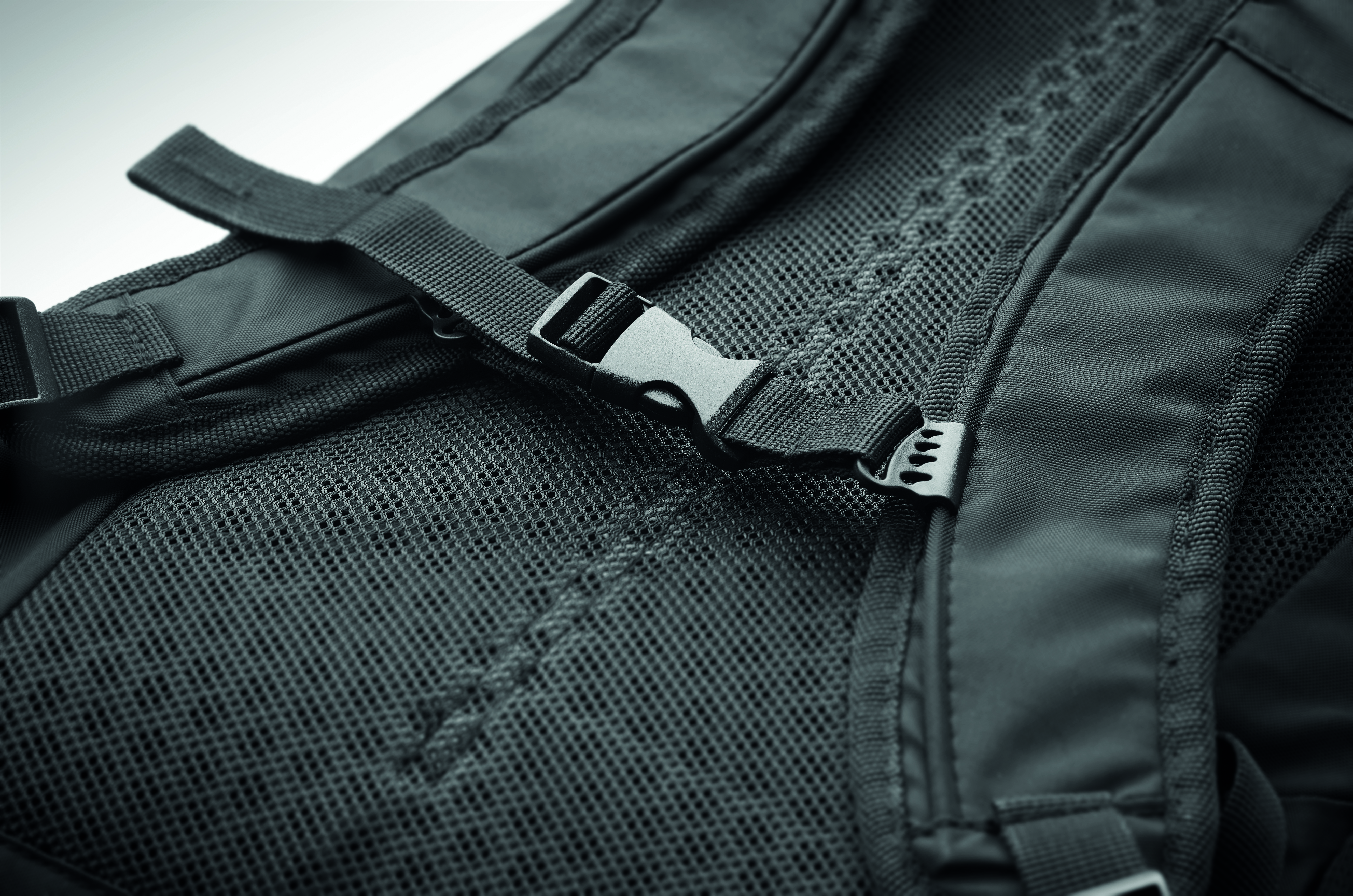Plecak turystyczny 18L z wodoodpornego nylonu 420D z odblaskiem. Wewnętrzna przegroda na laptop 15 cali. Przednia komora na zamek i jedna przednia wsuwana kieszeń z zapięciem na klamrę. Dwie boczne wsuwane kieszenie. Wyściełane plecy i szelki. Wentylowany tył.
