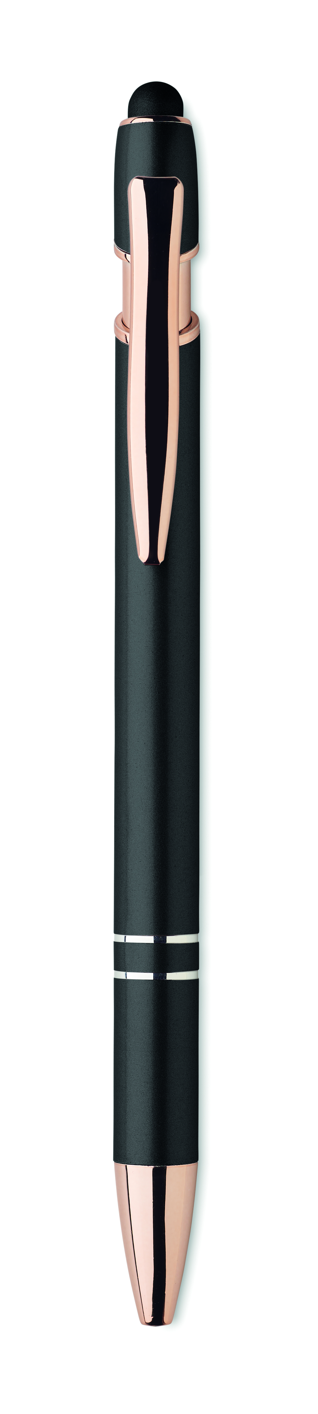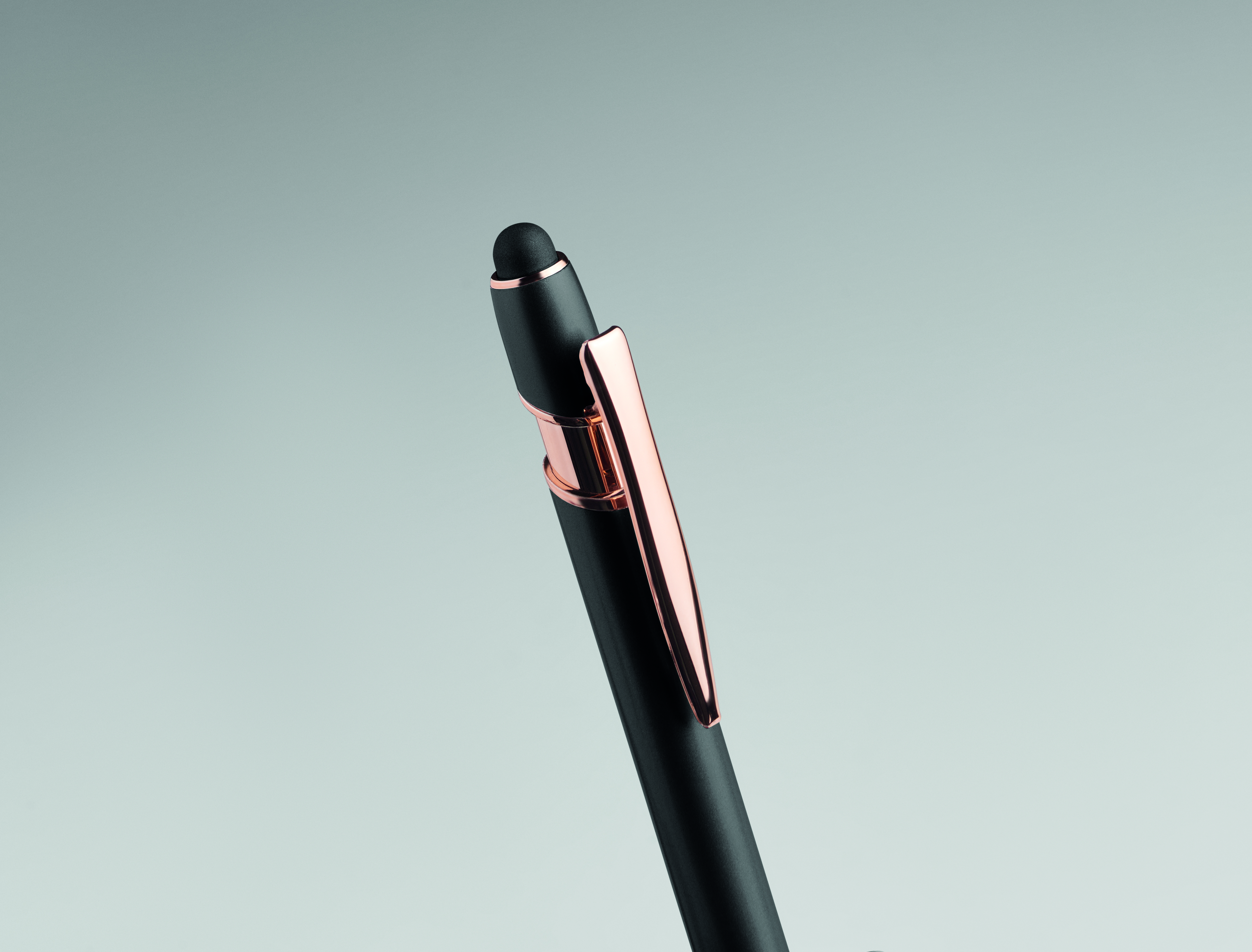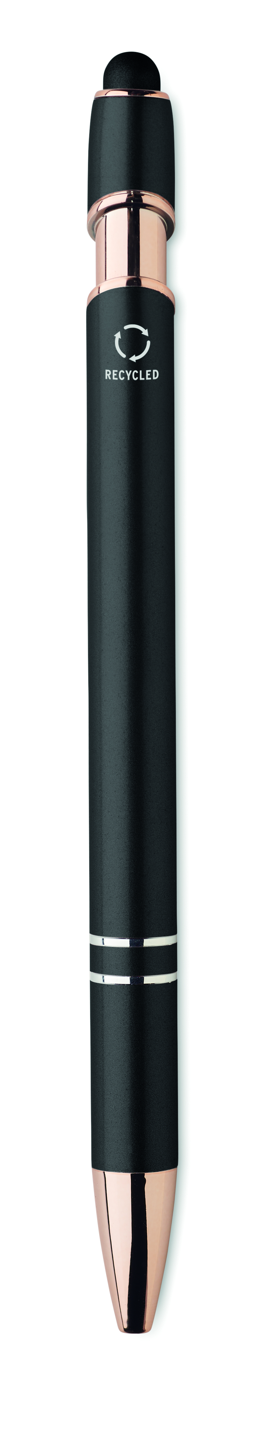Długopis z recyklingowanego aluminium z detalami w kolorze różowego złota. Niebieski tusz.