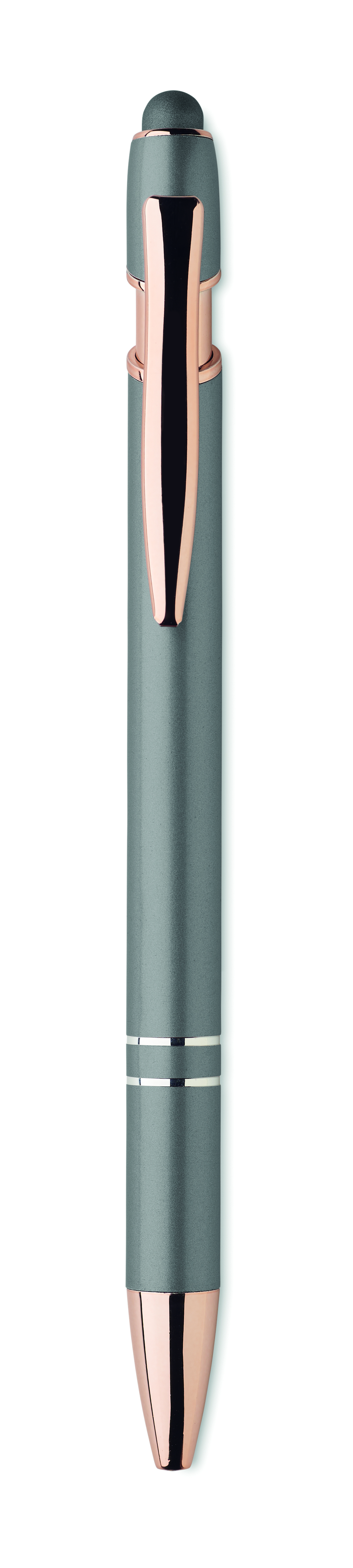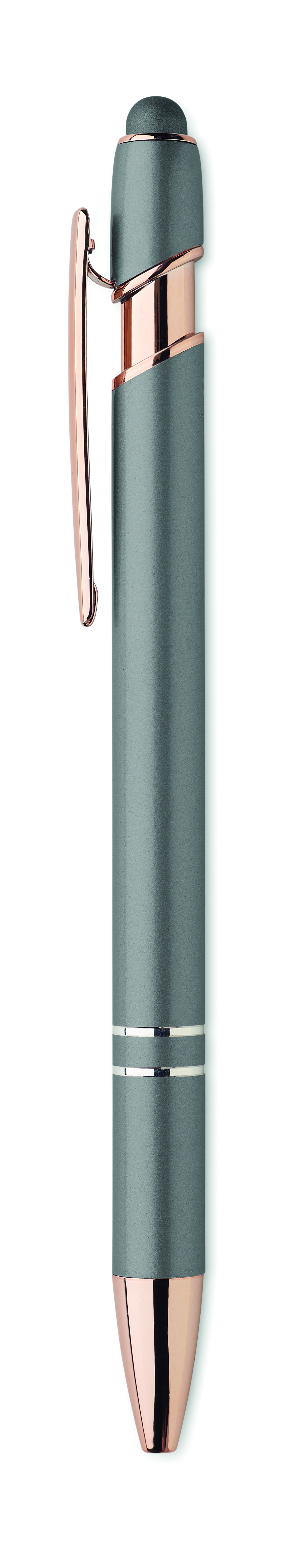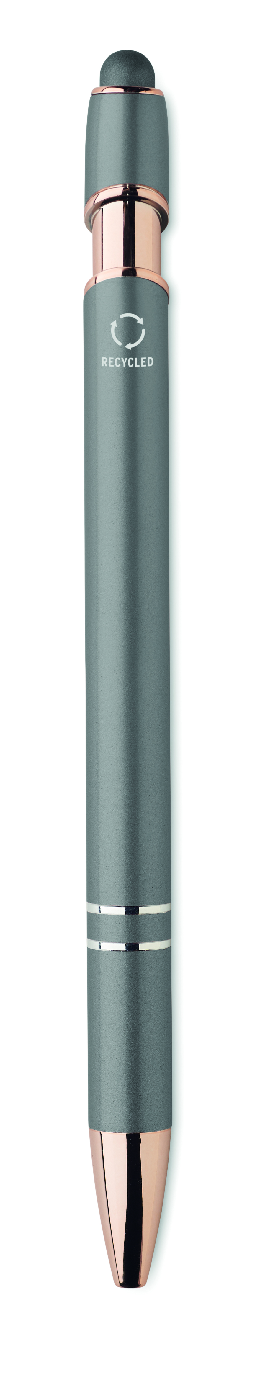 Długopis z recyklingowanego aluminium z detalami w kolorze różowego złota. Niebieski tusz.