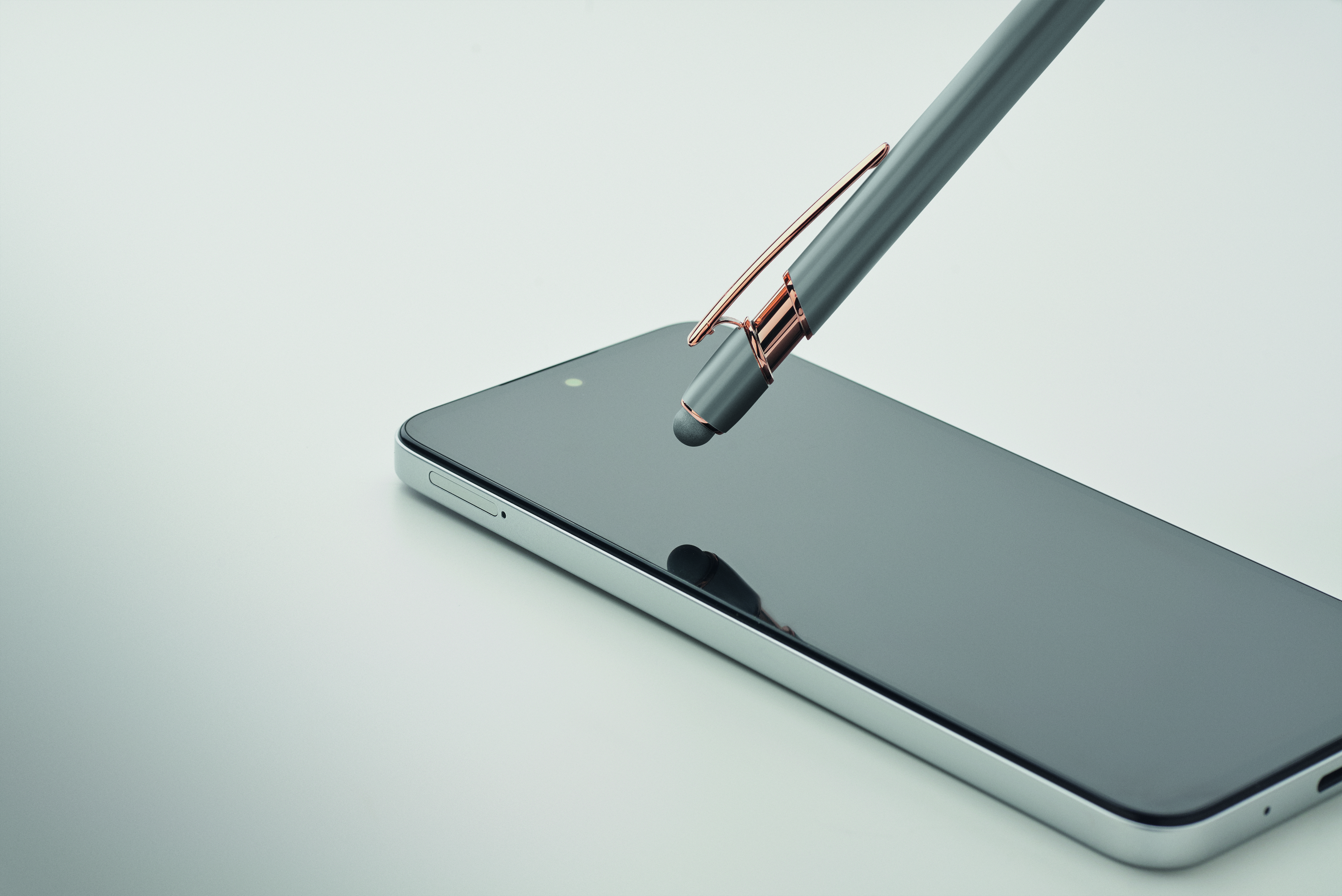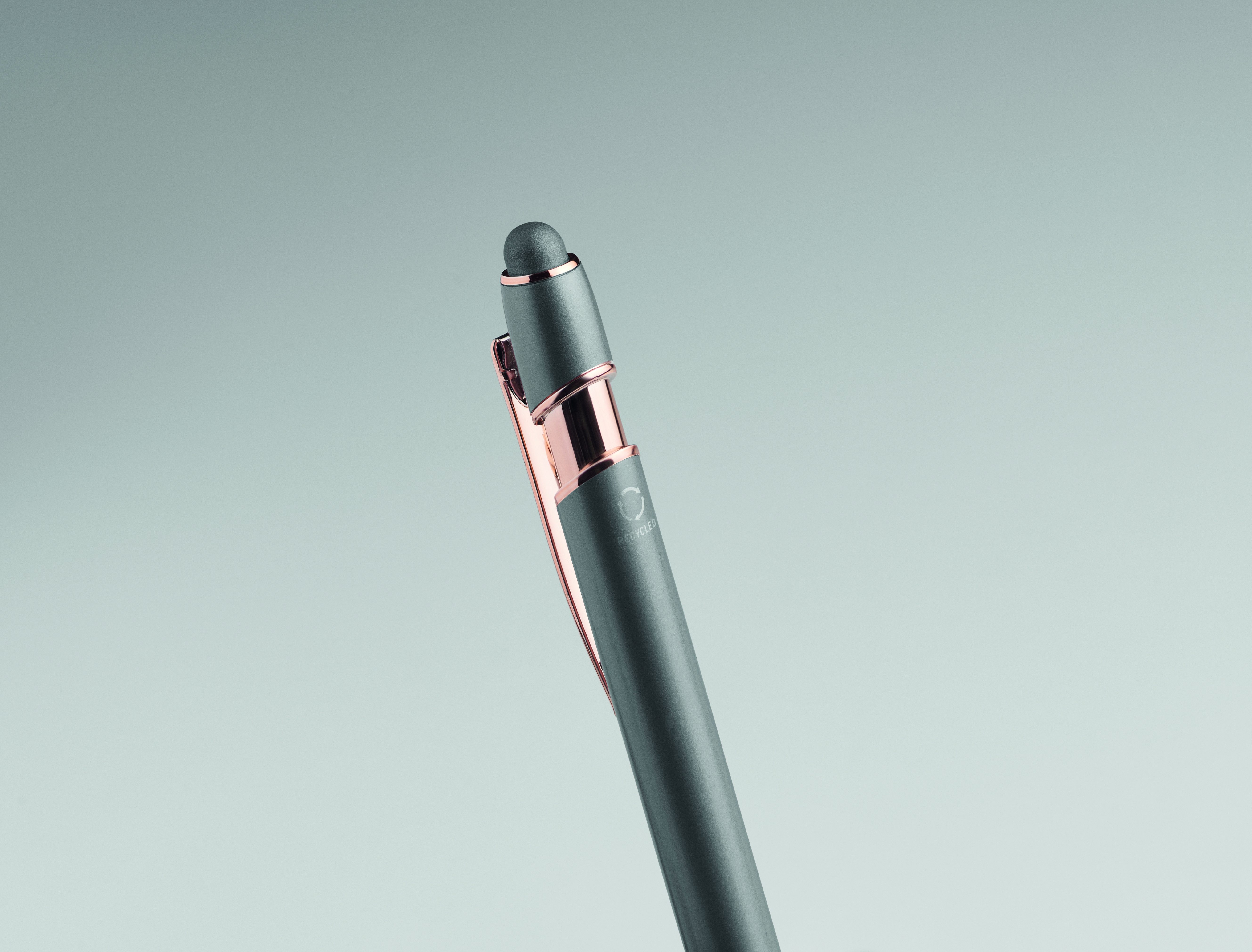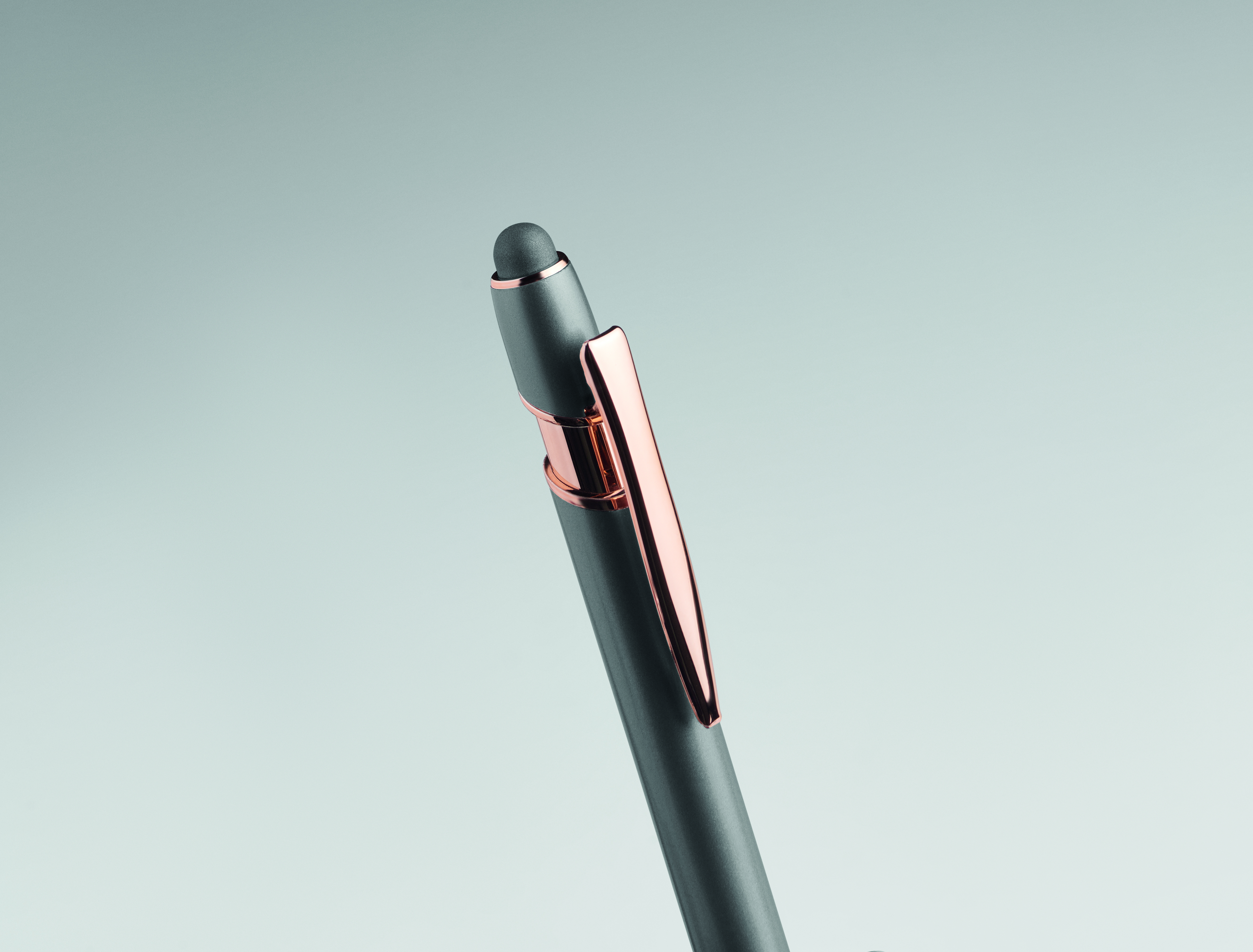 Długopis z recyklingowanego aluminium z detalami w kolorze różowego złota. Niebieski tusz.