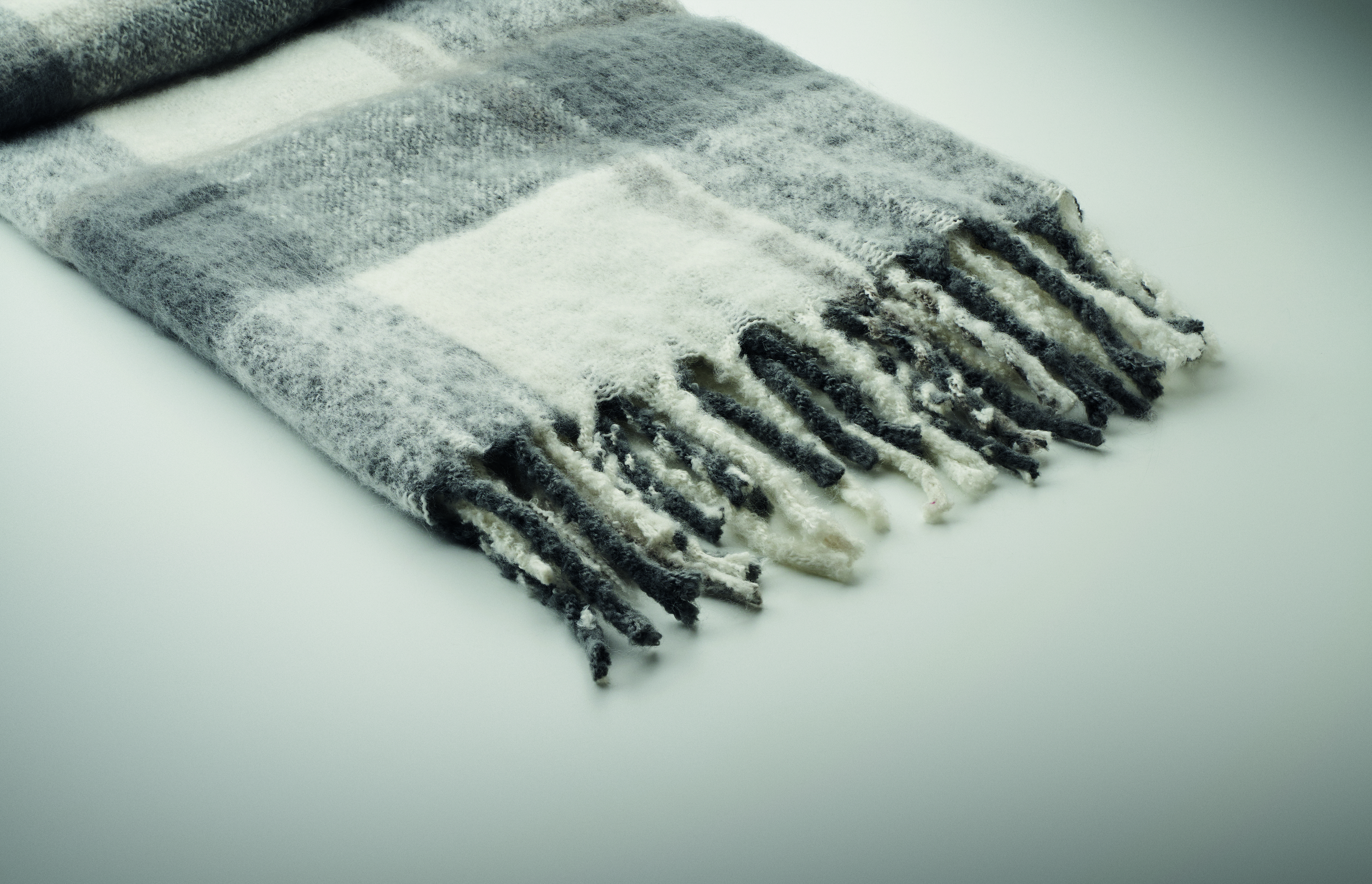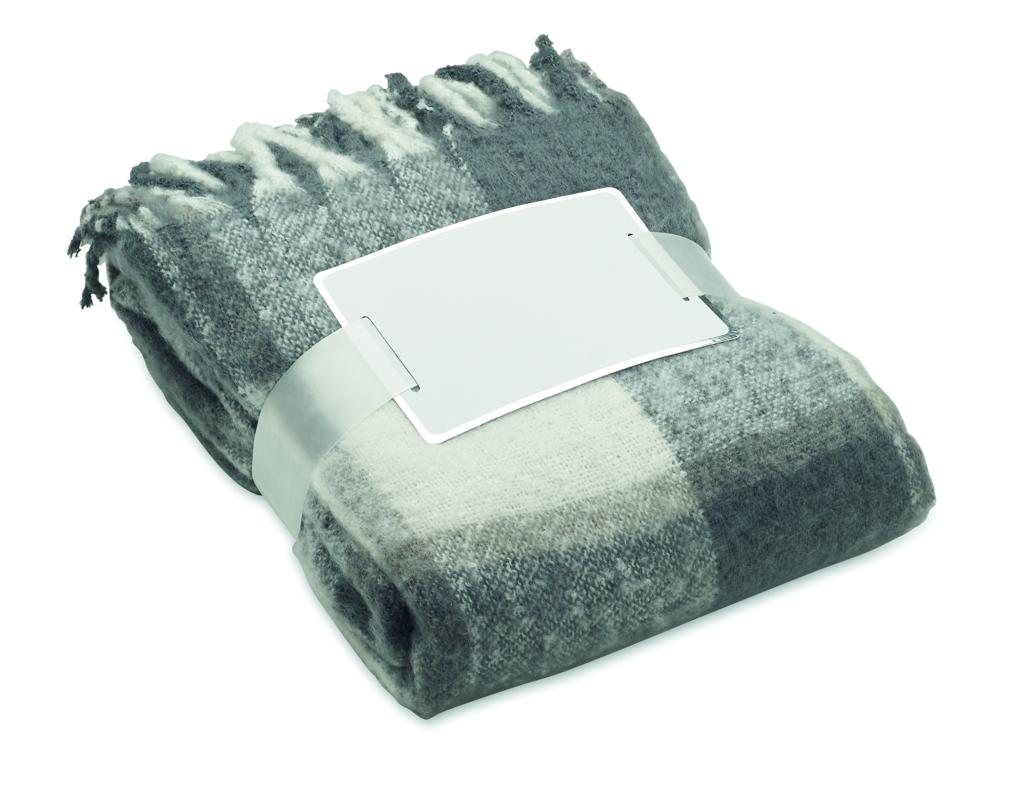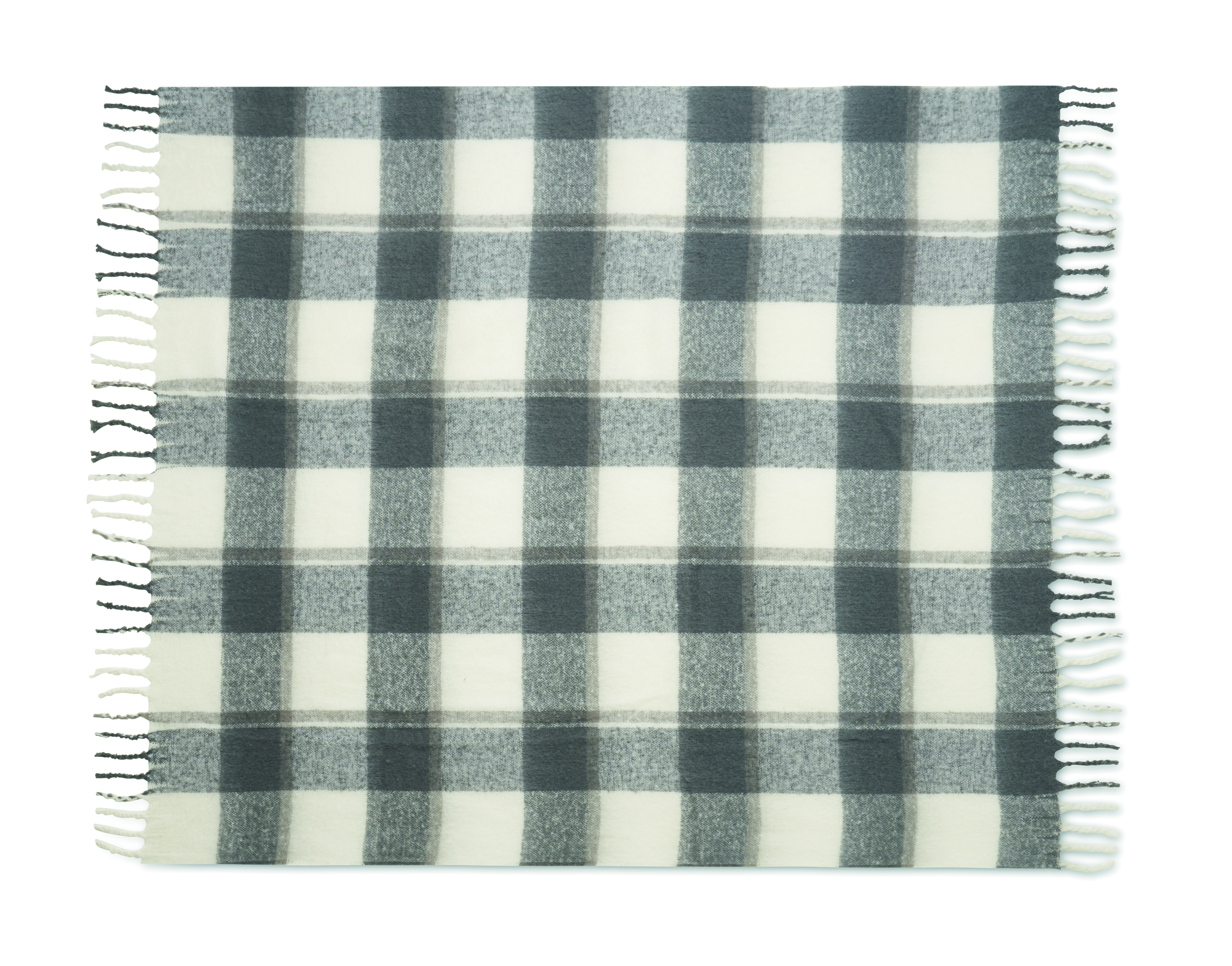 RPET Poliestrowy koc w kratkę z ręcznie zawijanymi frędzlami. Owinięty wstążką i kartą z nadrukiem.
