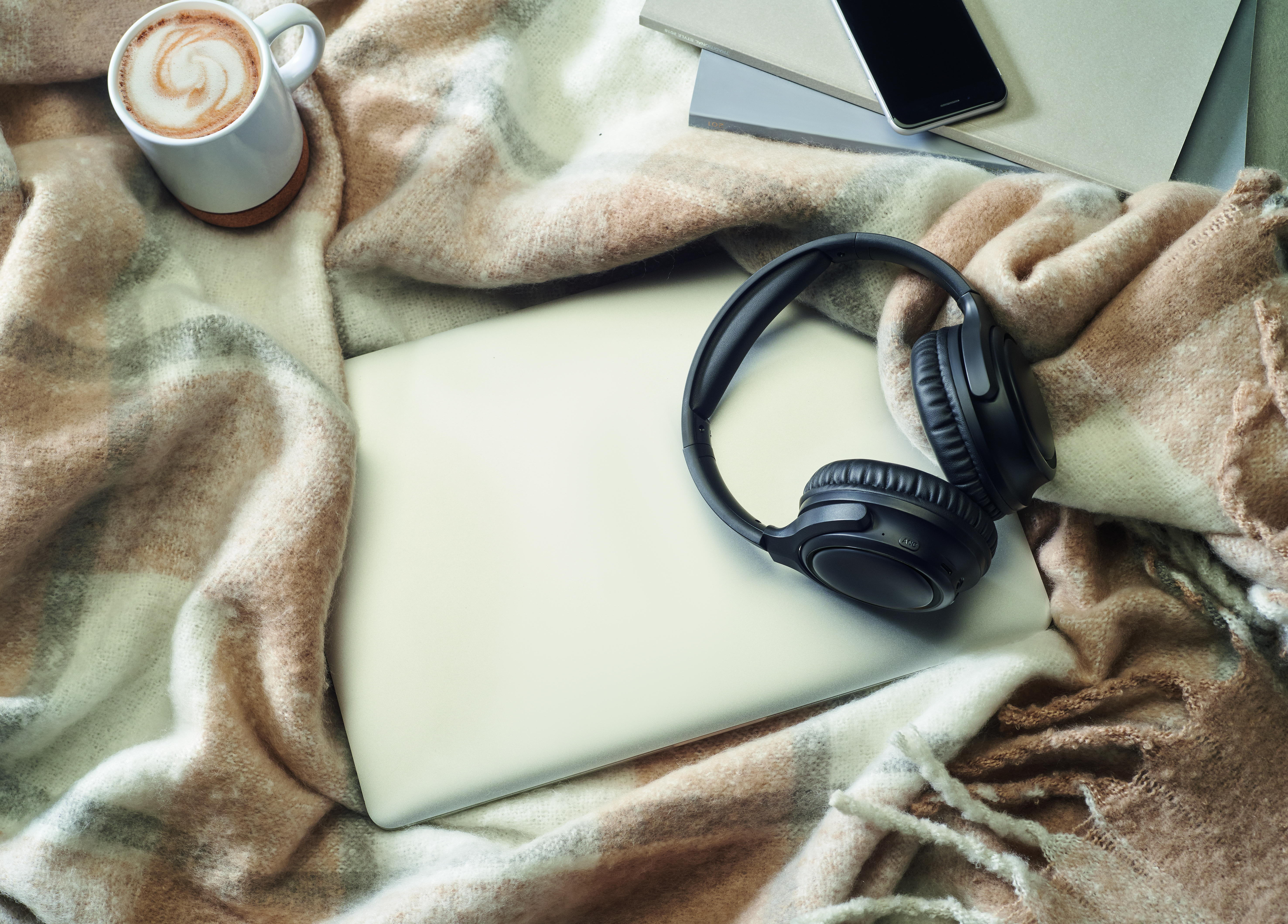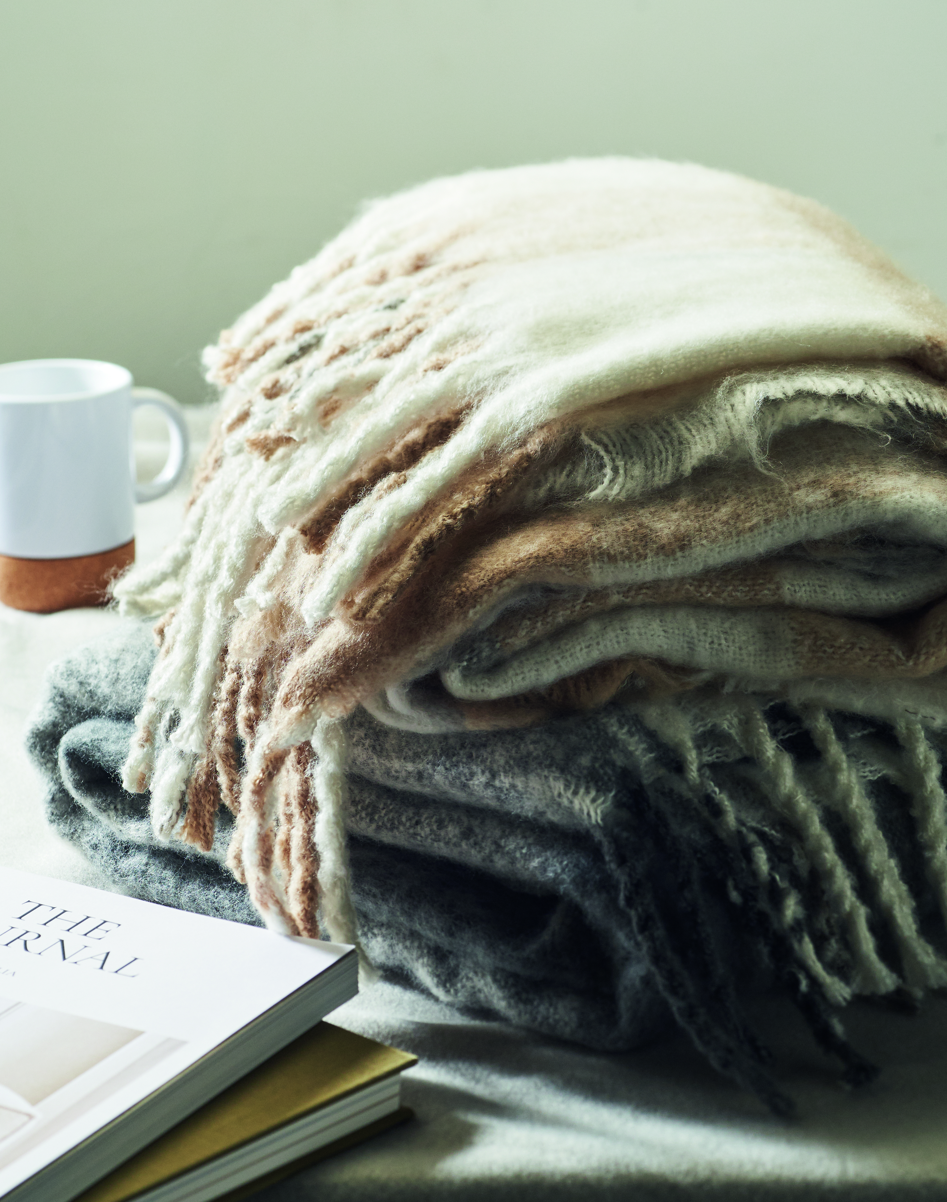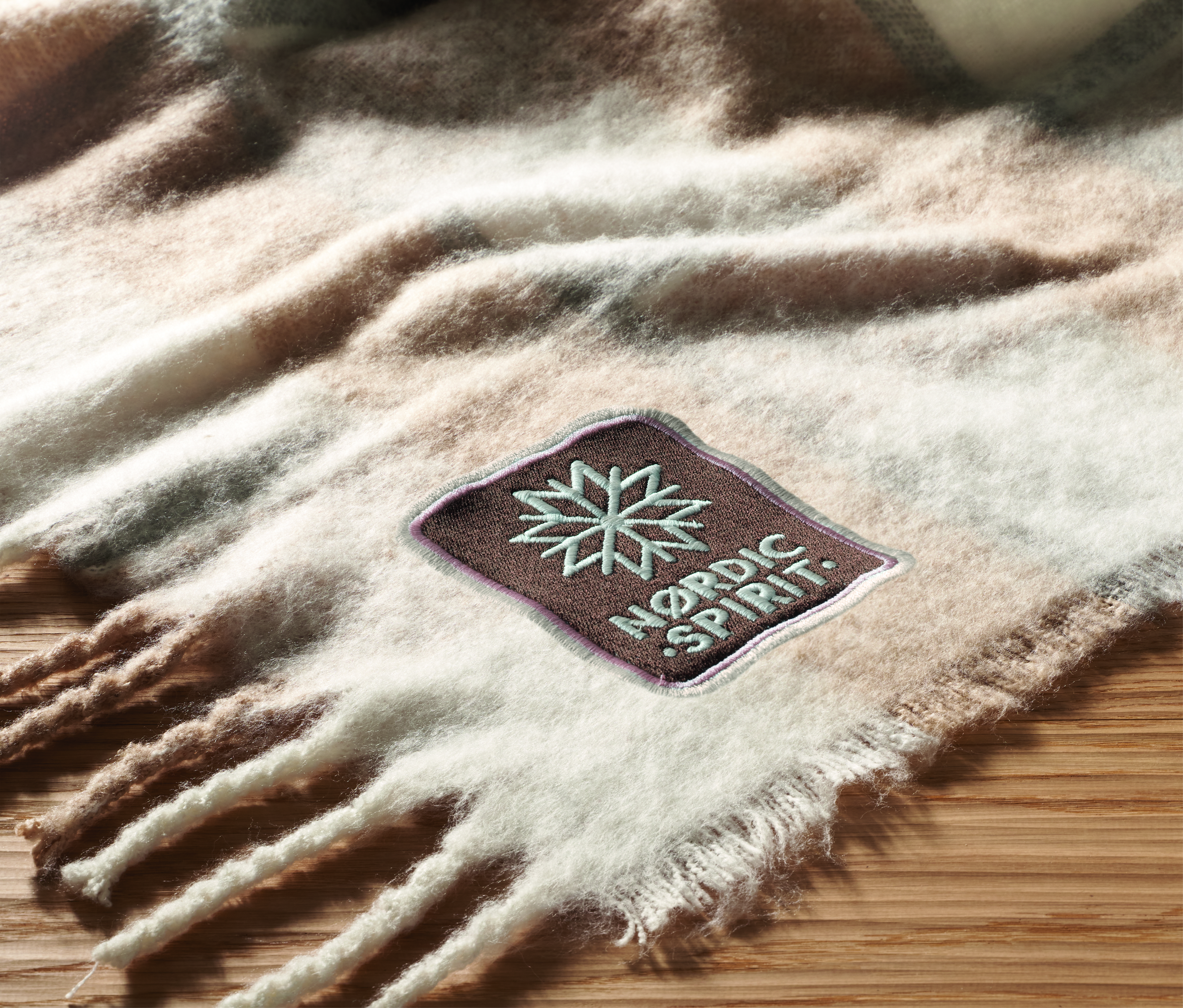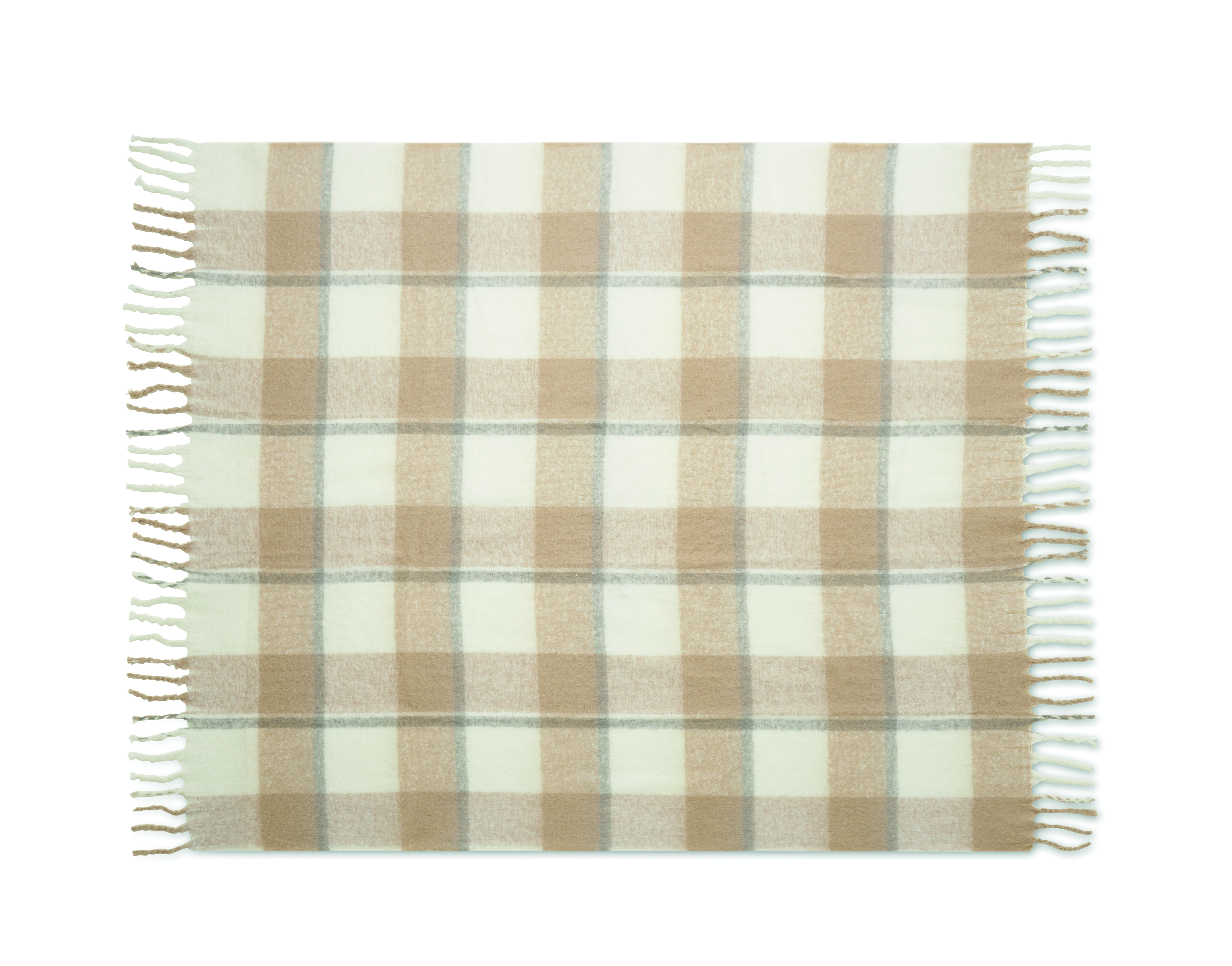 RPET Poliestrowy koc w kratkę z ręcznie zawijanymi frędzlami. Owinięty wstążką i kartą z nadrukiem.