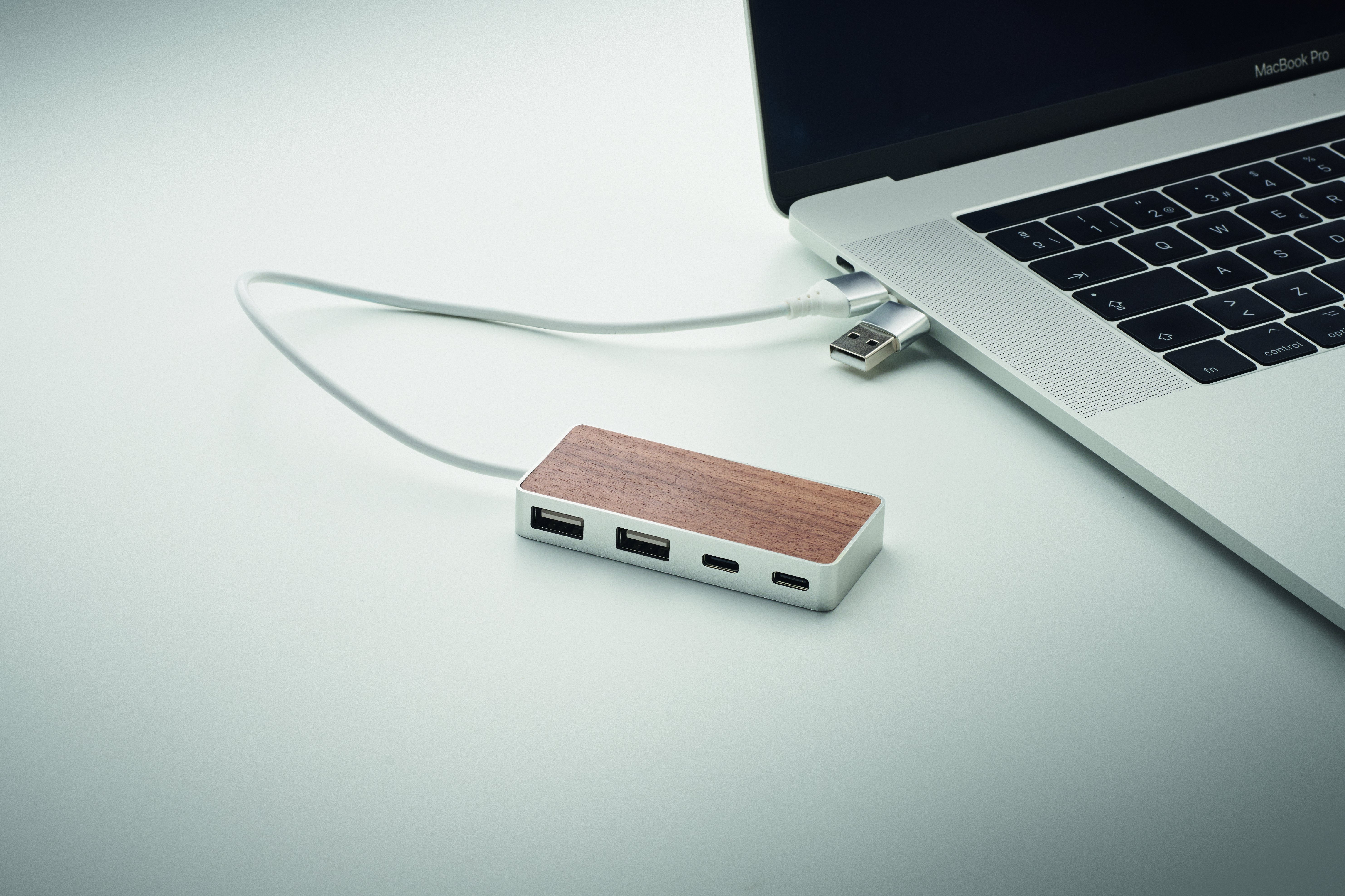 4-portowy hub USB w aluminiowej obudowie z recyklingu i detalami z drewna orzecha włoskiego. Wyjście: 2 x Type-A i 2 x Type-C. Wejście: 2 w 1 Type-C i Type-A. Długość kabla: 27,5 cm.