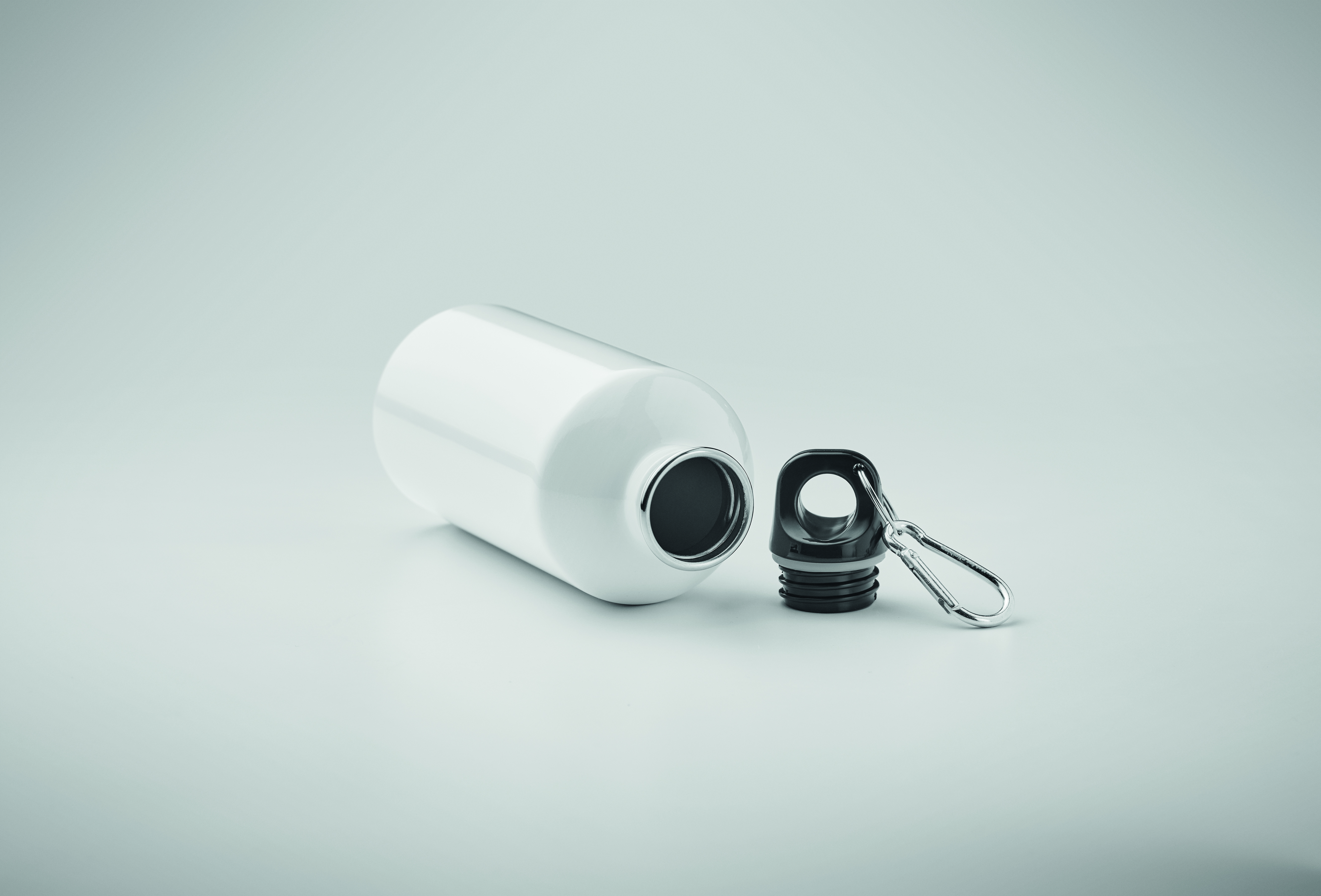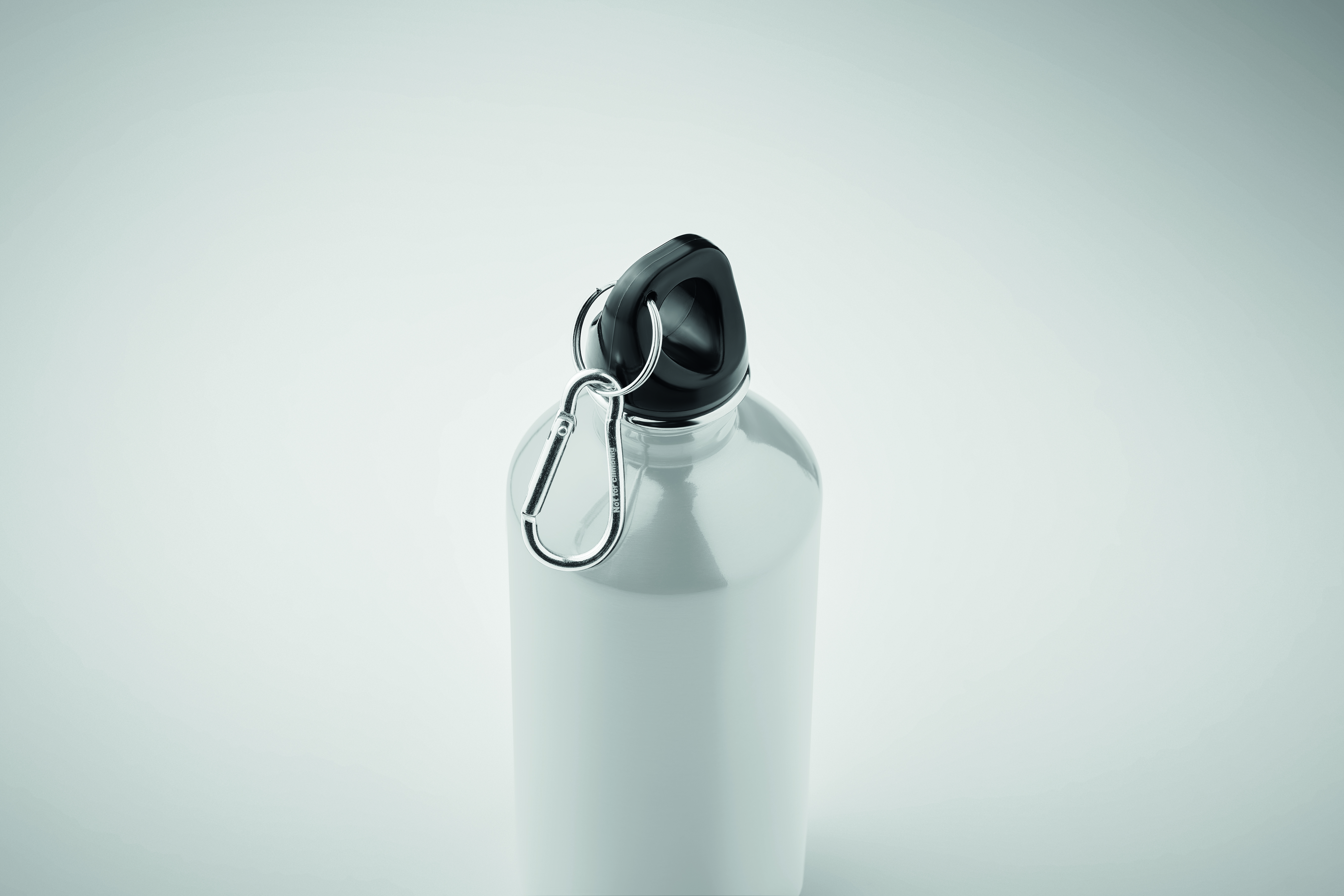 Butelka z pojedynczą ścianką z recyklingowanej stali nierdzewnej (90% stali nierdzewnej z recyklingu i 10% stali nierdzewnej) z karabińczykiem. 500 ml. Nadruk sublimacyjny dostępny tylko w kolorze białym. Szczelna. Ponieważ jest to kubek z pojedynczą ścianką, może dochodzić do wymiany ciepła.