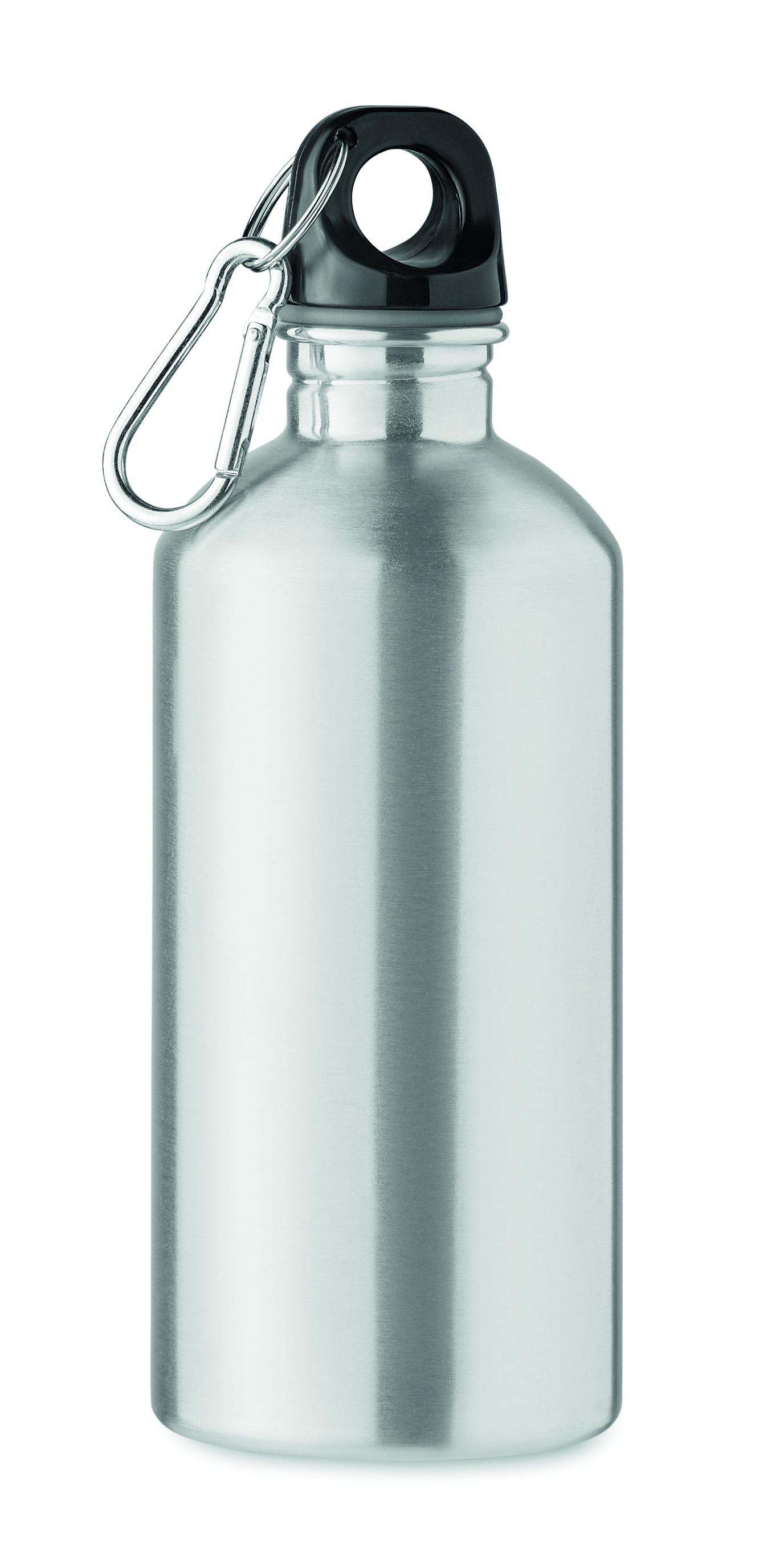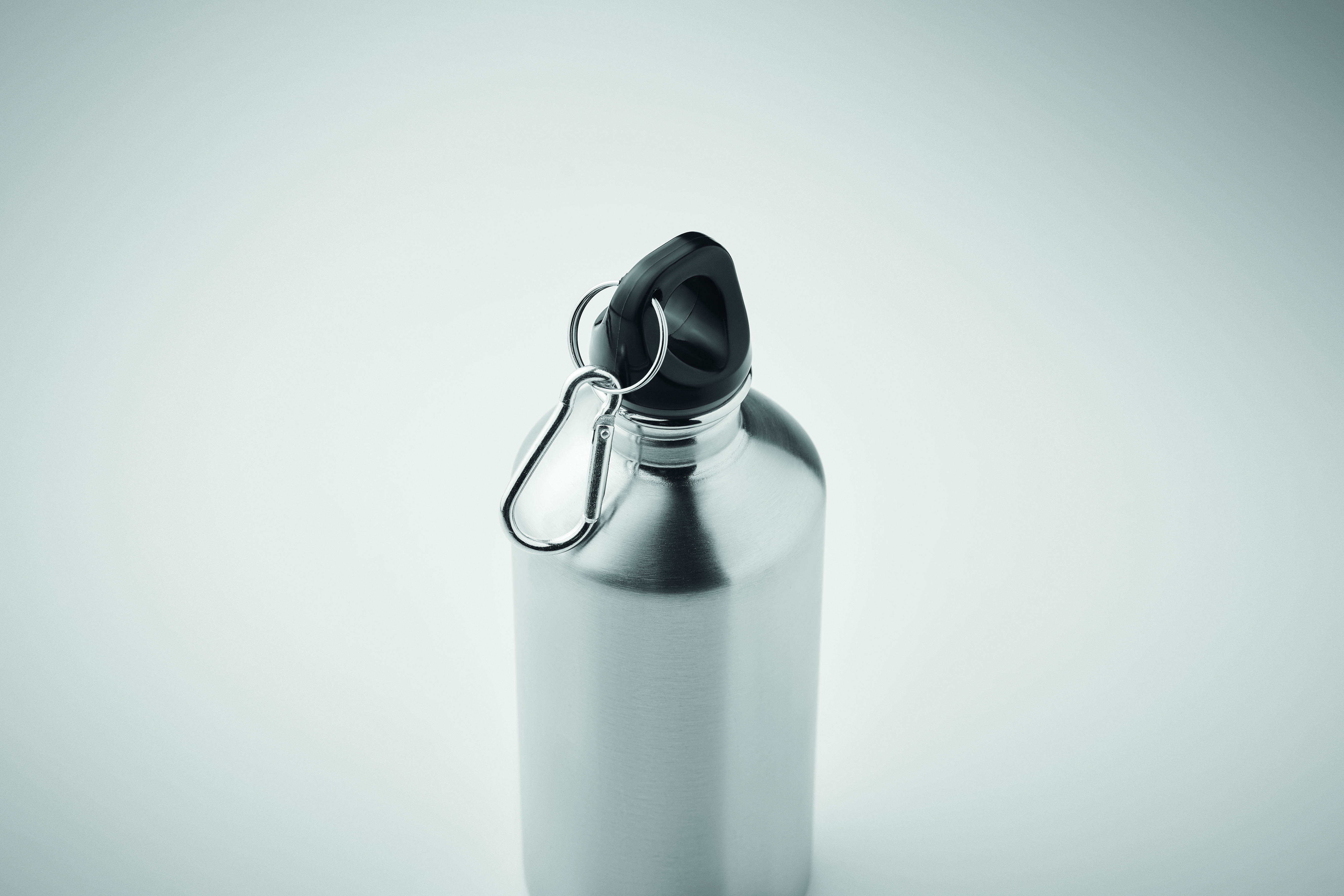 Butelka z pojedynczą ścianką z recyklingowanej stali nierdzewnej (90% stali nierdzewnej z recyklingu i 10% stali nierdzewnej) z karabińczykiem. 500 ml. Nadruk sublimacyjny dostępny tylko w kolorze białym. Szczelna. Ponieważ jest to kubek z pojedynczą ścianką, może dochodzić do wymiany ciepła.