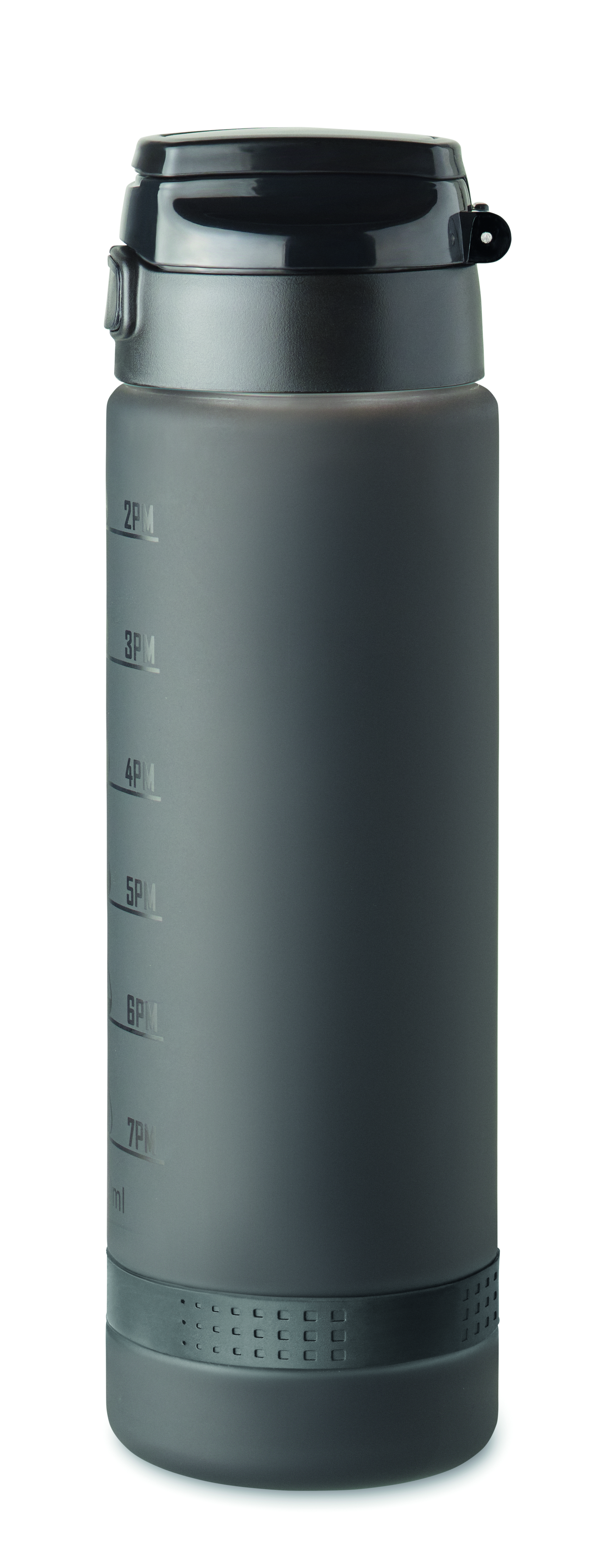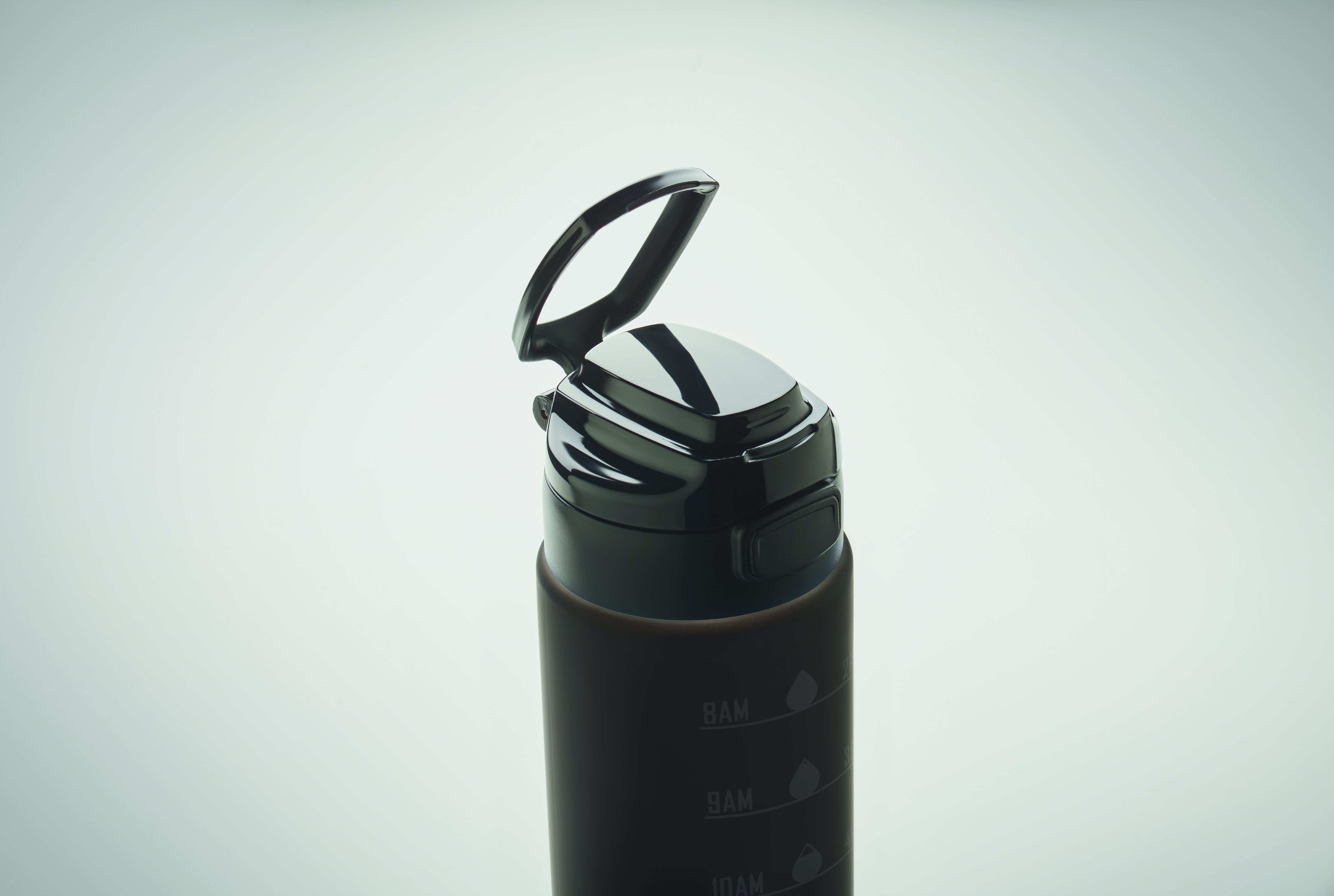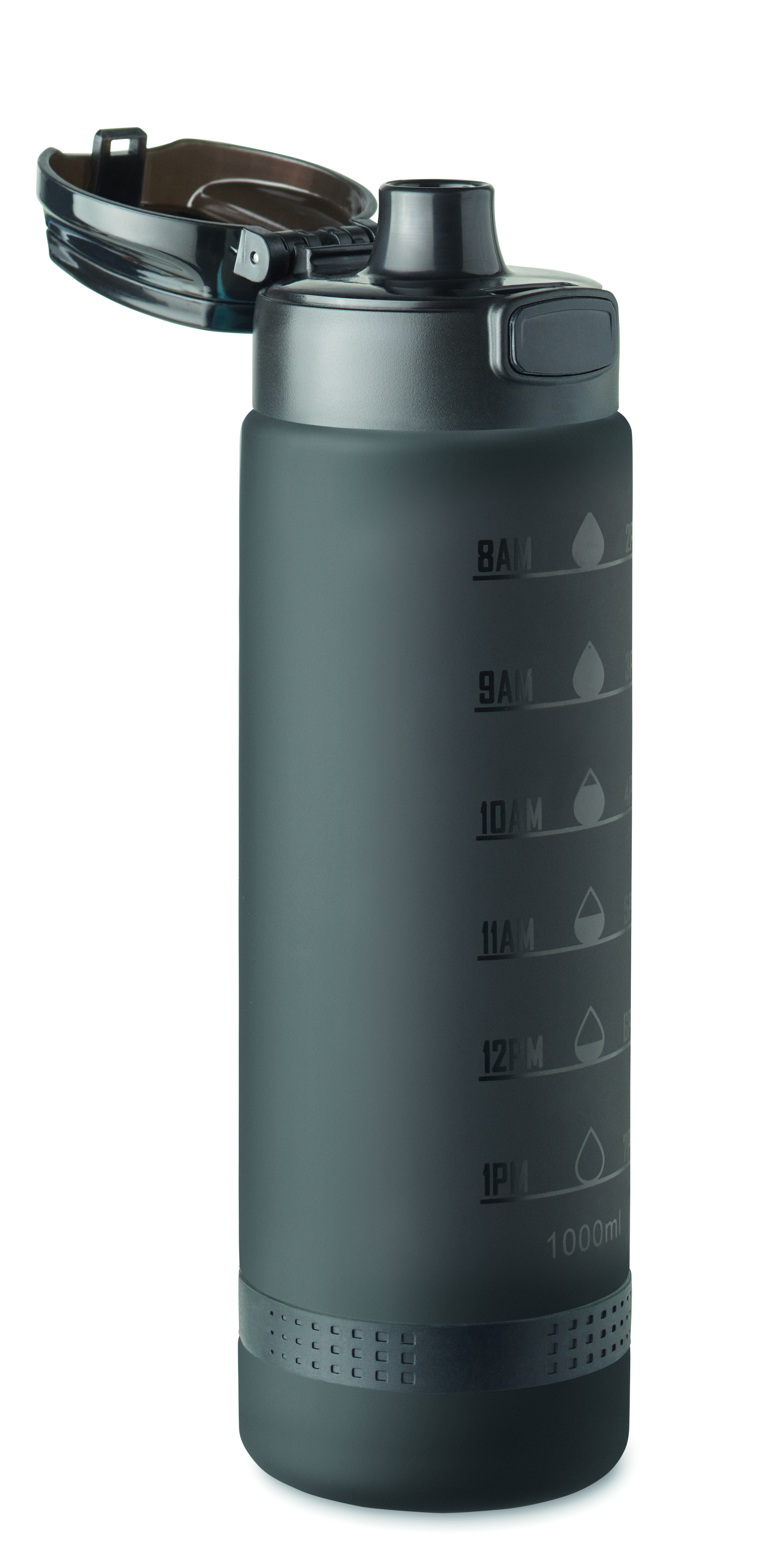 Sportowa butelka na wodę z RPET, motywacyjne oznaczenie czasu, otwierana jedną ręką klapka, blokada bezpieczeństwa i uchwyt do przenoszenia. Pojemność: 1 l. Szczelna.