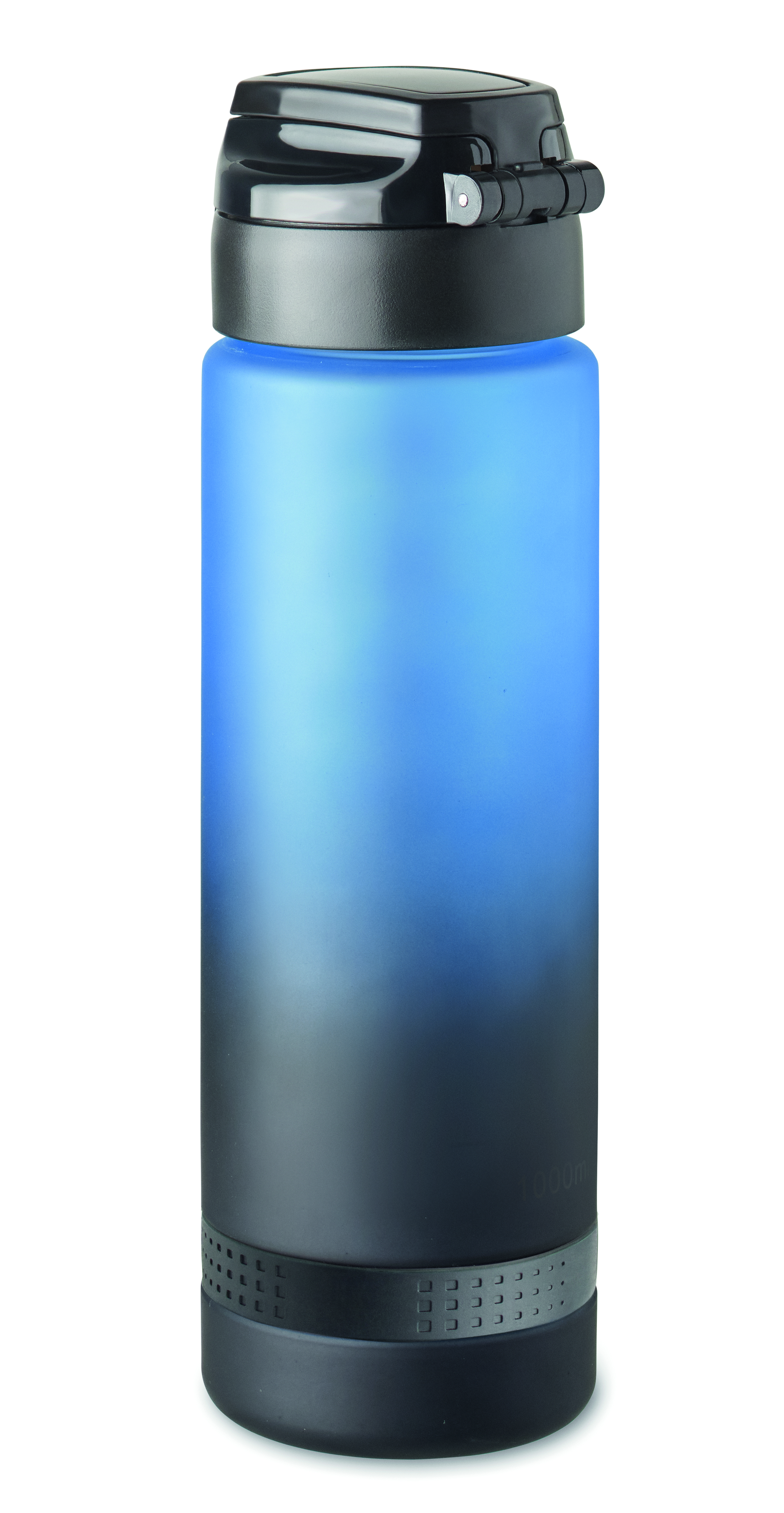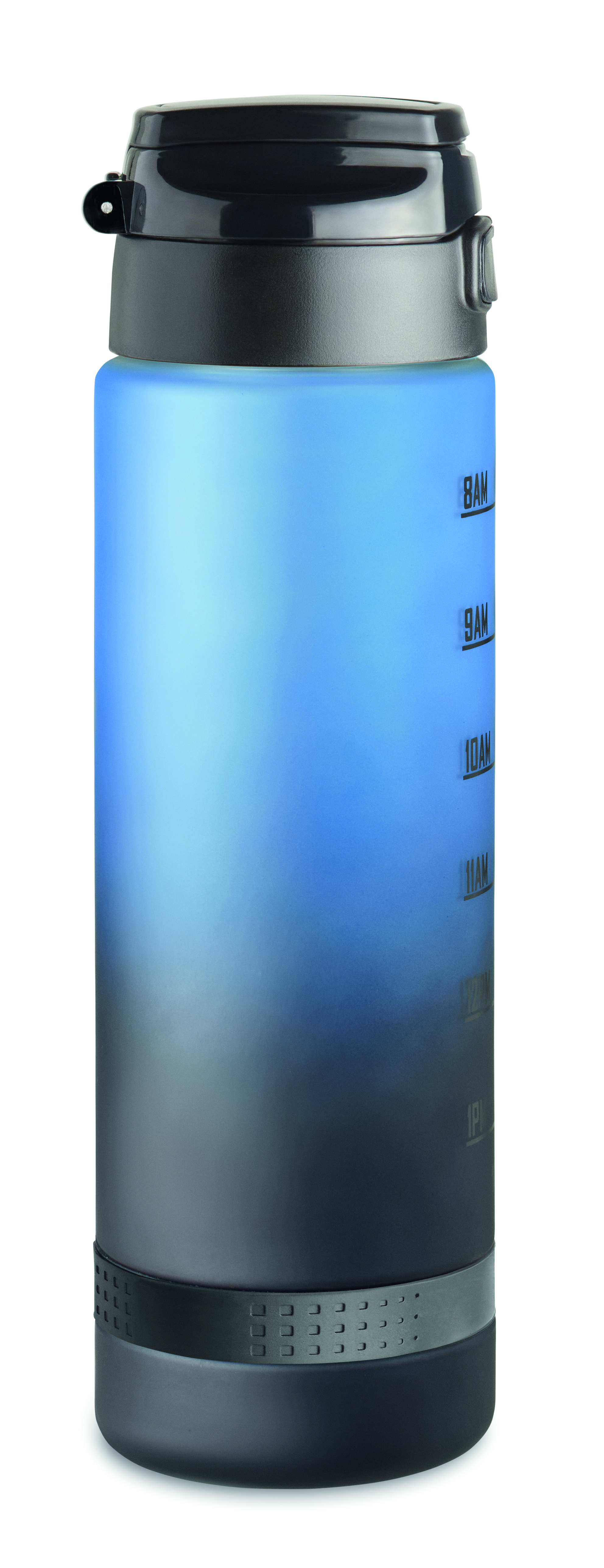 Sportowa butelka na wodę z RPET, motywacyjne oznaczenie czasu, otwierana jedną ręką klapka, blokada bezpieczeństwa i uchwyt do przenoszenia. Pojemność: 1 l. Szczelna.
