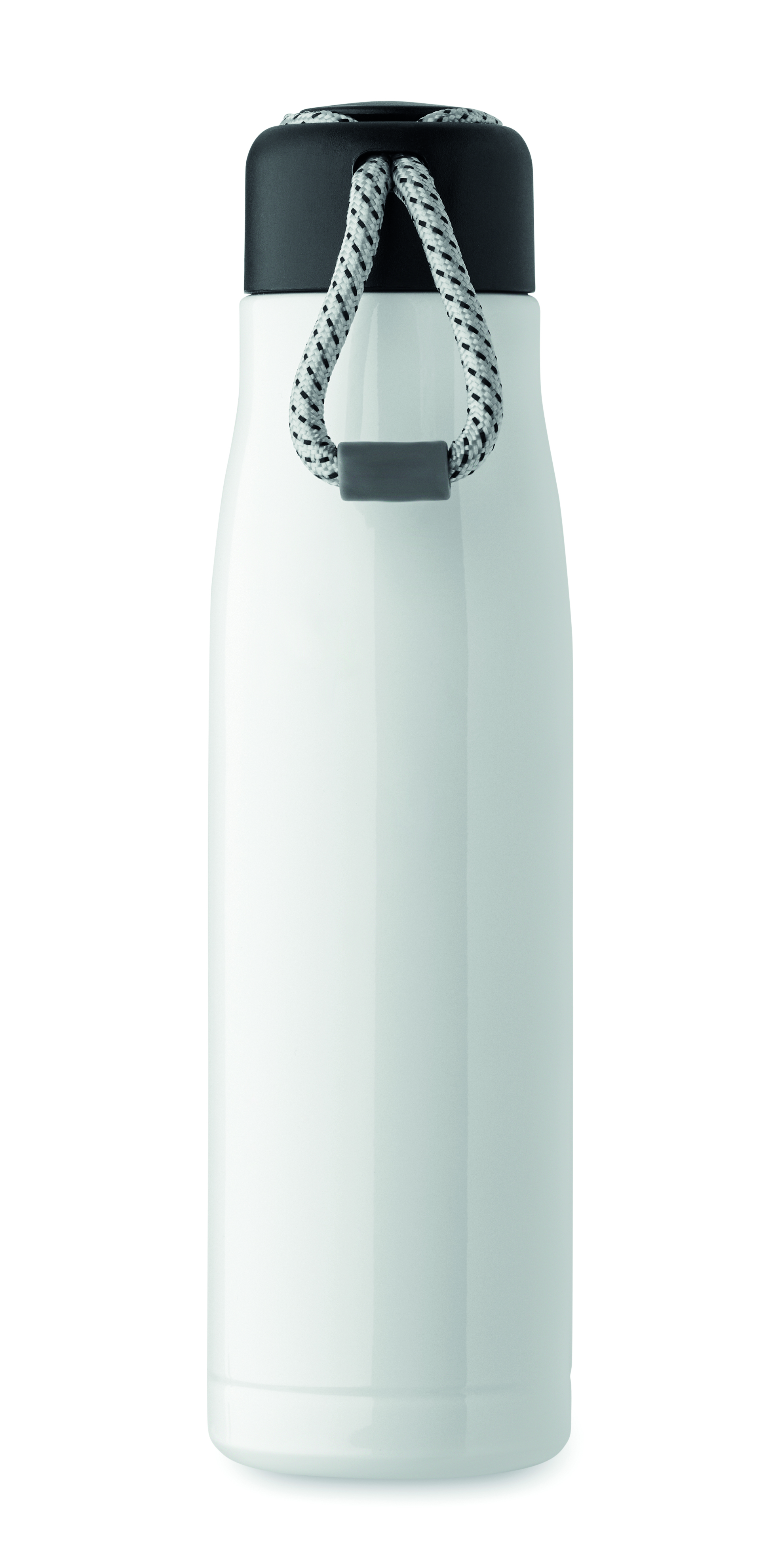 Izolowana próżniowo butelka z podwójnymi ściankami z recyklingowanej stali nierdzewnej (90% z recyklingowanej stali nierdzewnej i 10% ze stali nierdzewnej) ze zintegrowanym uchwytem sznurkowym w zakrętce z PP. Nie przecieka. Pojemność: 500 ml.