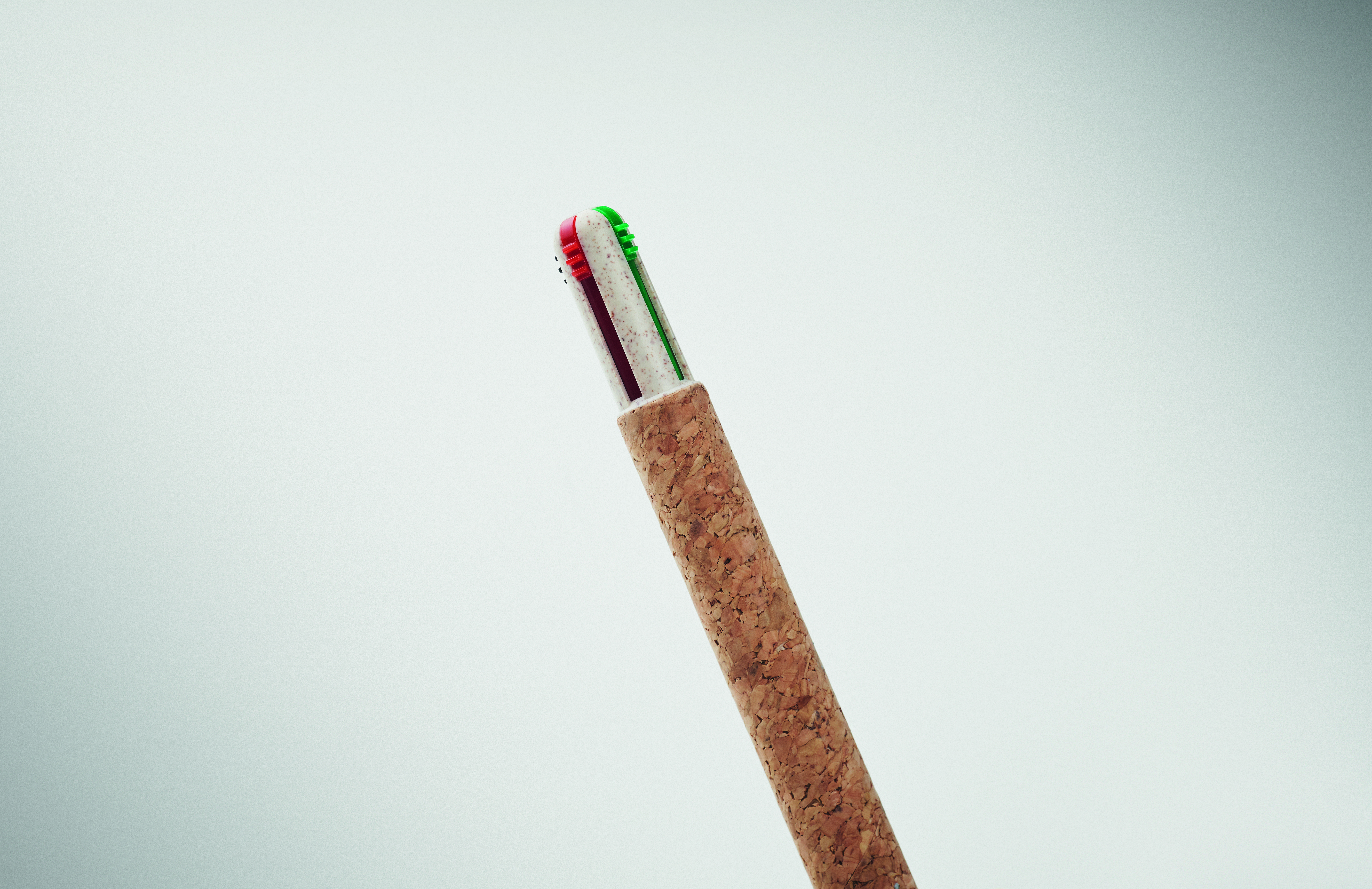 Długopis z 4 kolorowymi wkładami, korkowym korpusem i końcówkami ze słomy pszenicznej (50%) i plastiku ABS (50%).