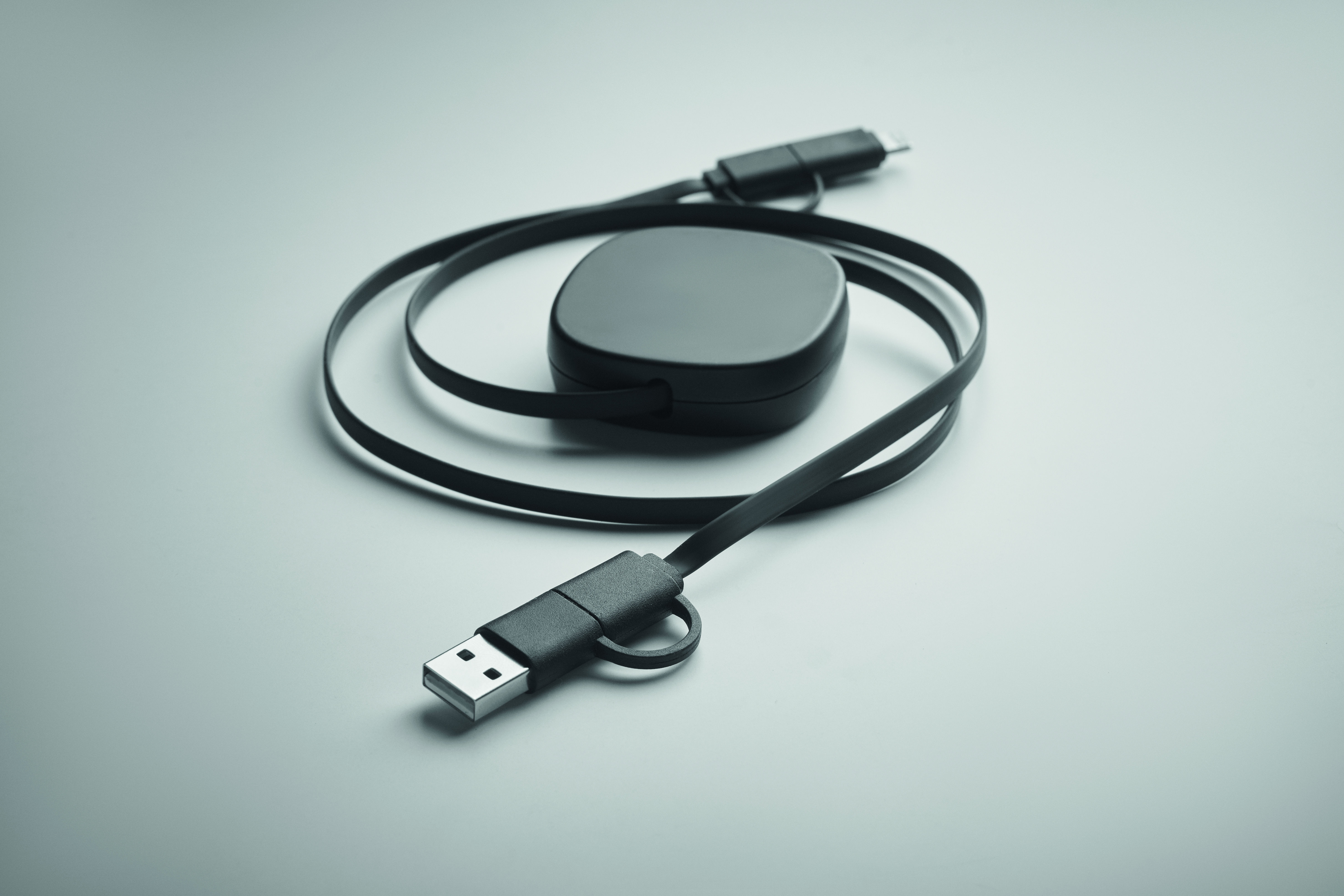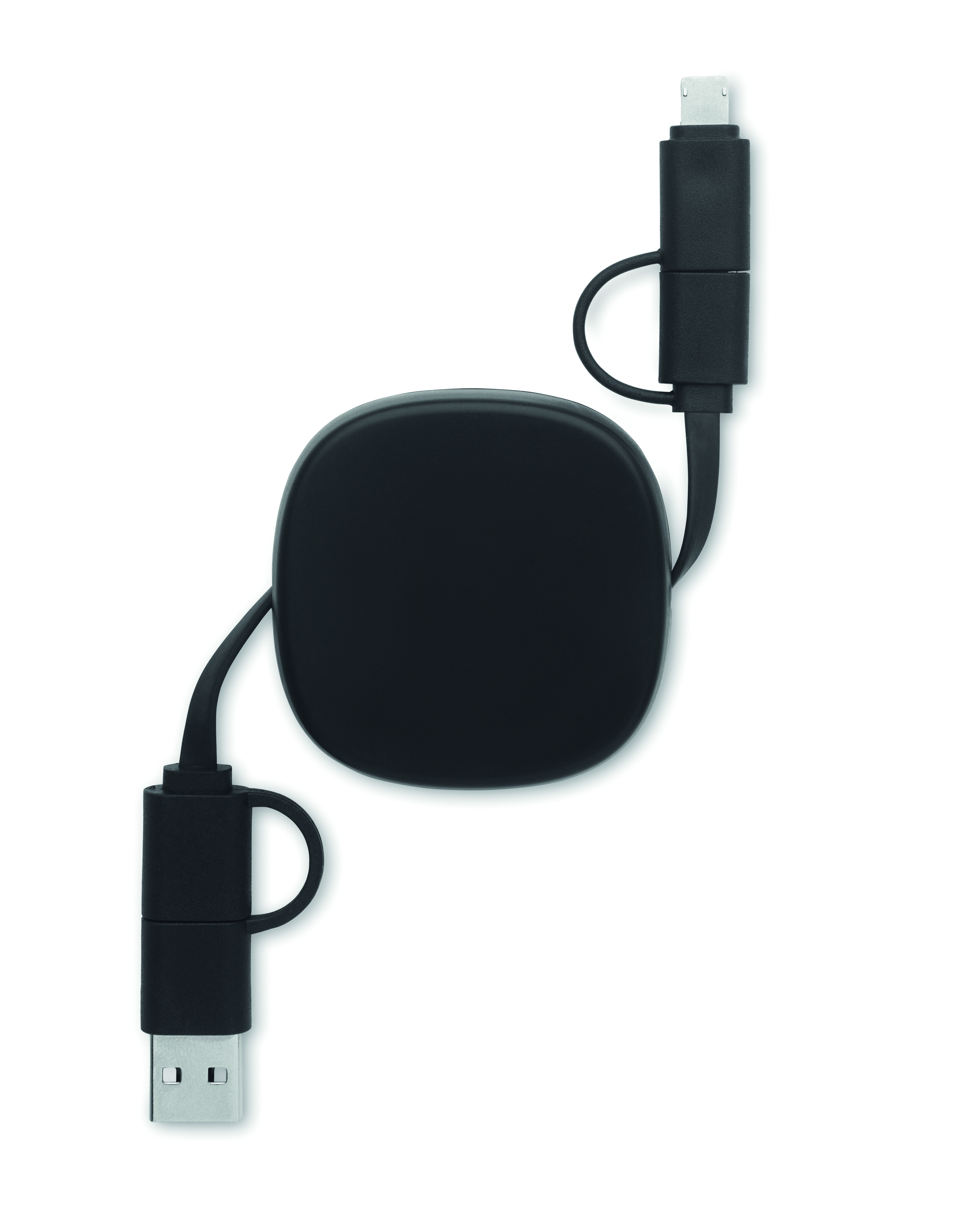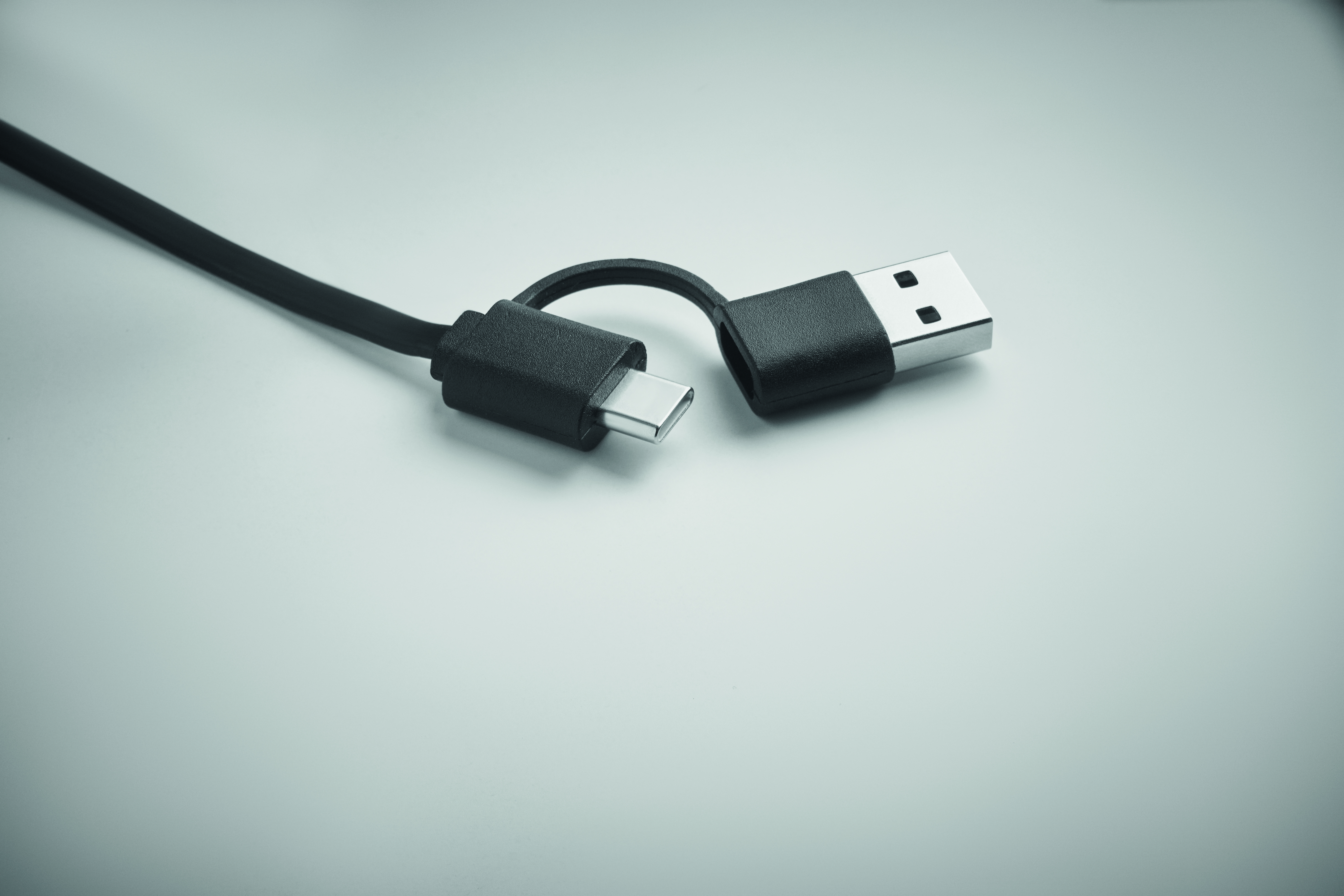 Zwijany kabel o mocy 60W w obudowie ABS z recyklingu. Wejście: 2-w-1 Typ-C i Typ-A. Wyjście: Typ-C i micro-B (2 w 1 pin). Długość kabla: 80 cm.