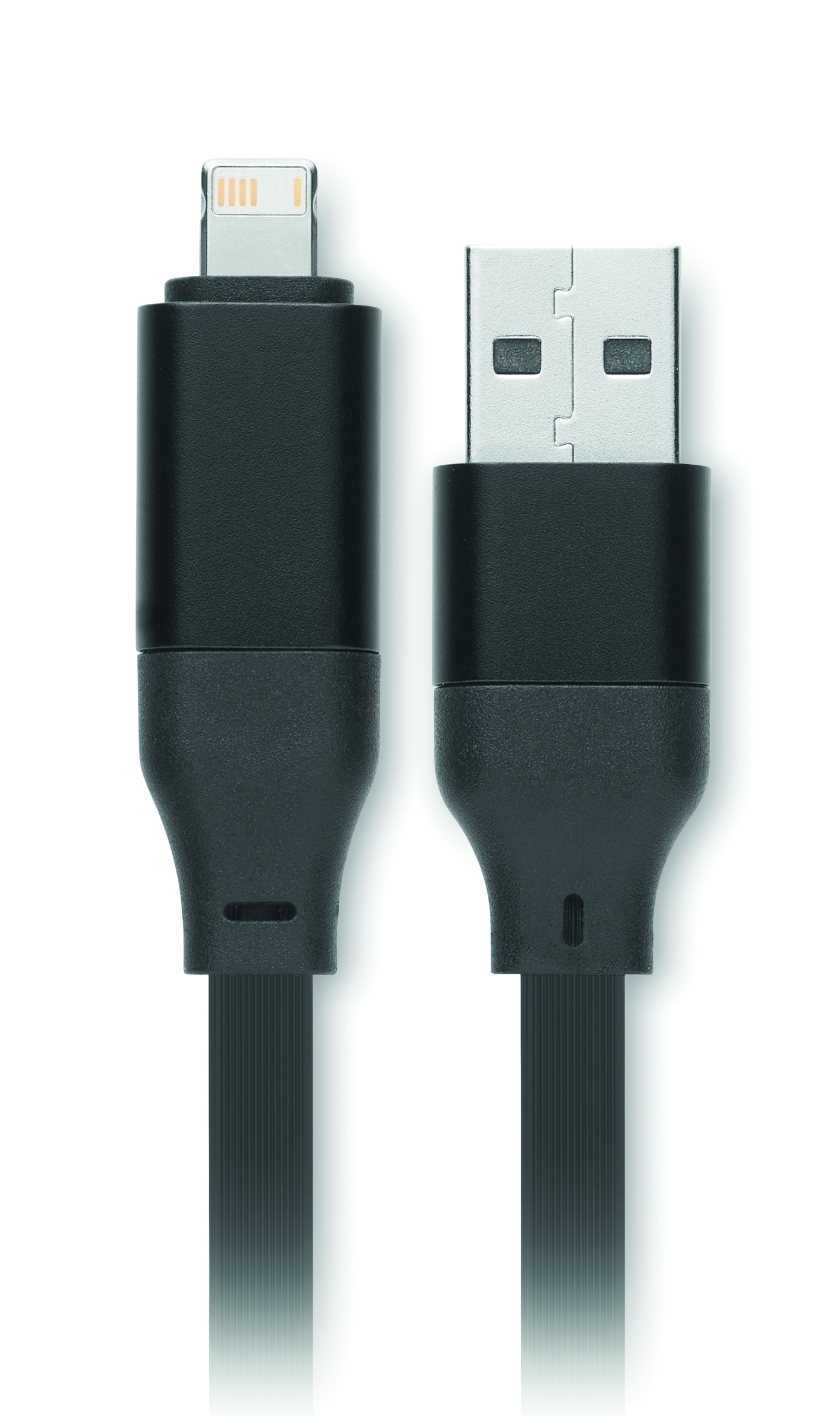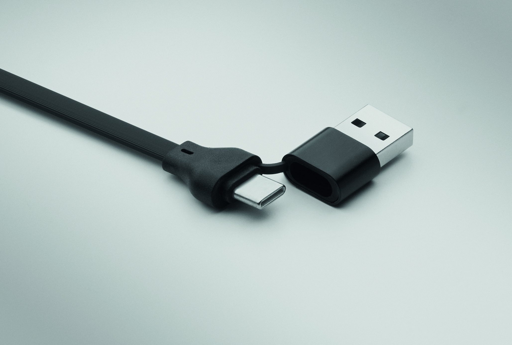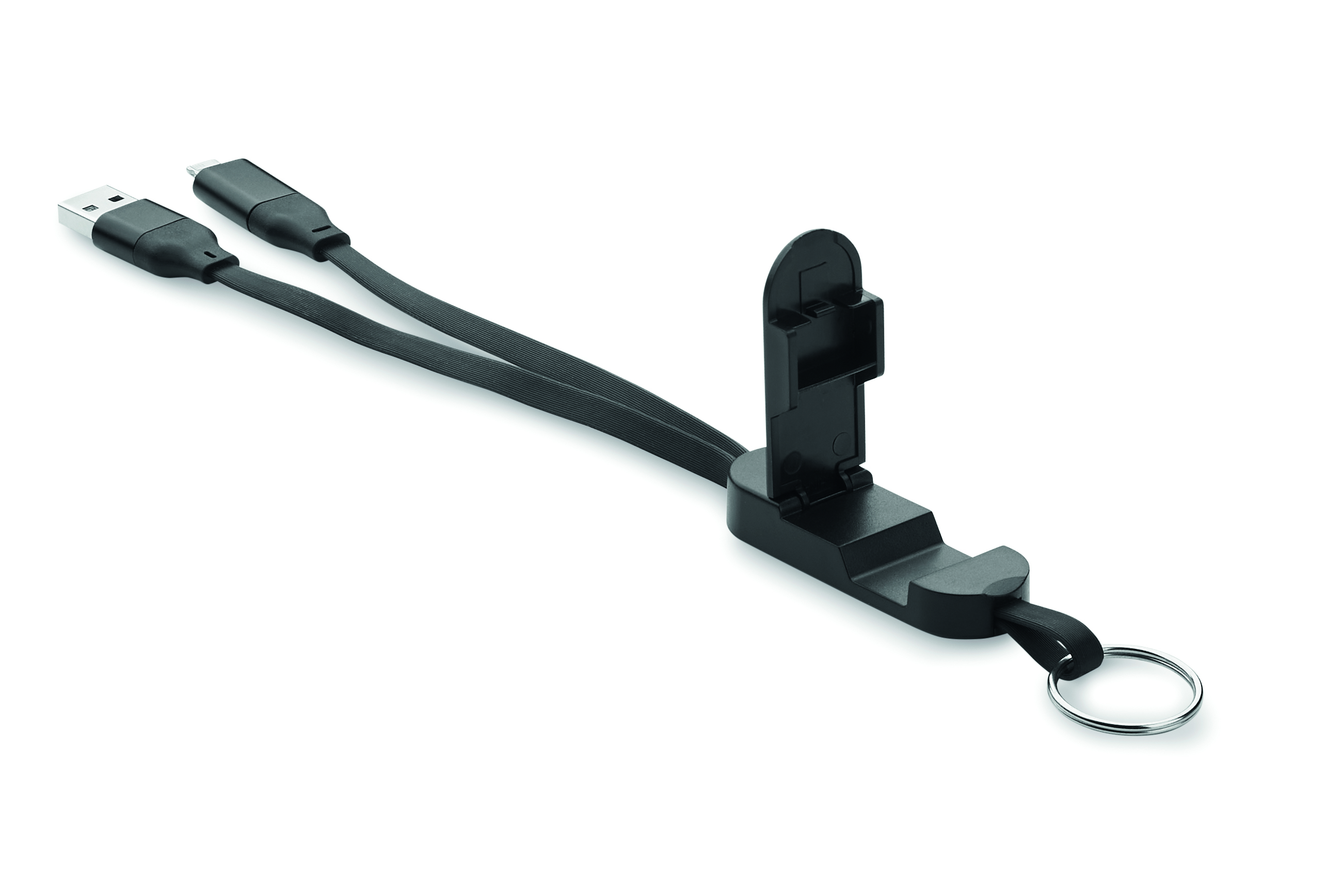 Kabel o mocy 60 W w obudowie z recyklingowanego ABS z brelokiem i podstawką na telefon. Wejście: 2-w-1 Typ-C i Typ-A. Wyjście: Typ-C i micro-B (2 w 1 pin). Długość kabla: 26 cm.