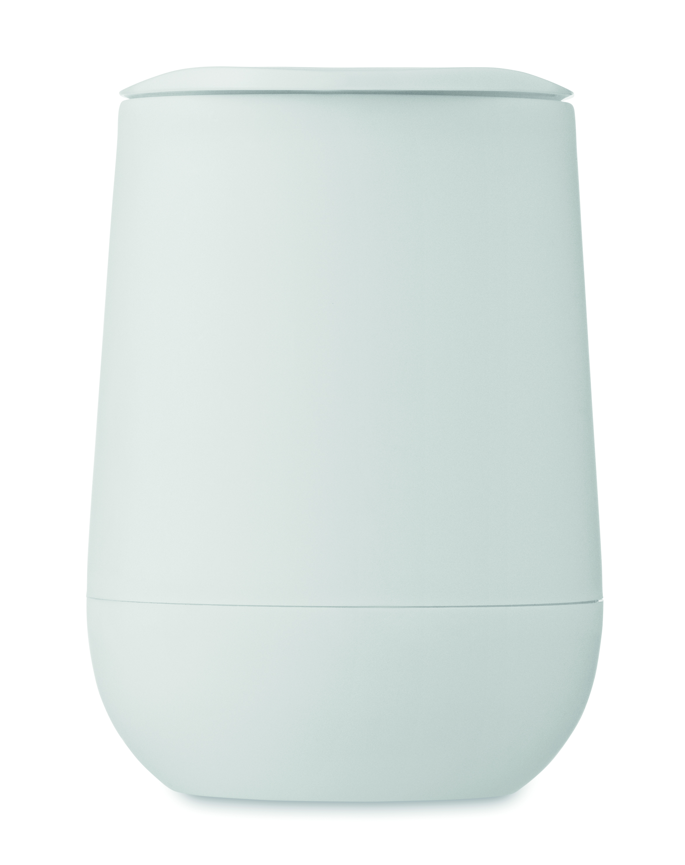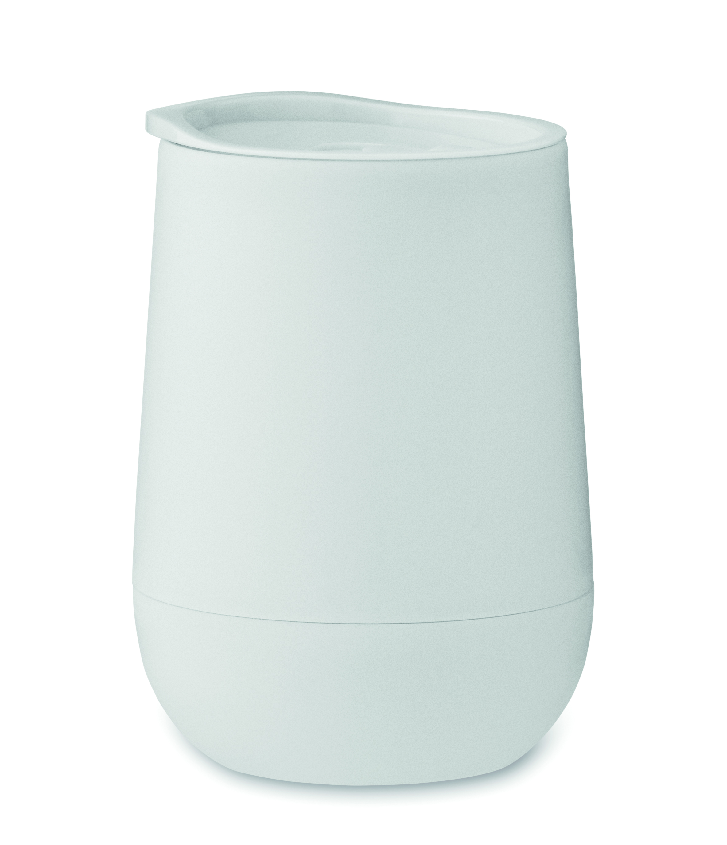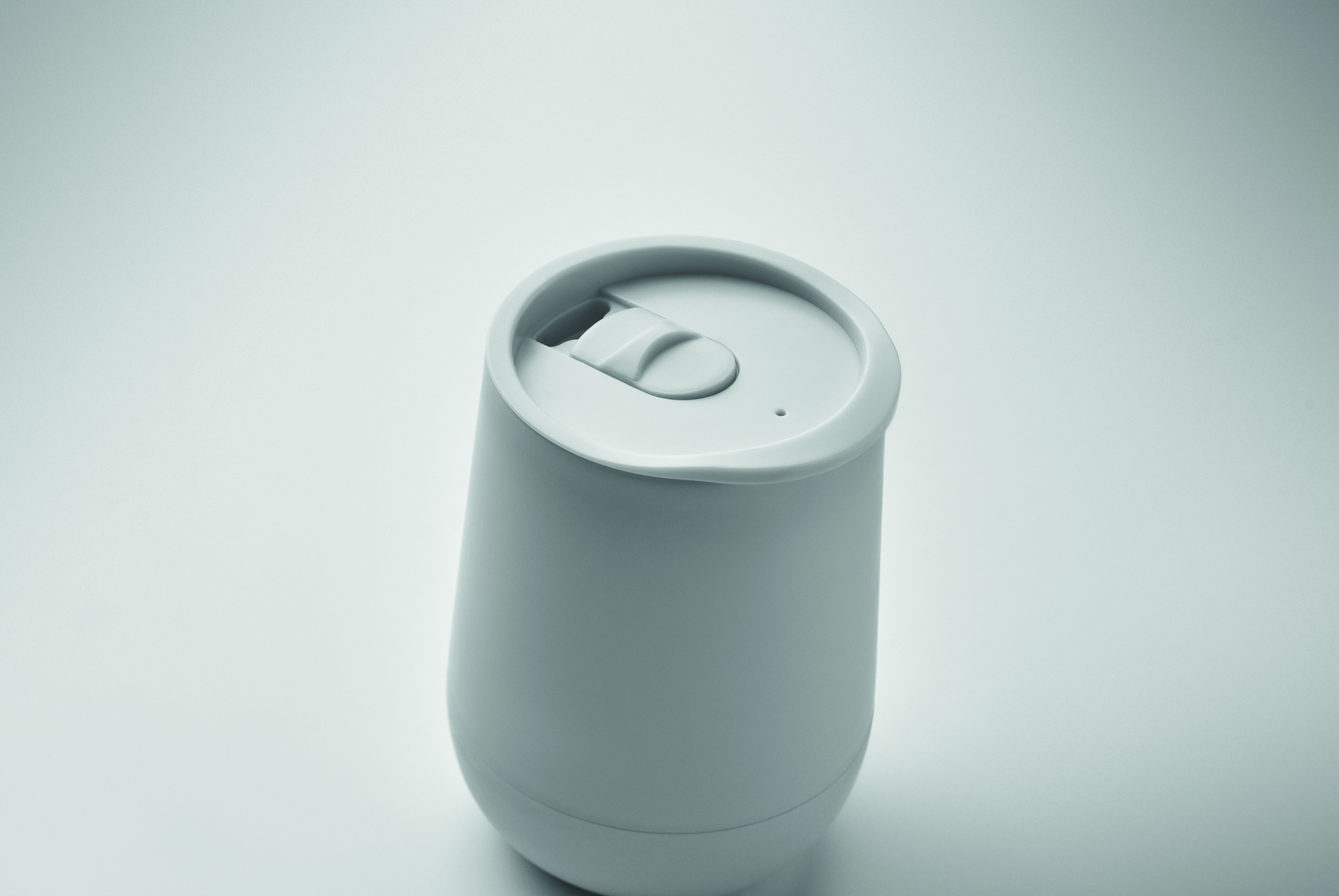 Kubek o podwójnych ściankach z PP z zamykaną pokrywką z ustnikiem z PS i ABS. Pojemność: 300 ml.