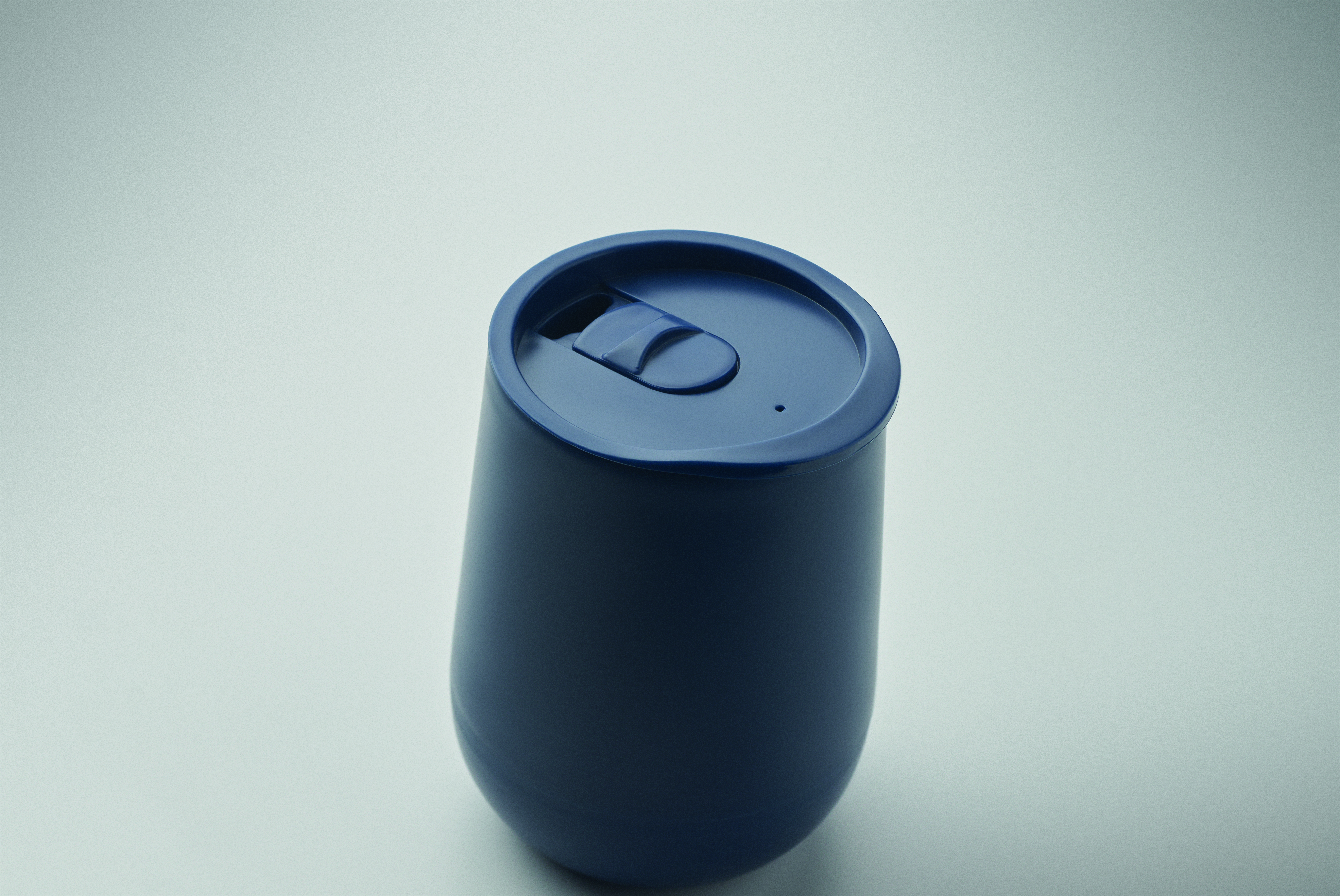 Kubek o podwójnych ściankach z PP z zamykaną pokrywką z ustnikiem z PS i ABS. Pojemność: 300 ml.